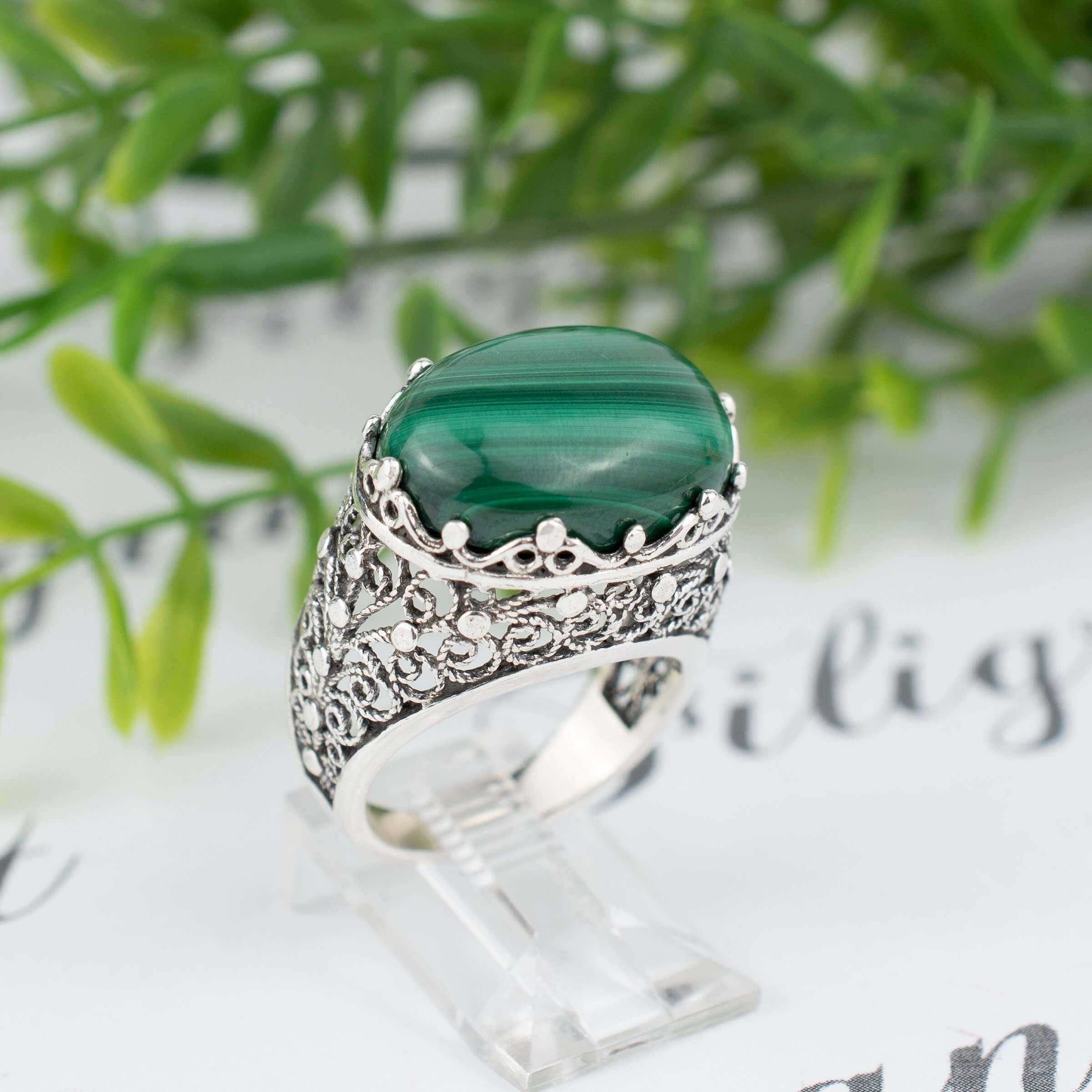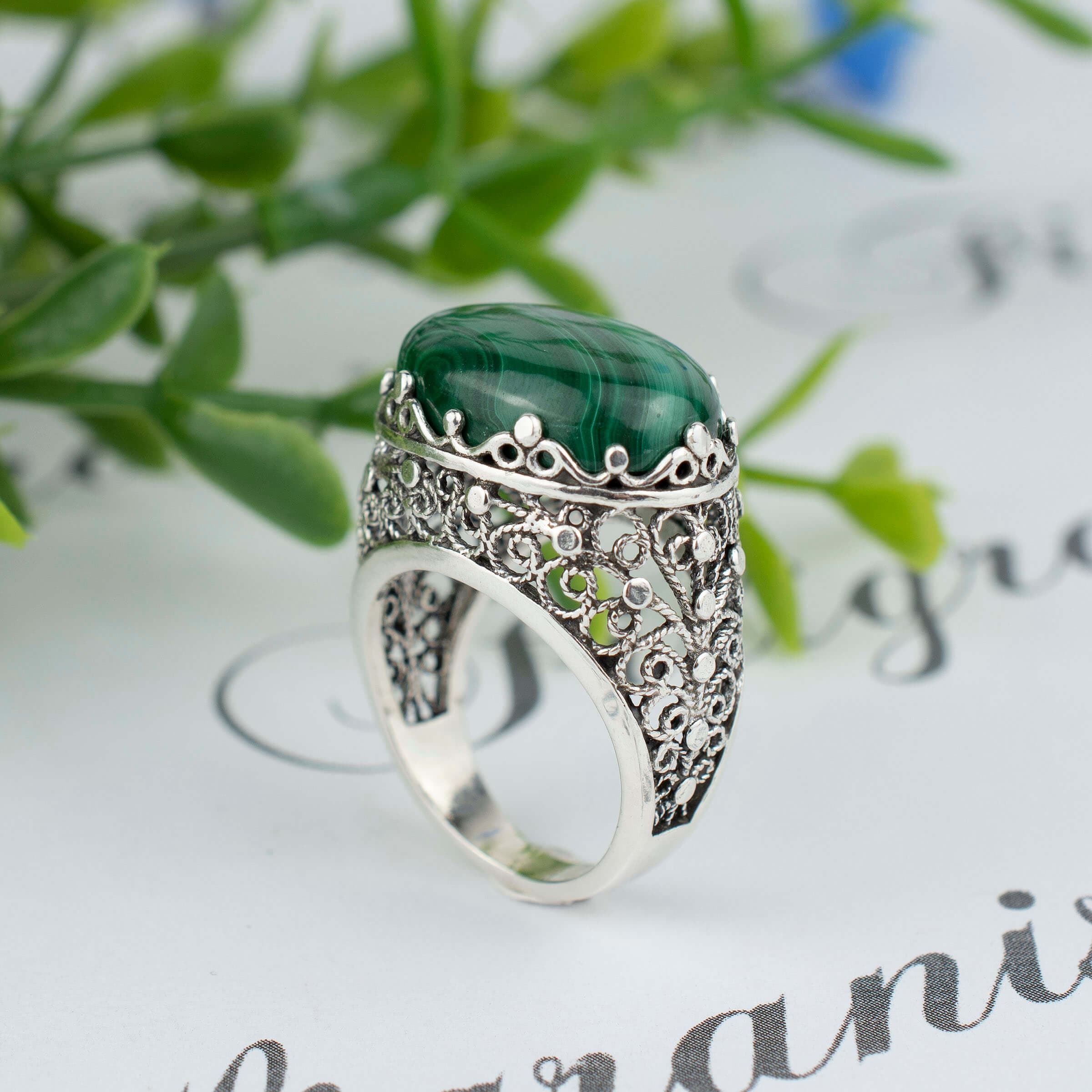 Looking for a unique and breathtaking gift for a special occasion? Look no further than our handmade filigree art natural malachite gemstone women's silver bold statement ring. This stunning piece of jewelry features a rare and mesmerizing malachite gemstone set in intricately designed silver filigree. The ring is expertly crafted by skilled artisans and boasts intricate detailing that is sure to impress.