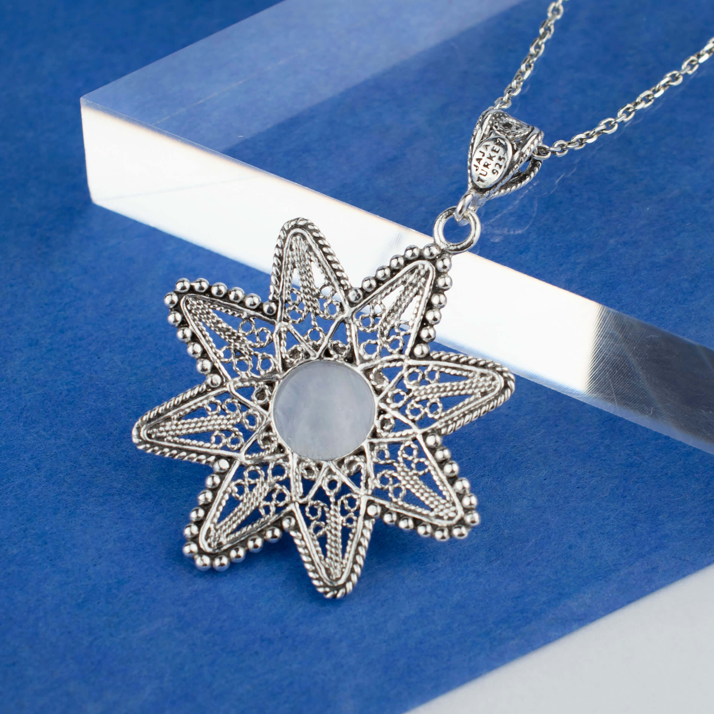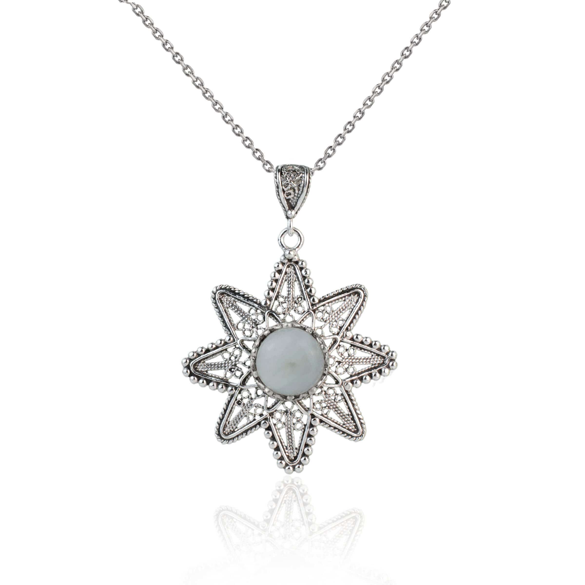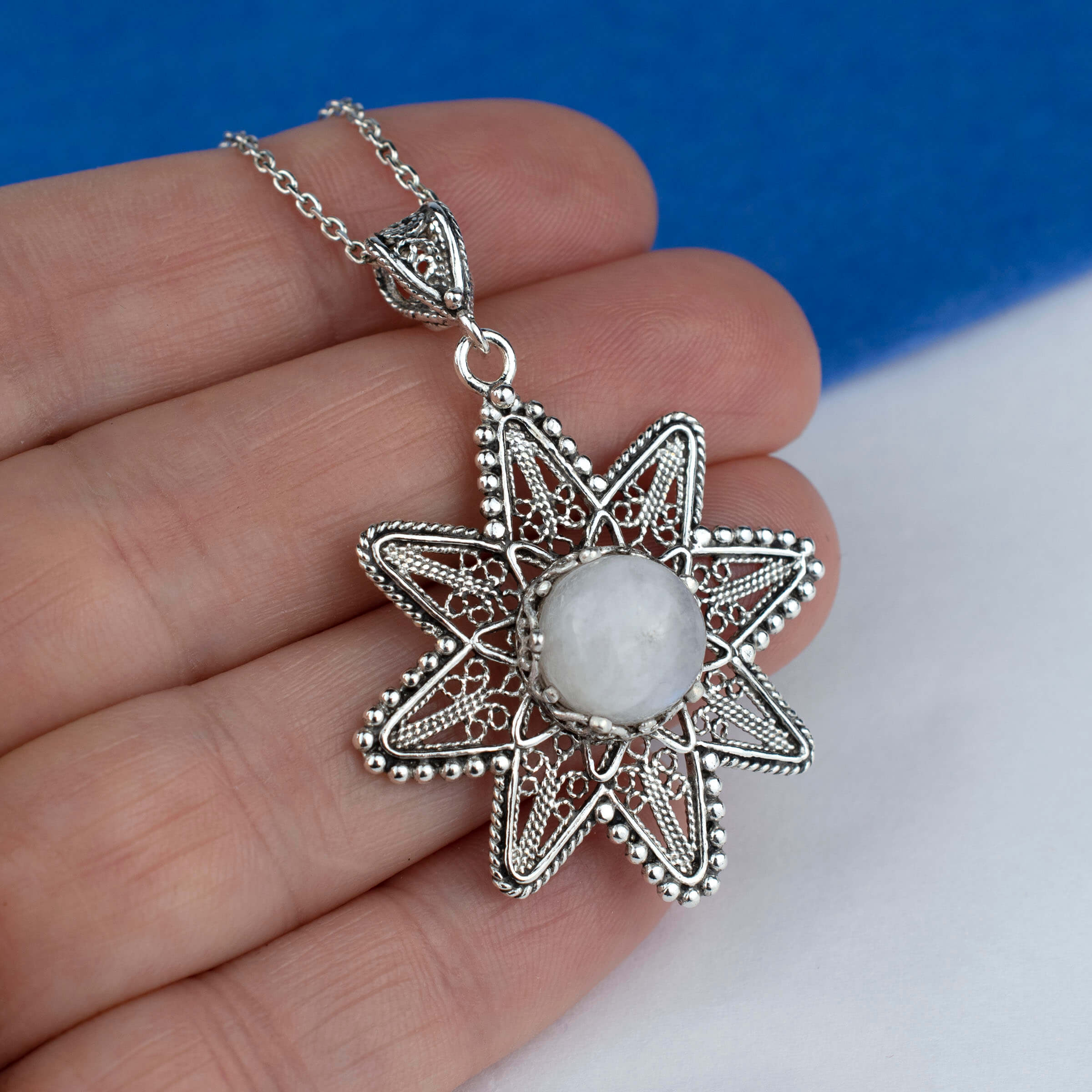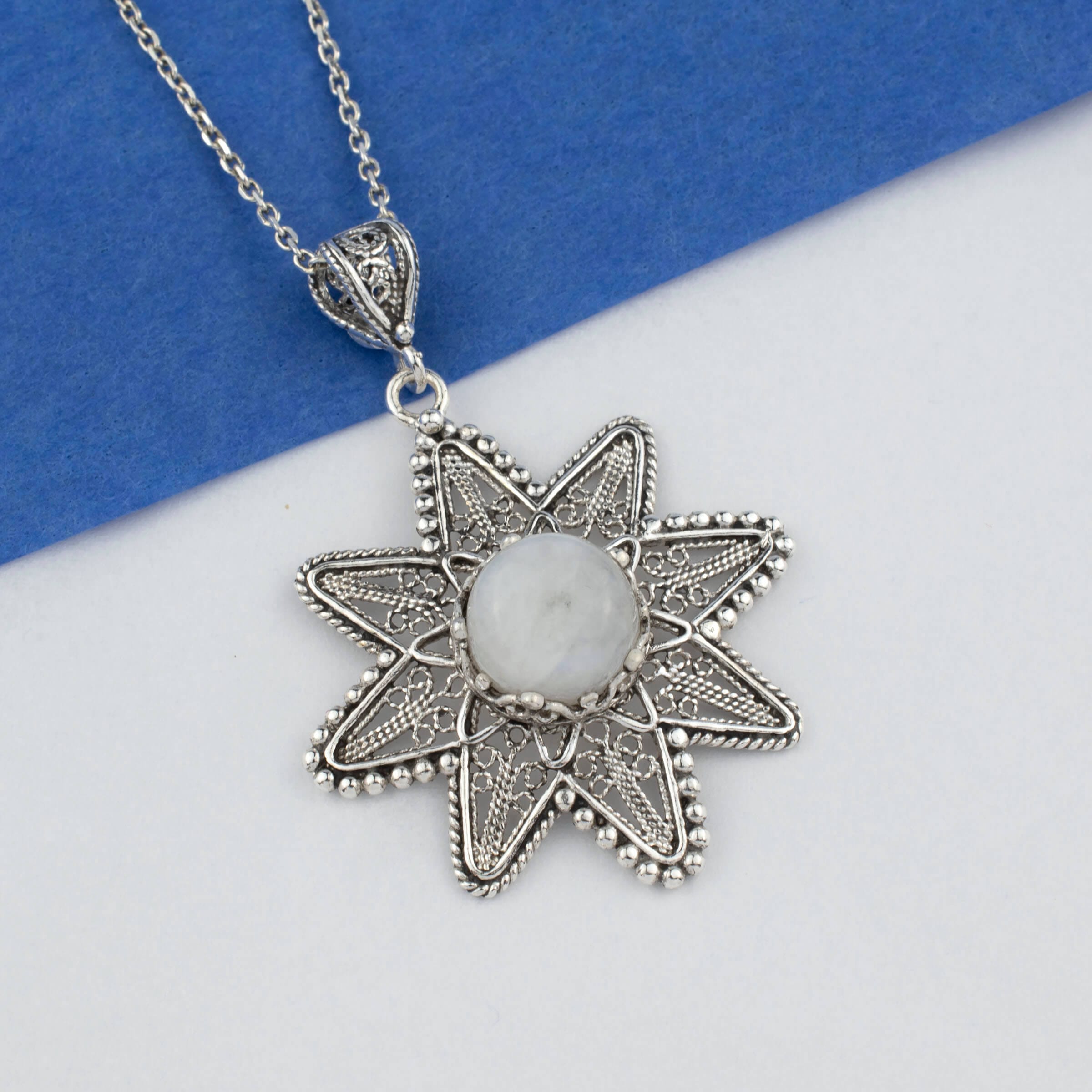 The Filigree Art Moonstone Gemstone Sunflower Design Women Silver Pendant is a breathtaking piece of jewelry that combines elegance and artistry. Crafted from high-quality sterling silver, this pendant showcases a beautiful sunflower design that is both timeless and modern. The intricate filigree work adds a delicate touch, making it a perfect accessory for any outfit.