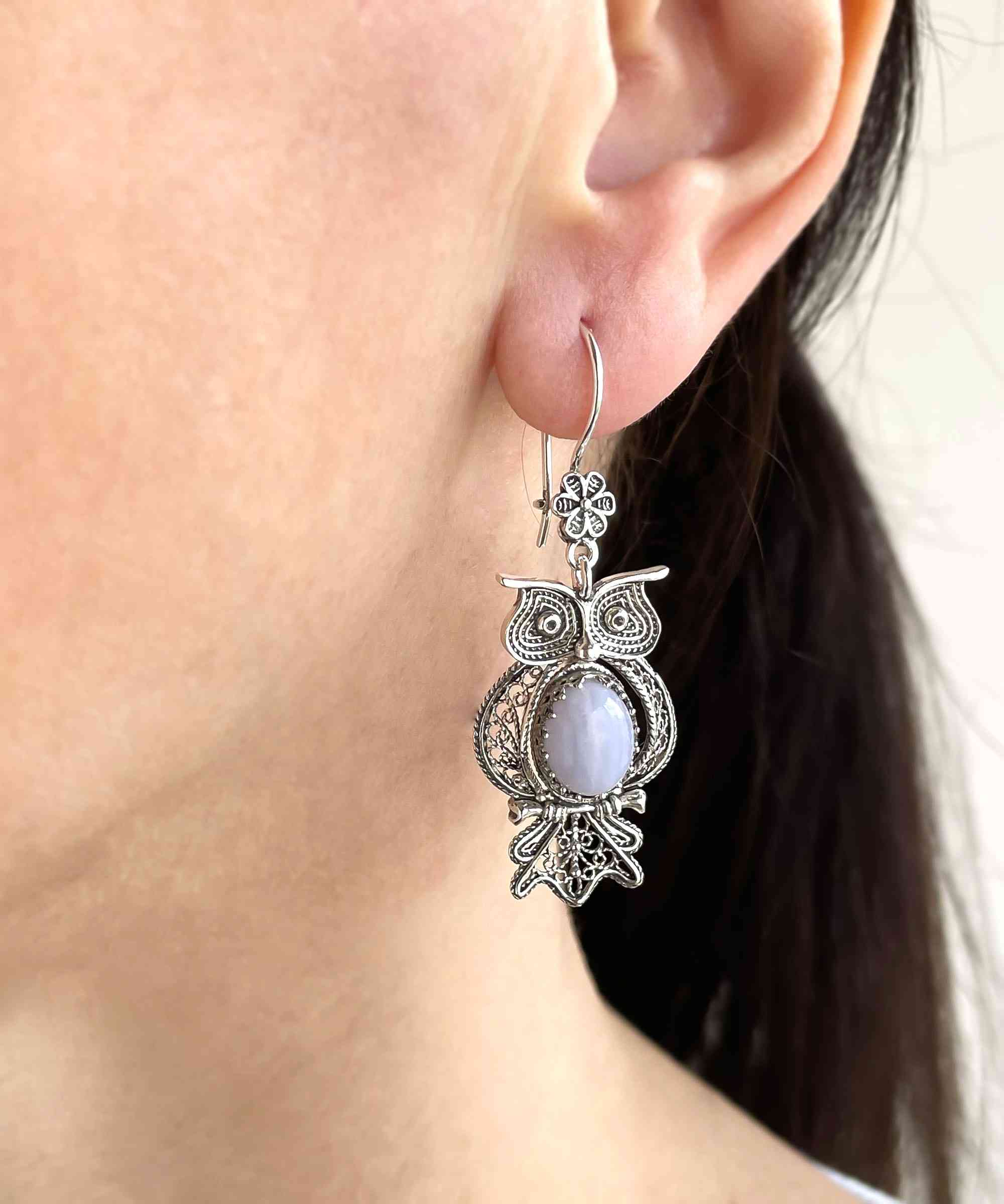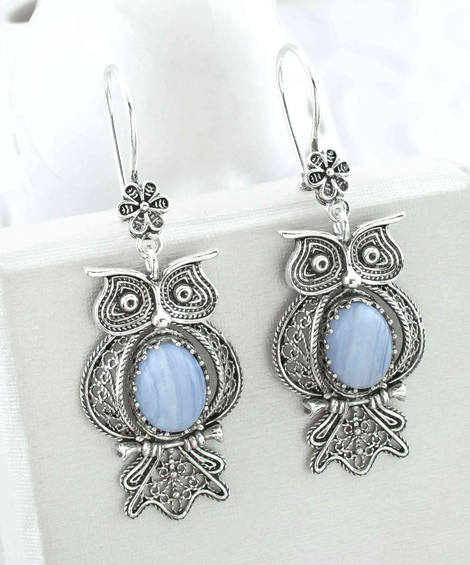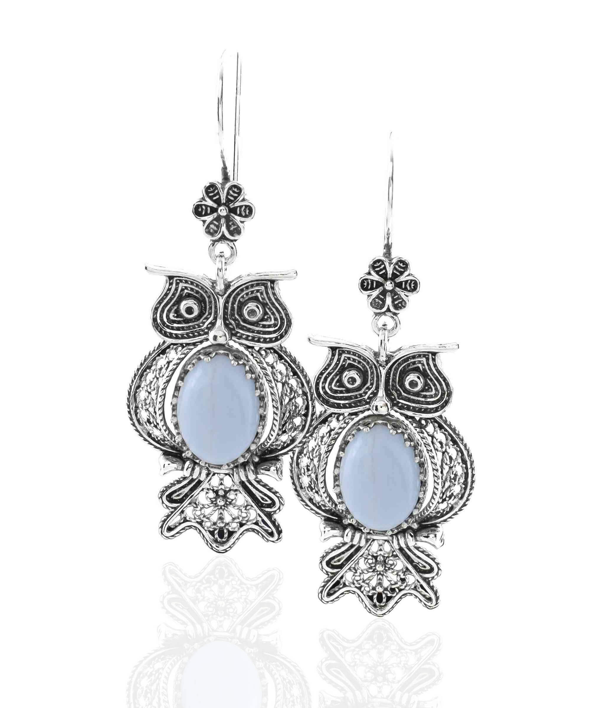 Introducing our stunning Filigree Art Owl Figured Blue Lace Agate Gemstone Women Silver Dangle Earrings, a perfect blend of elegance and artistry. These earrings are crafted from high-quality 925 sterling silver, showcasing intricate filigree details that are meticulously handcrafted by skilled artisans. The centerpiece of these earrings is a beautiful Blue Lace Agate gemstone, measuring 8x10 mm in an oval cabochon cut, which adds a touch of sophistication to any outfit.