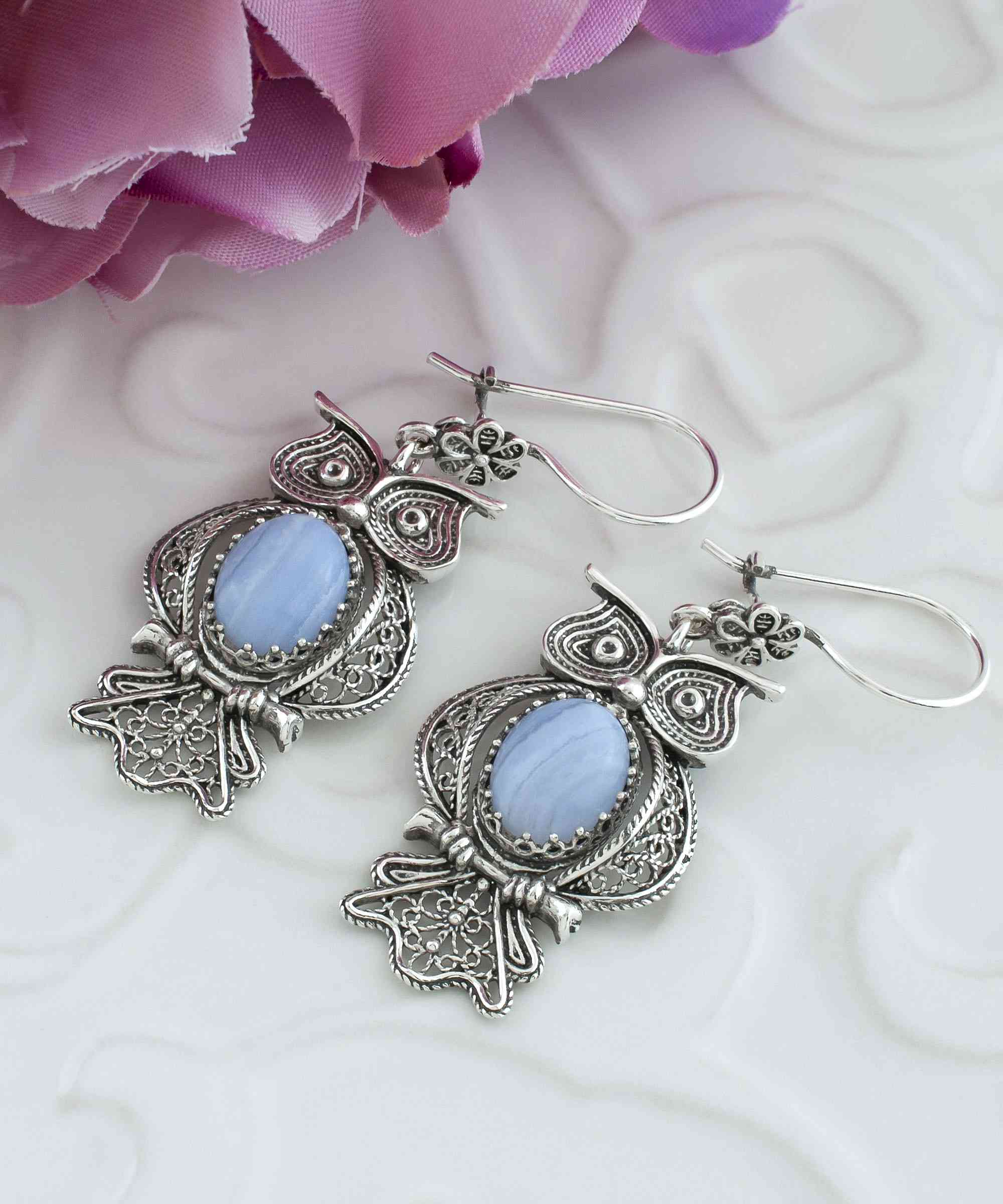 Pair these exquisite earrings with traditional cultural attire for a complete look that celebrates heritage and craftsmanship. Alternatively, they can be worn with casual outfits to add a touch of elegance and personality. The Blue Lace Agate gemstone is known for its calming properties, making these earrings not only a fashion statement but also a source of tranquility.