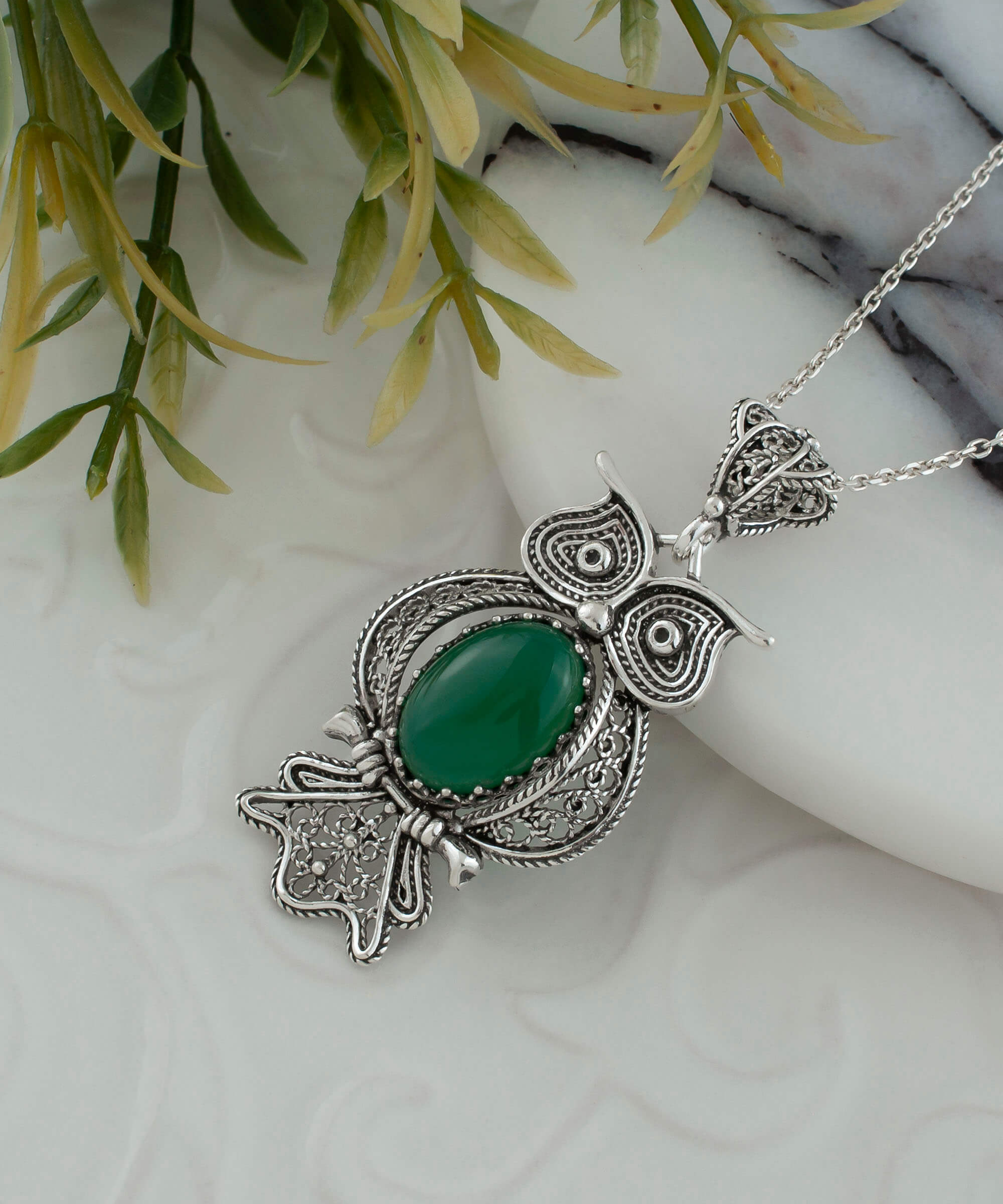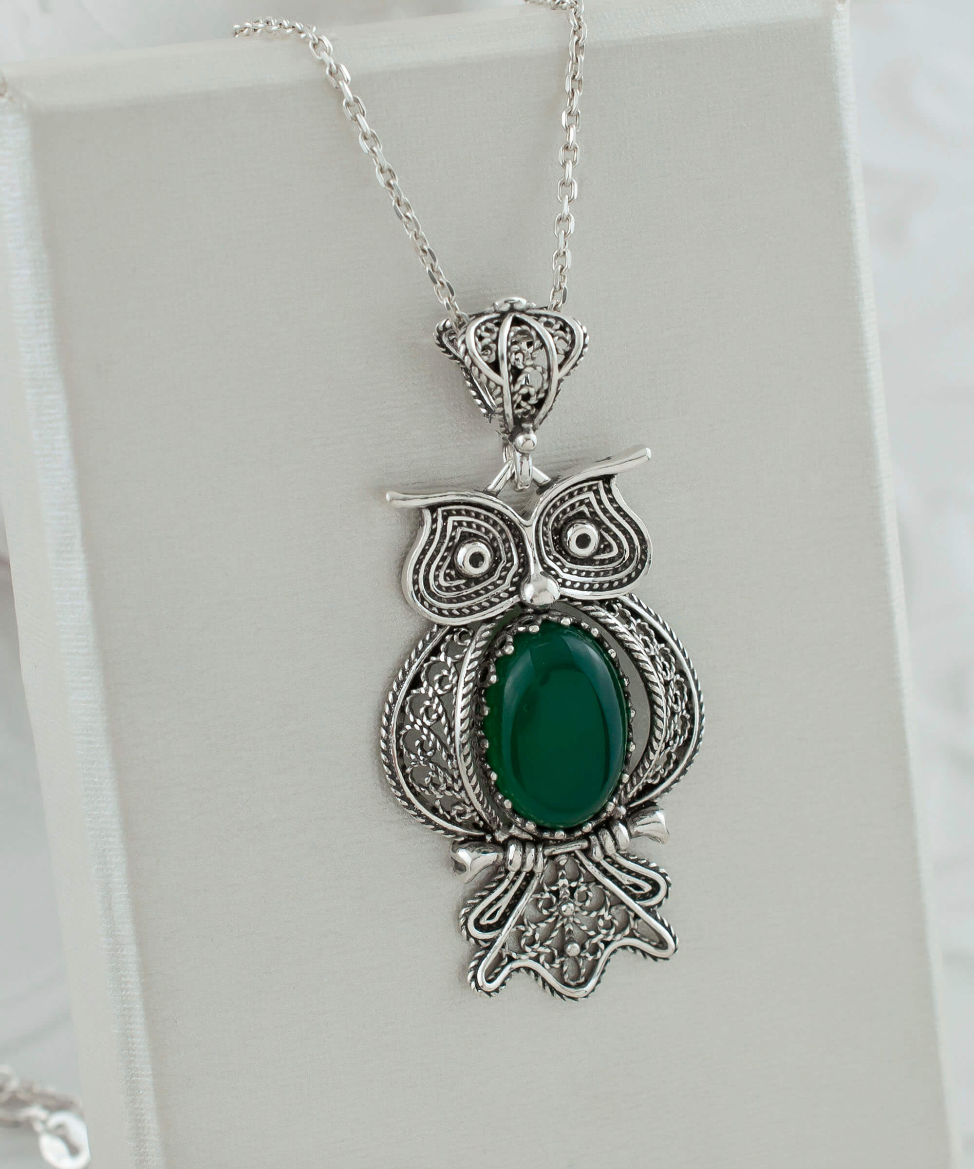 In conclusion, the Filigree Art Owl Figured Green Agate Gemstone Women Silver Pendant is a perfect blend of elegance, symbolism, and craftsmanship. Whether you are treating yourself or looking for a special gift, this pendant is sure to impress. Its unique design and high-quality materials make it a standout piece that will be treasured for years to come.