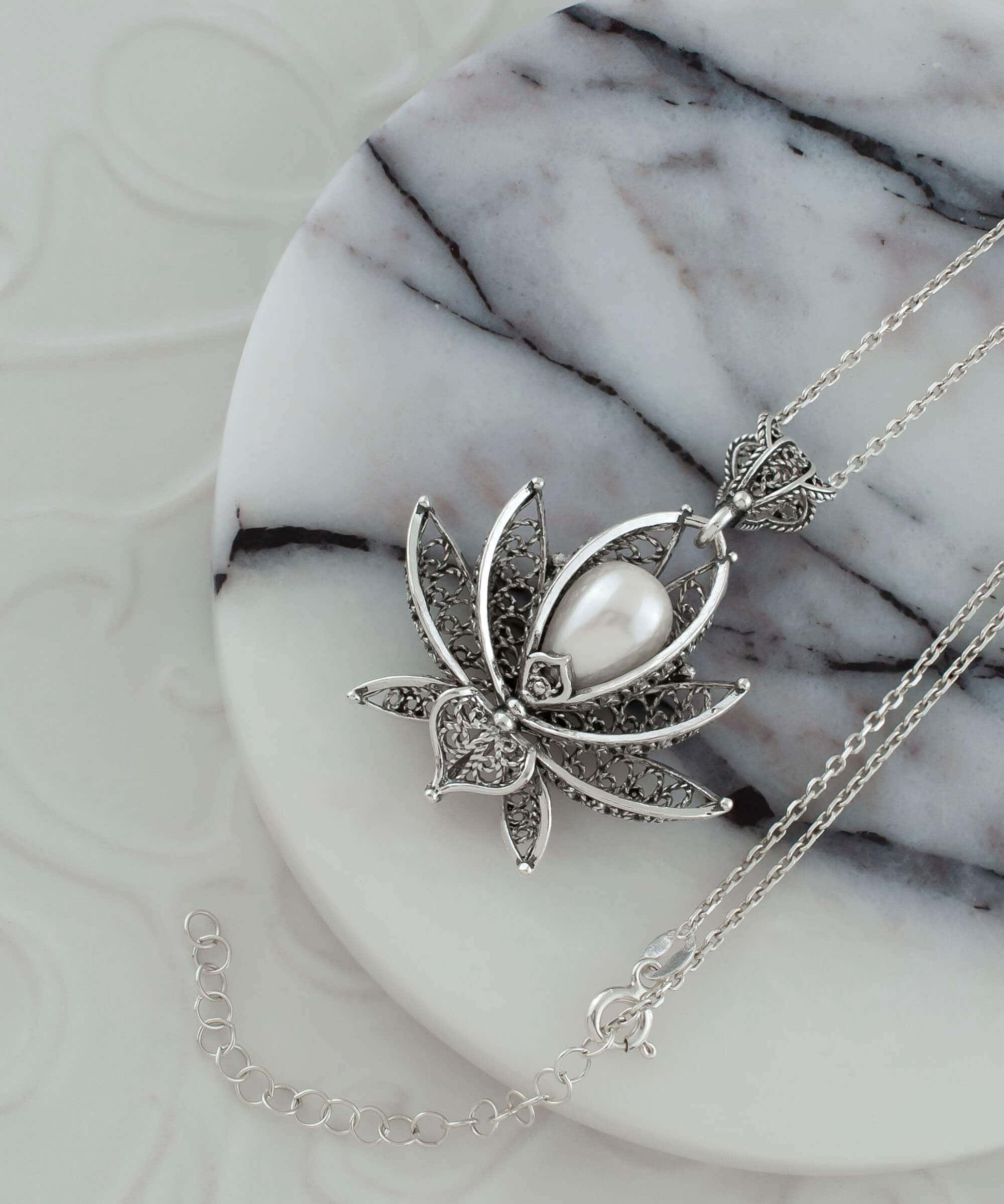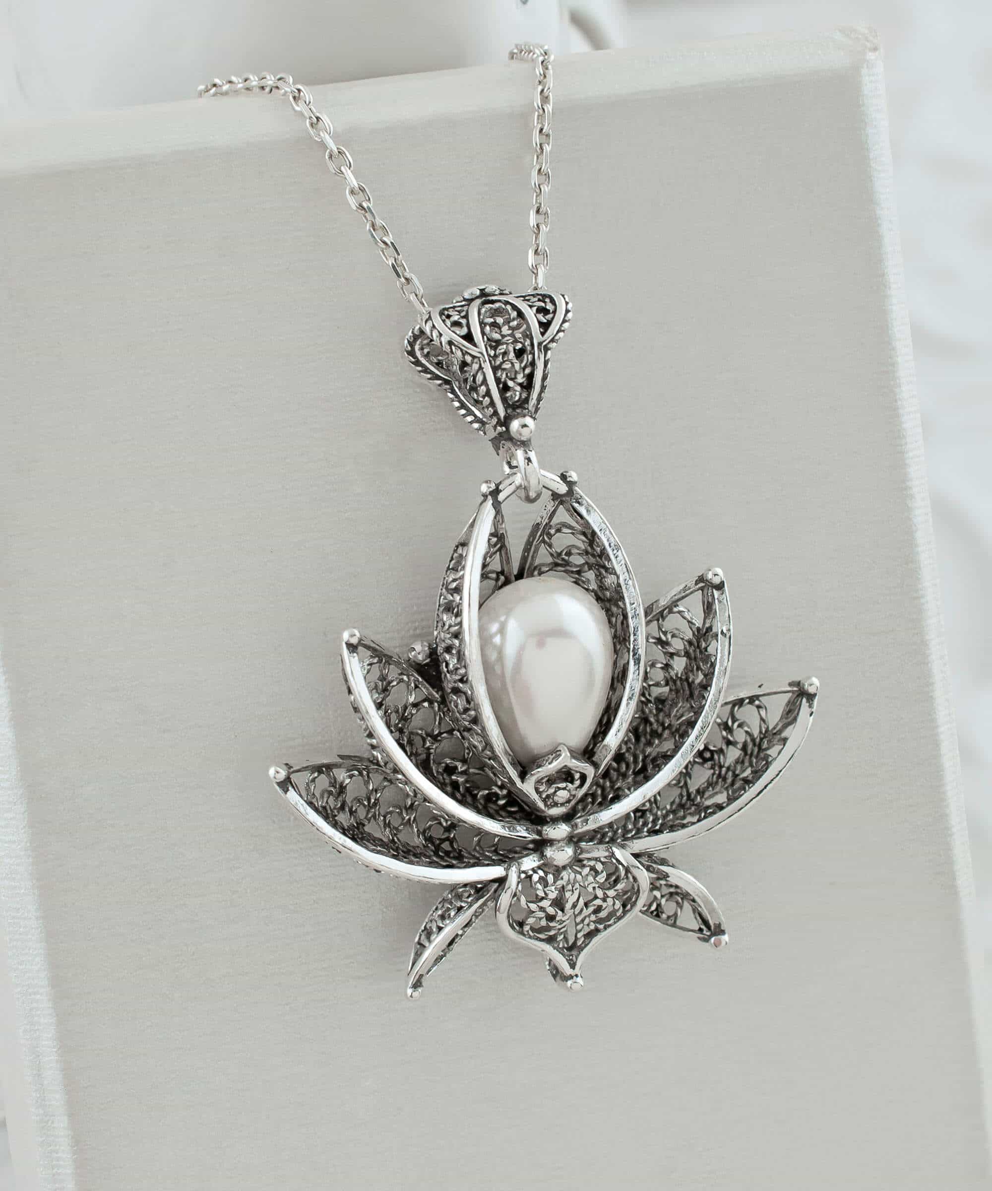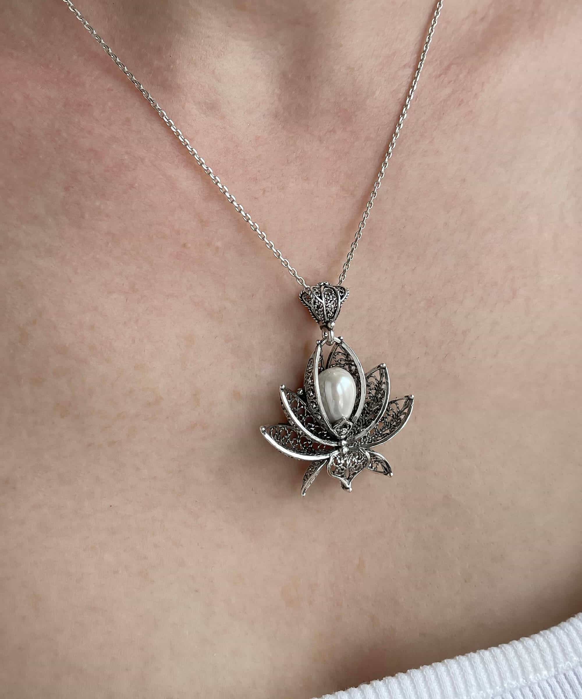 A beautifully crafted 3D lotus flower pendant made of 925 Sterling Silver with a cultured freshwater pearl, showcasing intricate filigree details.