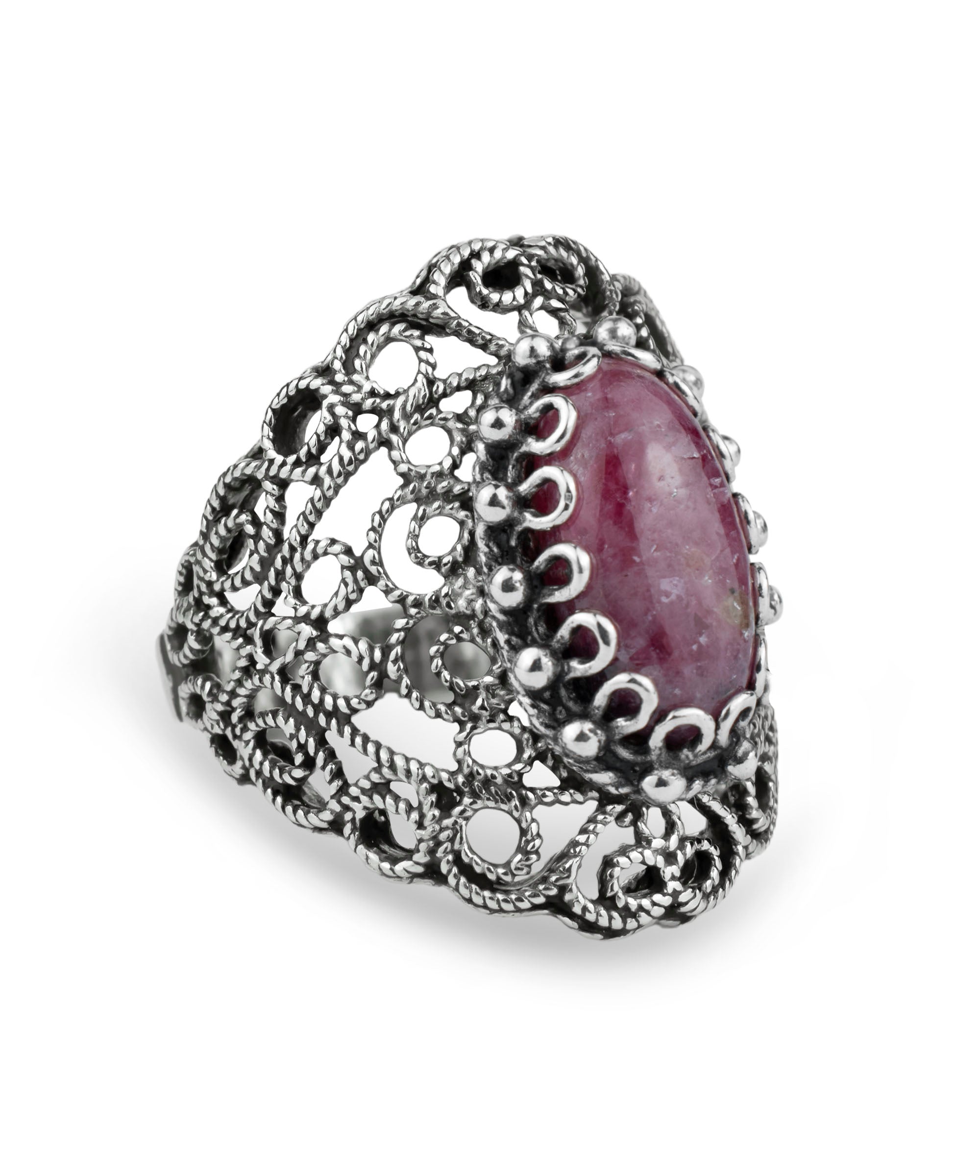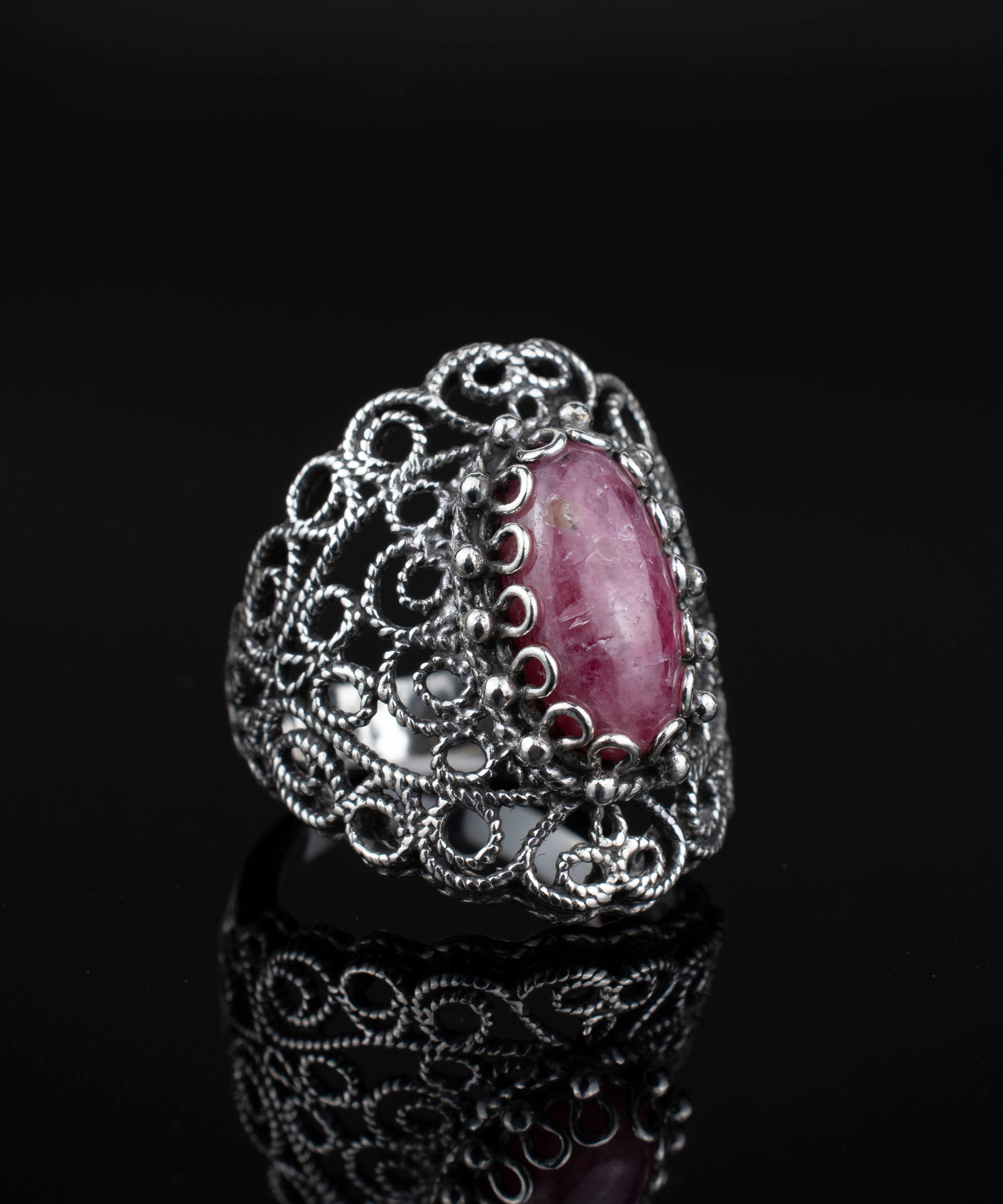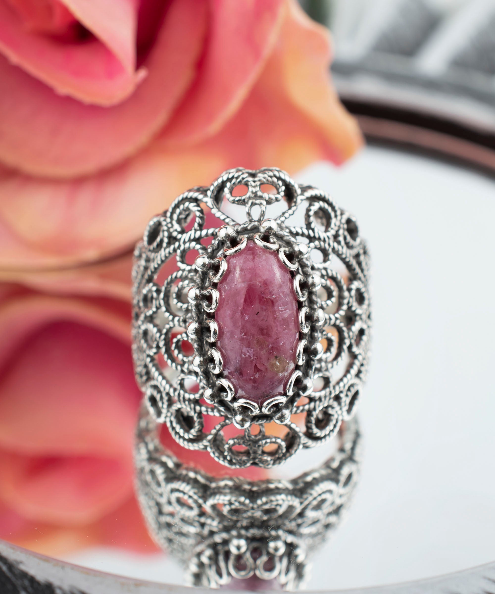 Handmade silver statement ring featuring a pink rhodonite gemstone in intricate filigree lace design, elegantly crafted for women.