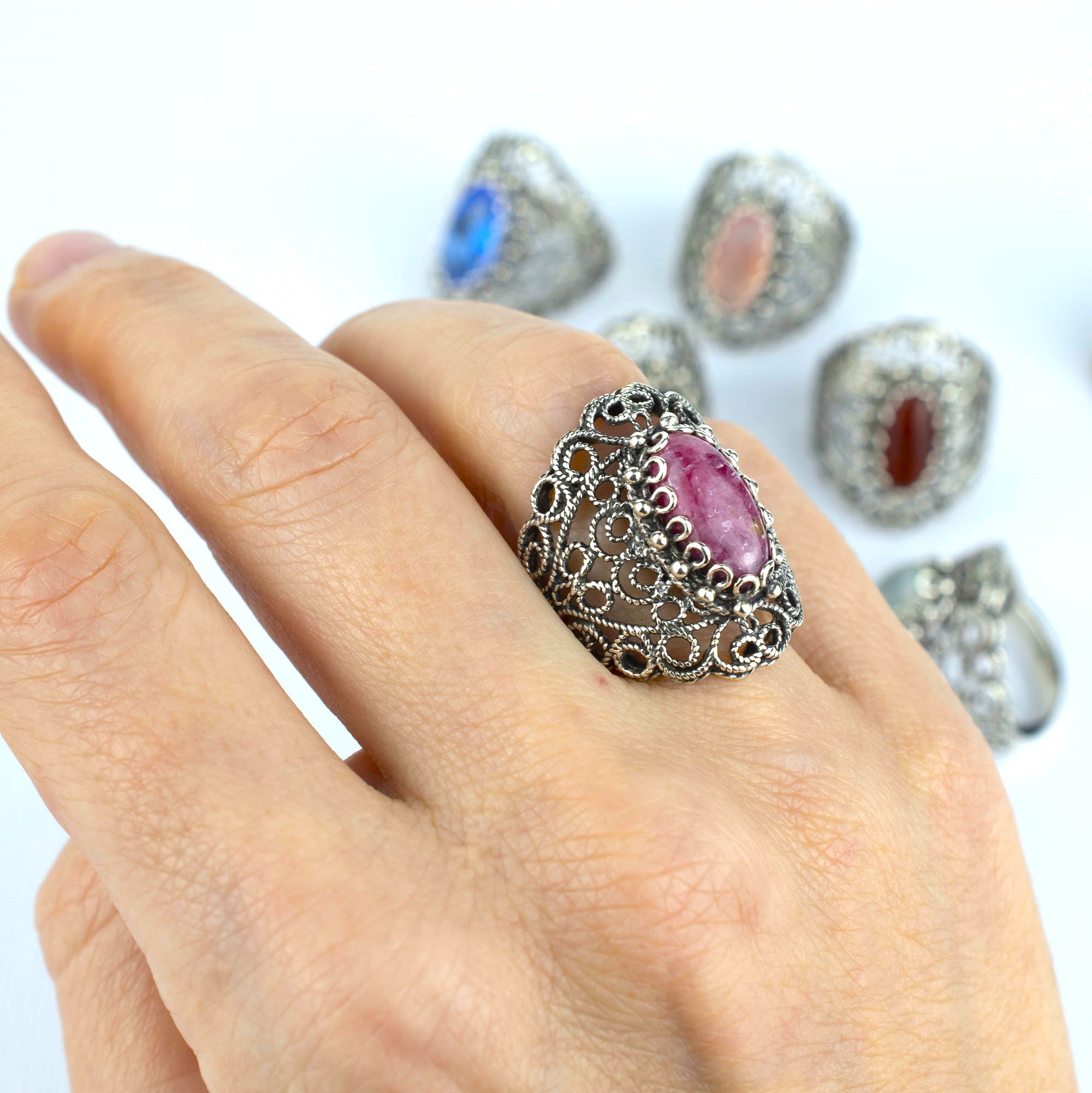Add a touch of elegance to your jewelry collection with the Handmade Filigree Art Rhodonite Gemstone Lace Detailed Women's Silver Statement Ring. This exquisite piece of jewelry is handcrafted by skilled artisans, ensuring that each ring is unique and of the highest quality. The centerpiece of this stunning ring is a beautiful rhodonite gemstone, known for its unique pink hue that adds a touch of femininity and charm to any outfit.
