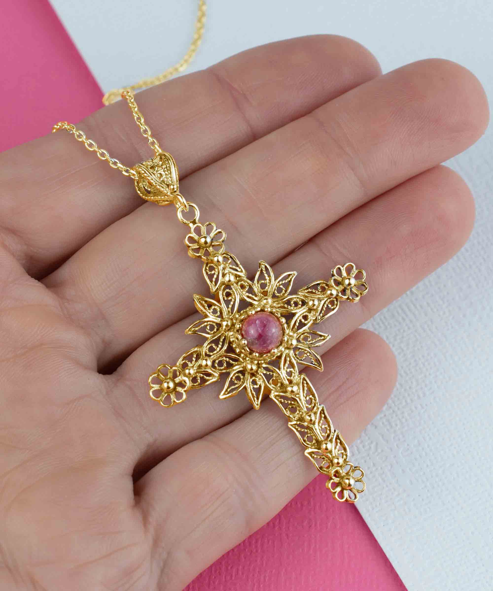 Gold plated silver cross pendant featuring a Rhodonite gemstone with intricate filigree art design.