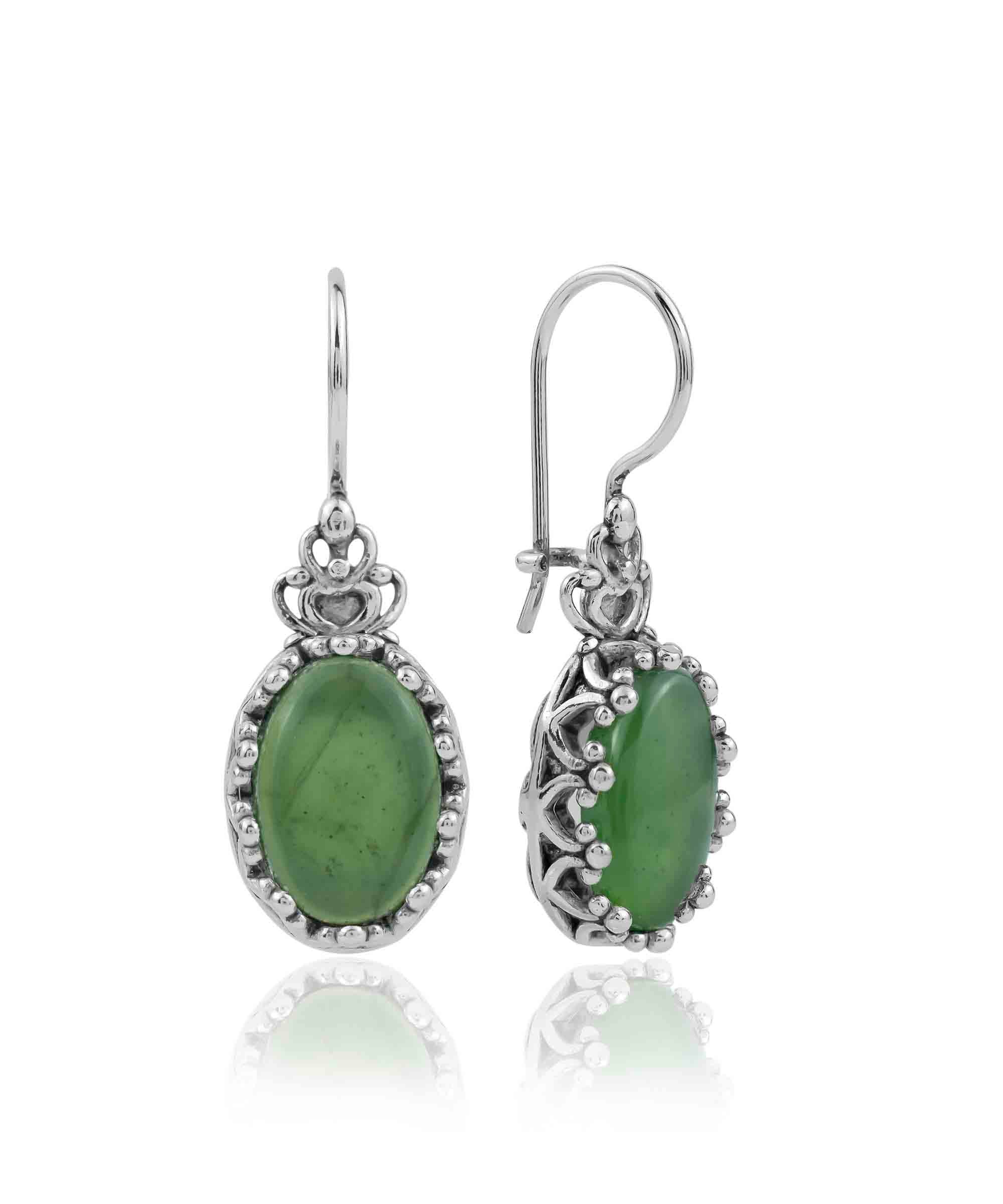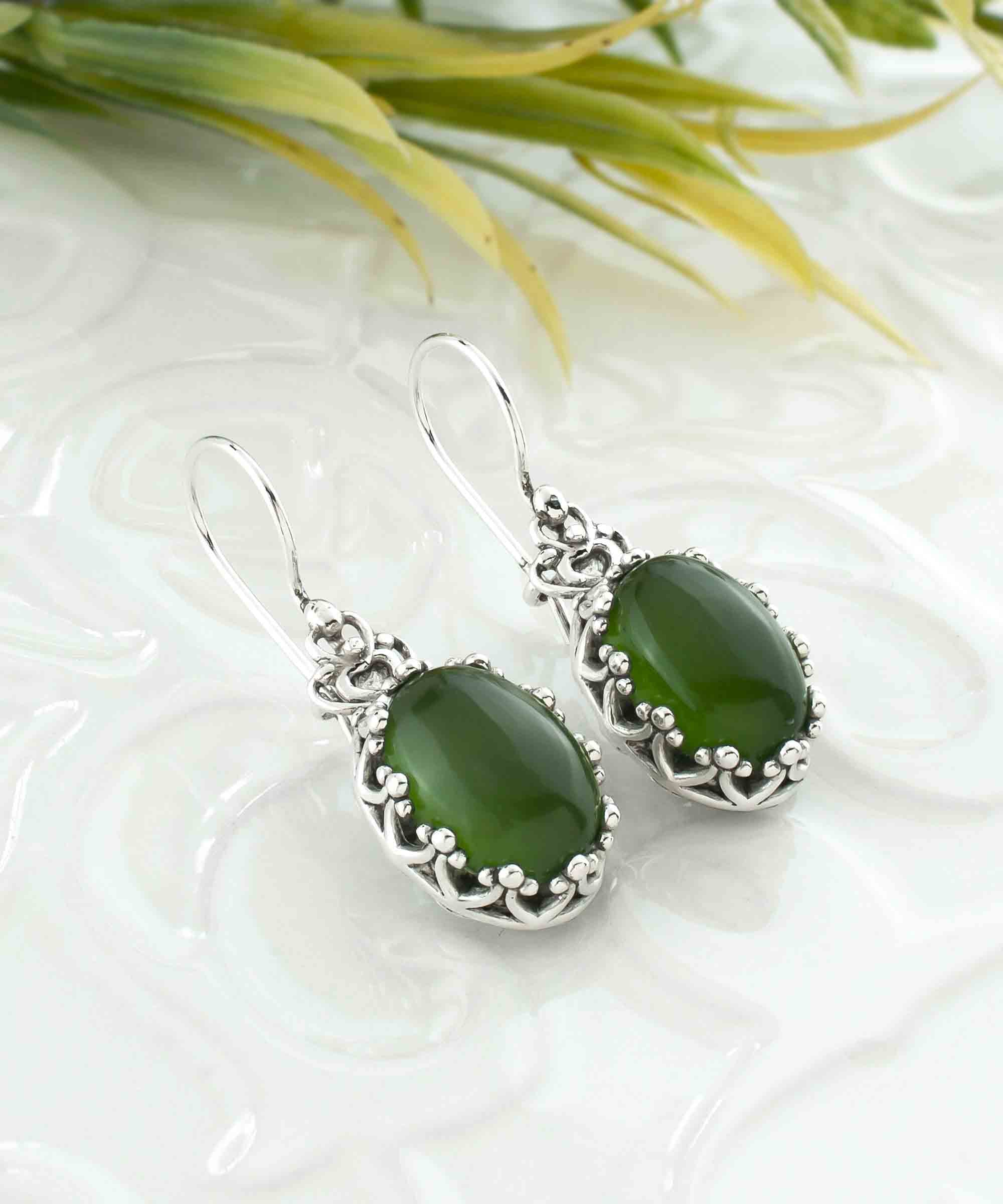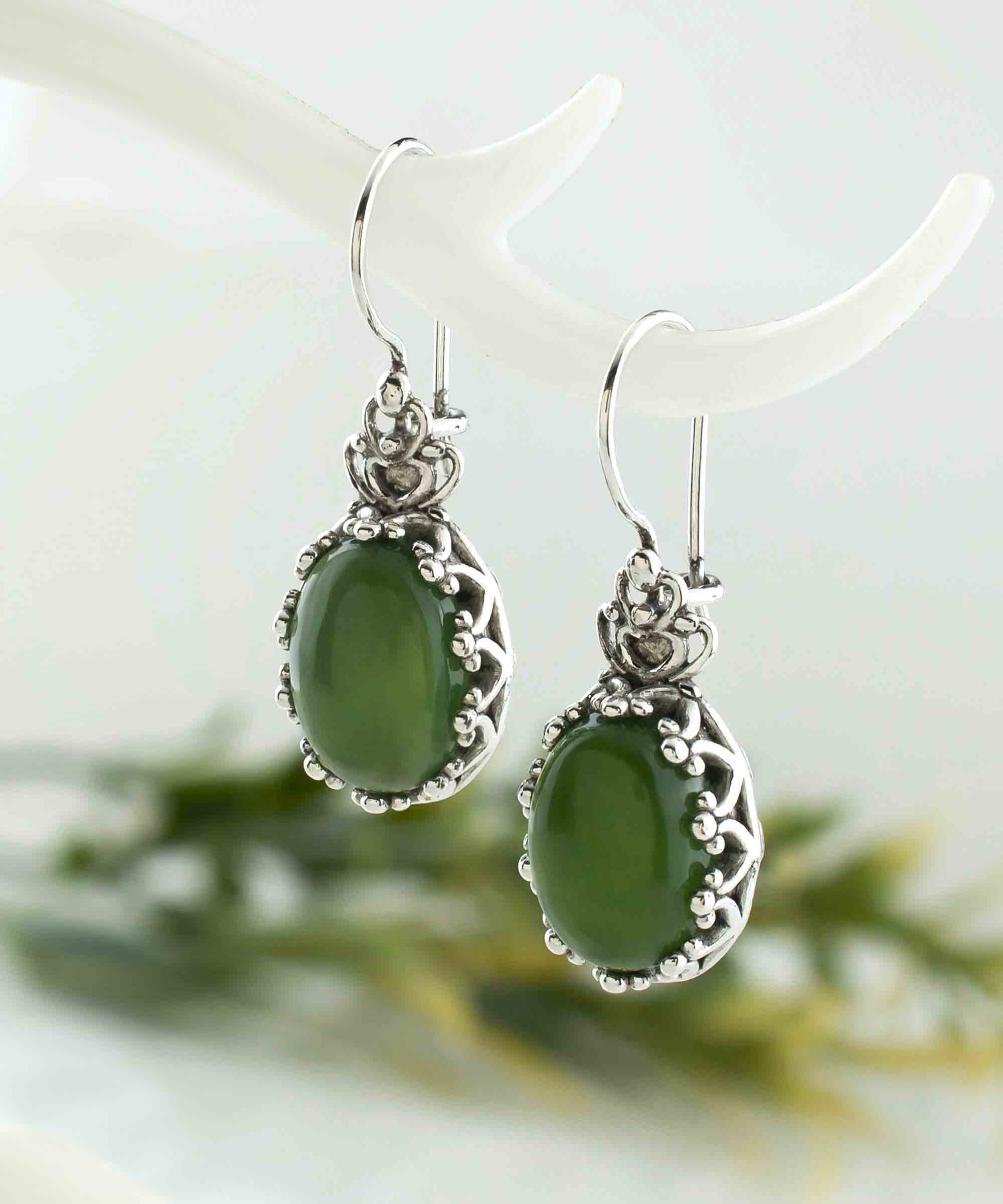 Elegant silver oval drop earrings featuring intricate filigree design and serpentine gemstone, perfect for special occasions.