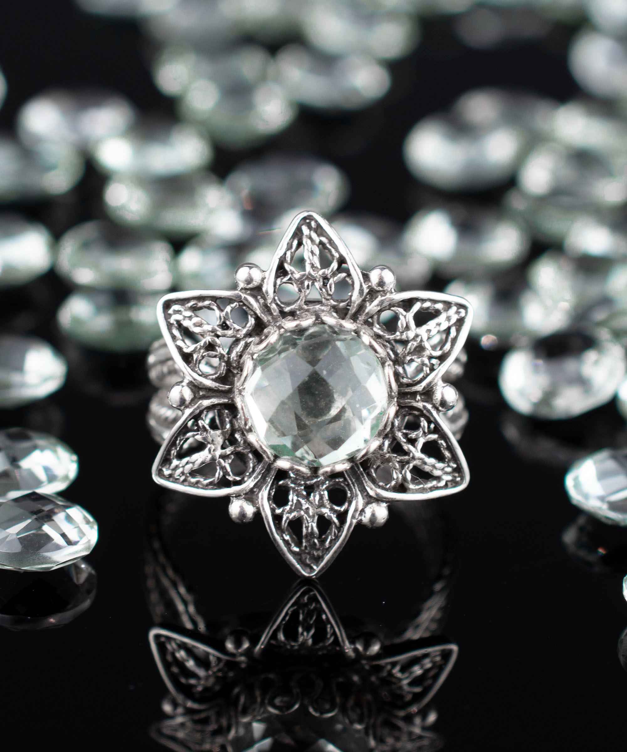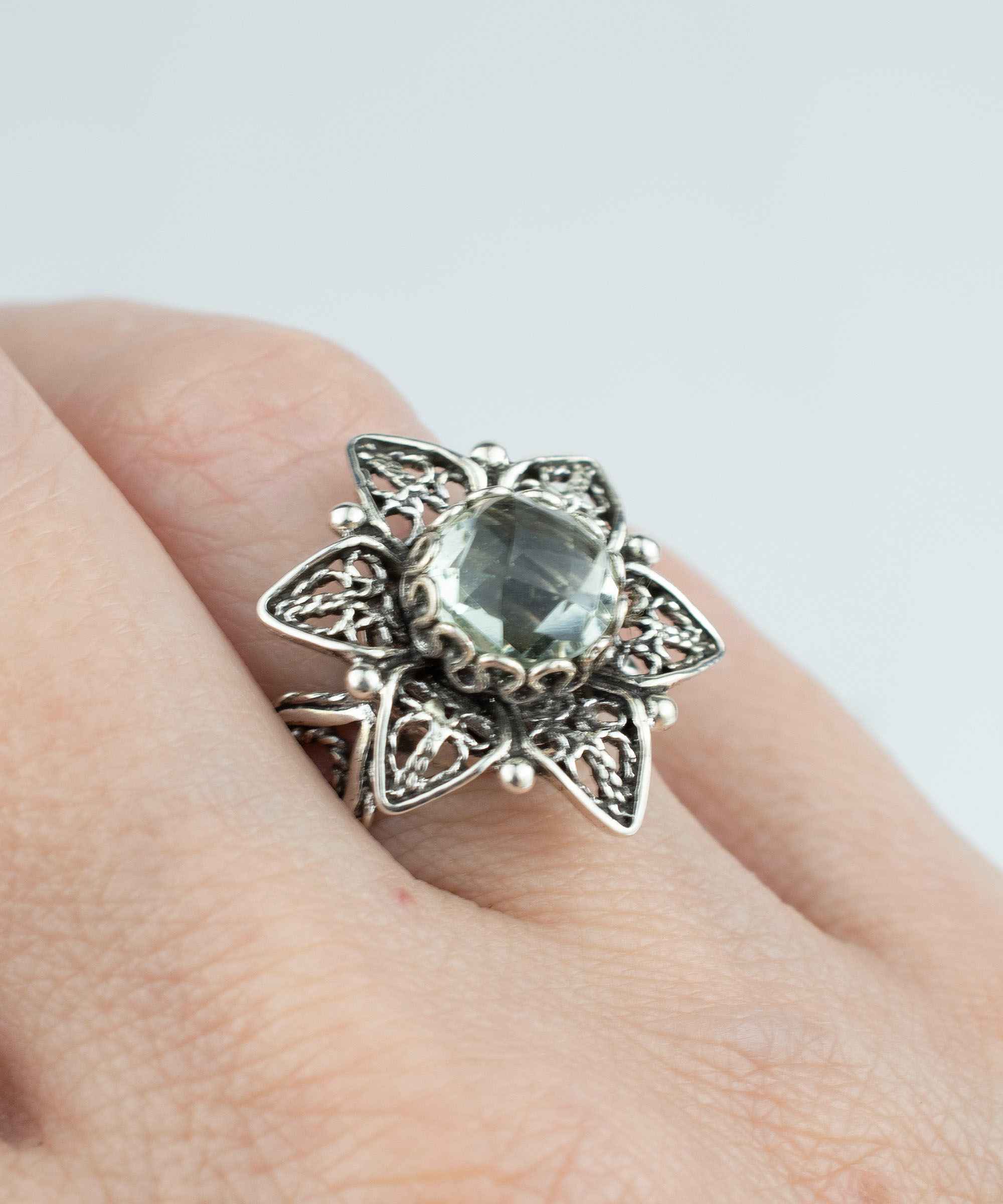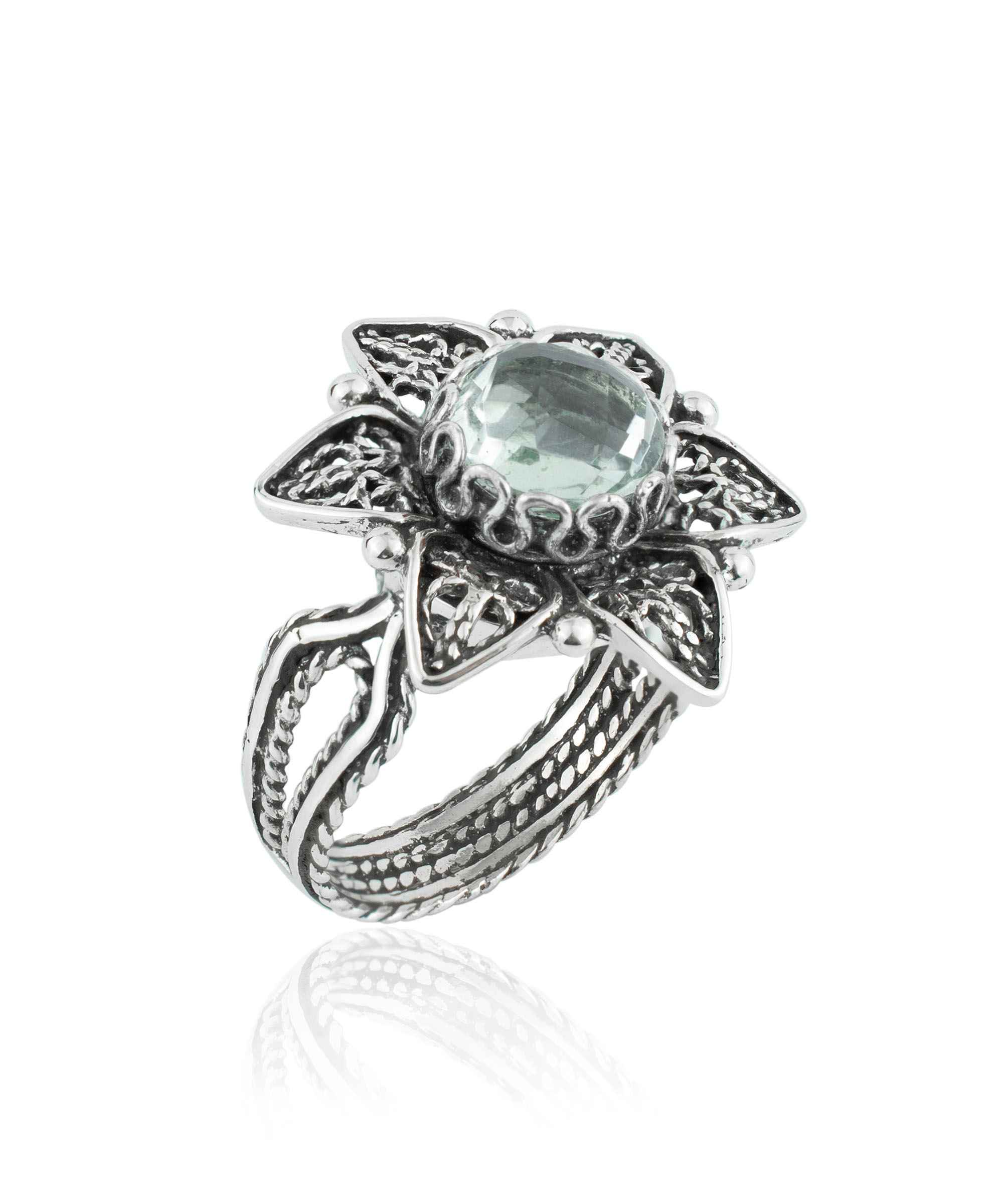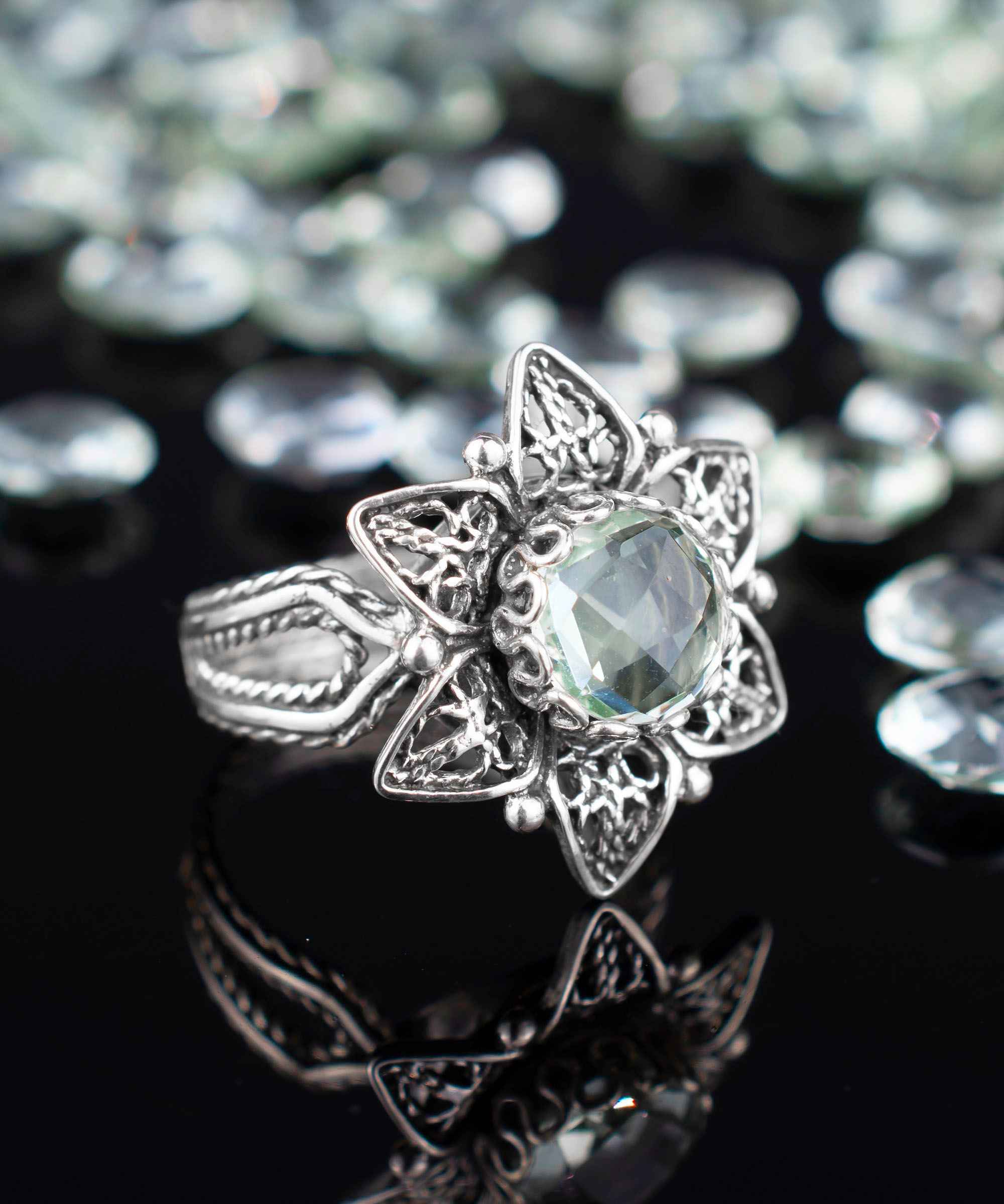 Introducing the exquisite Filigree Art Turquoise Gemstone Daisy Flower Women Silver Cocktail Ring, a stunning piece that combines elegance and versatility. This ring is crafted from high-quality 925 sterling silver and features a beautiful daisy flower design that is perfect for everyday wear or special occasions. The centerpiece of this cocktail ring is an 8 mm round-cut prasiolite gemstone, which has been expertly faceted to enhance its natural beauty and brilliance.