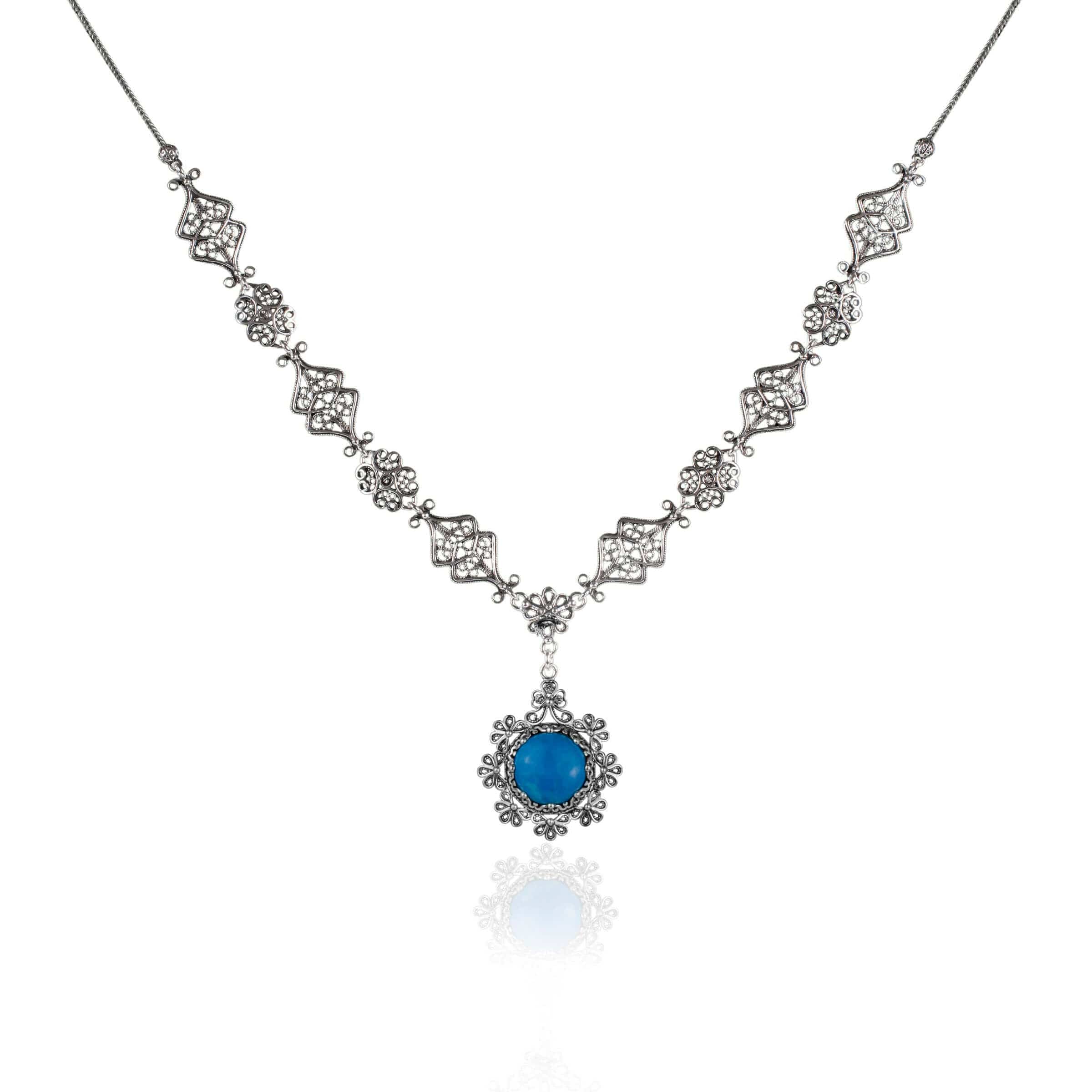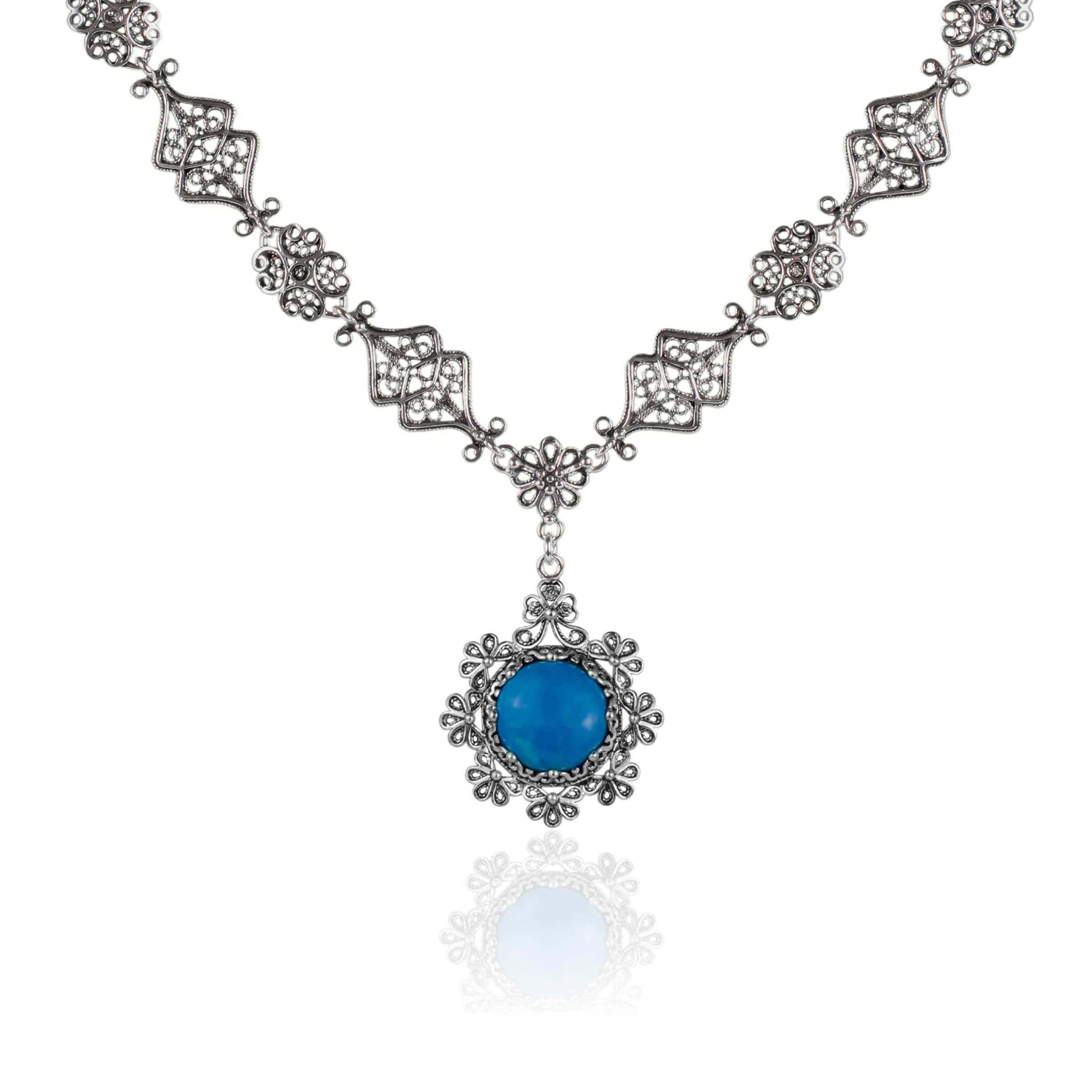 Introducing the exquisite Filigree Art Turquoise Gemstone Women Silver Choker Necklace, a stunning piece of jewelry that combines traditional craftsmanship with modern elegance. Made from high-quality 925 sterling silver, this choker necklace is designed to enhance any outfit, making it a perfect accessory for both casual and formal occasions.
