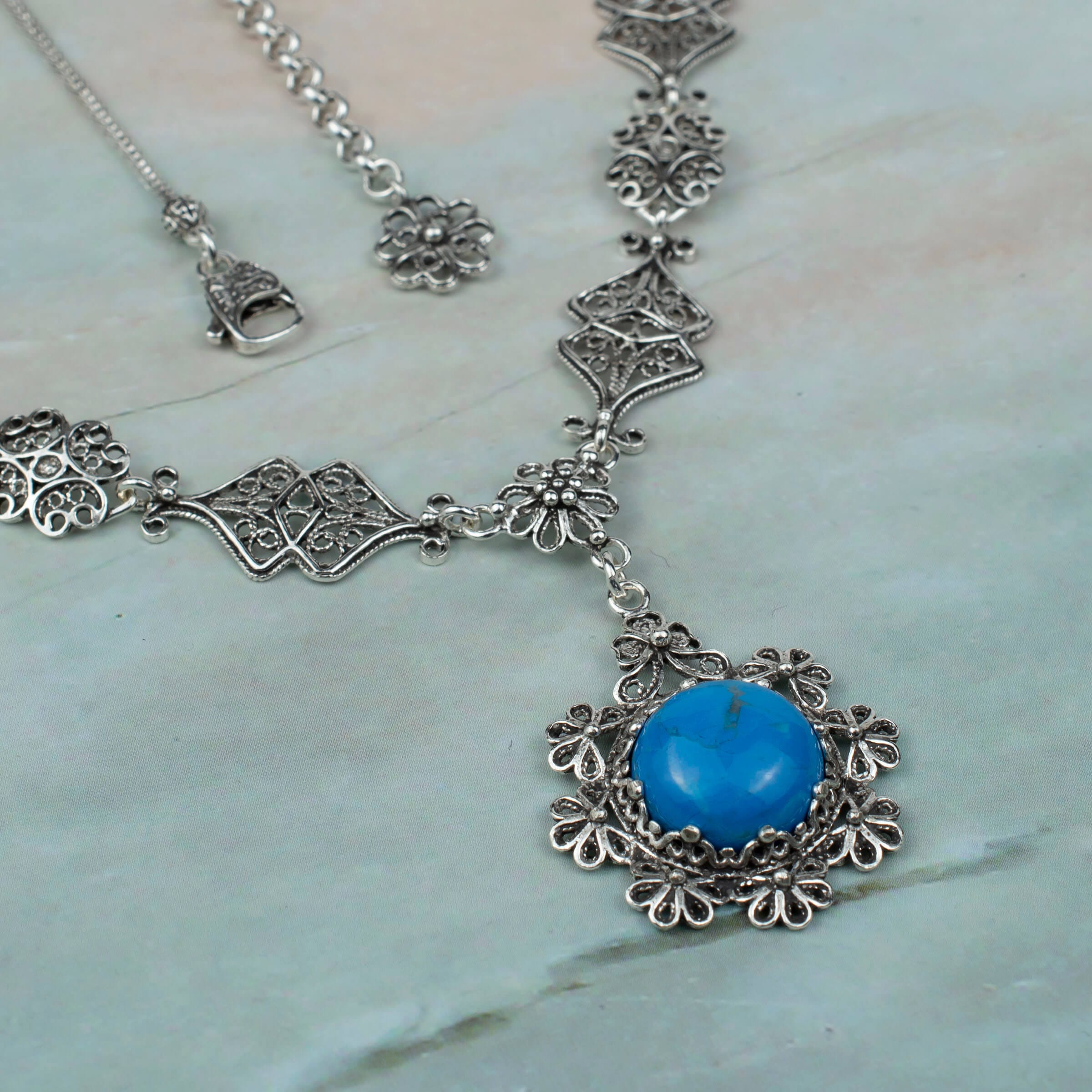 This choker necklace is incredibly versatile, making it suitable for a variety of occasions. Pair it with a casual outfit for a day out with friends, or wear it with an elegant dress for a special event. The combination of the turquoise gemstone and the silver filigree design makes it a standout piece that can elevate any look.