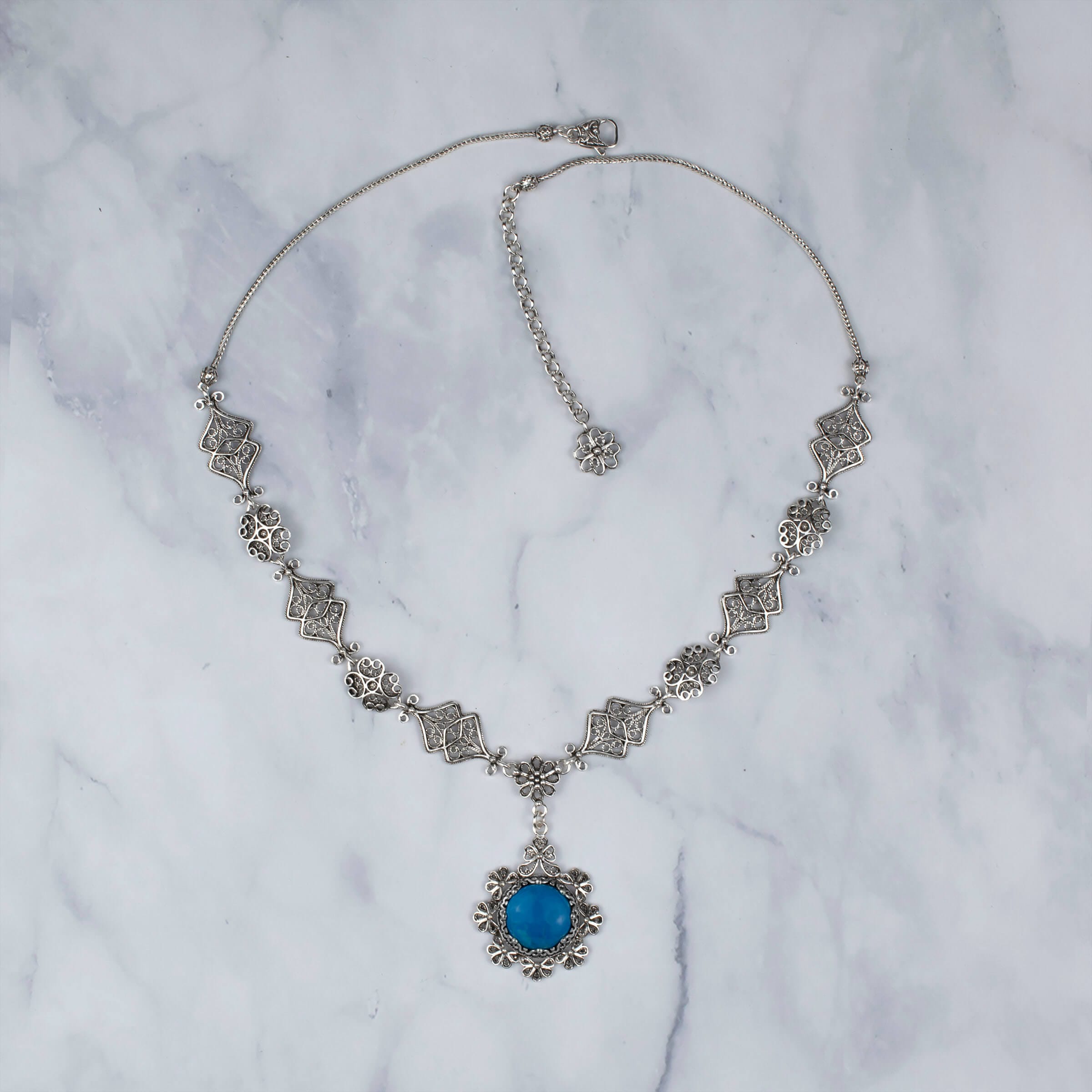 In summary, the Filigree Art Turquoise Gemstone Women Silver Choker Necklace is a beautiful blend of artistry and elegance. With its high-quality materials, intricate design, and adjustable length, it is a must-have accessory for any jewelry lover. Whether you are treating yourself or looking for the perfect gift for a loved one, this necklace is sure to impress.