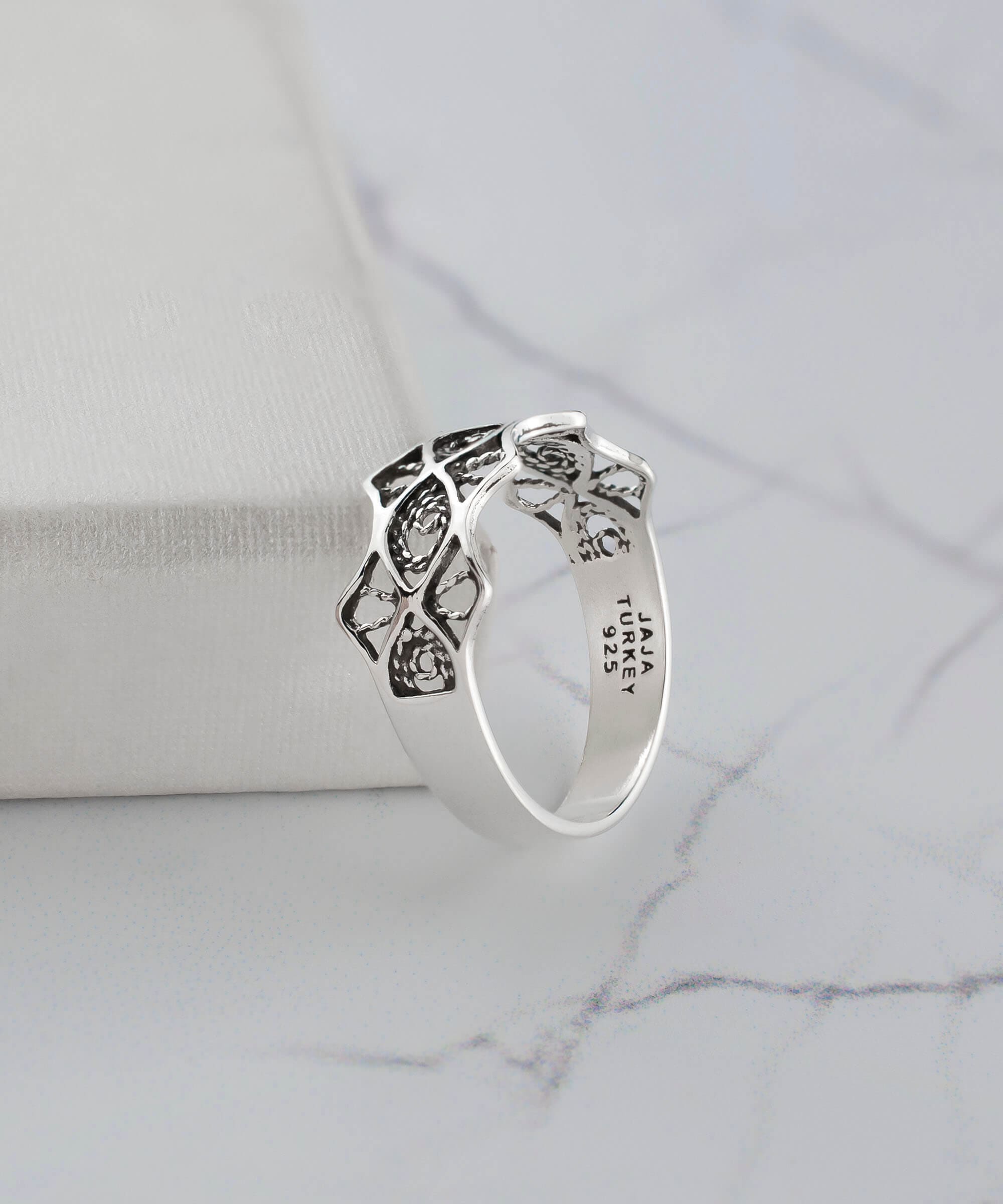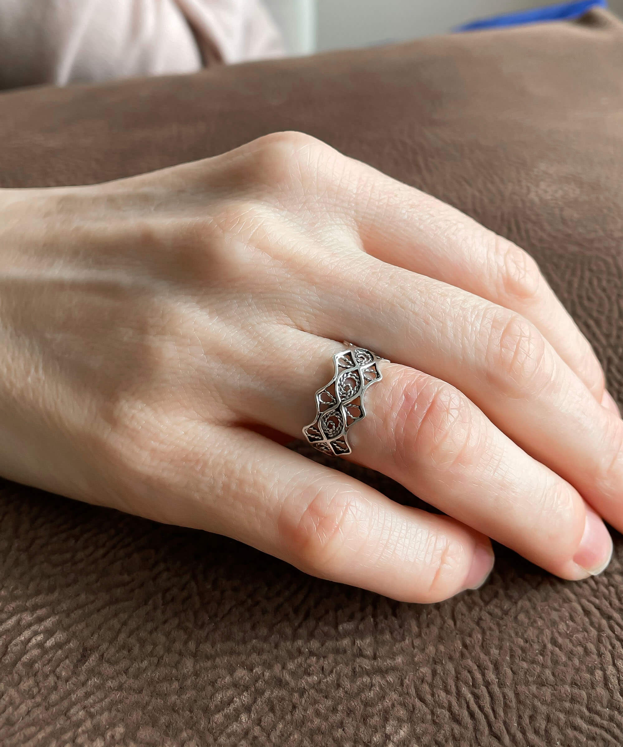 This ring features an oxidized finish that enhances its vintage appeal. The highly polished surface reflects light beautifully, adding a radiant glow to your hand. The combination of the oxidized and polished finishes creates a striking contrast that highlights the intricate details of the filigree design.