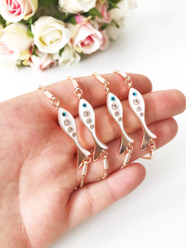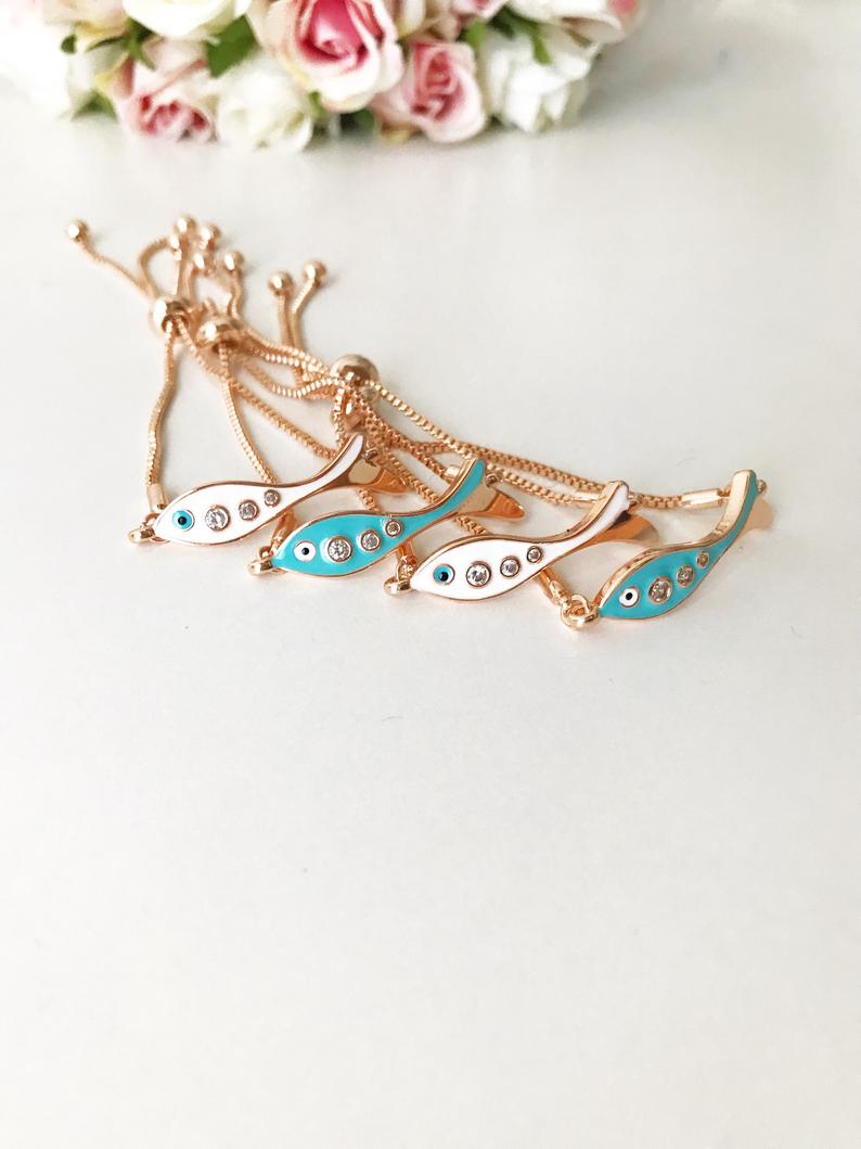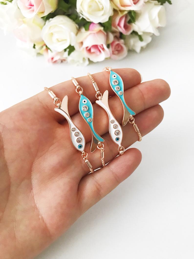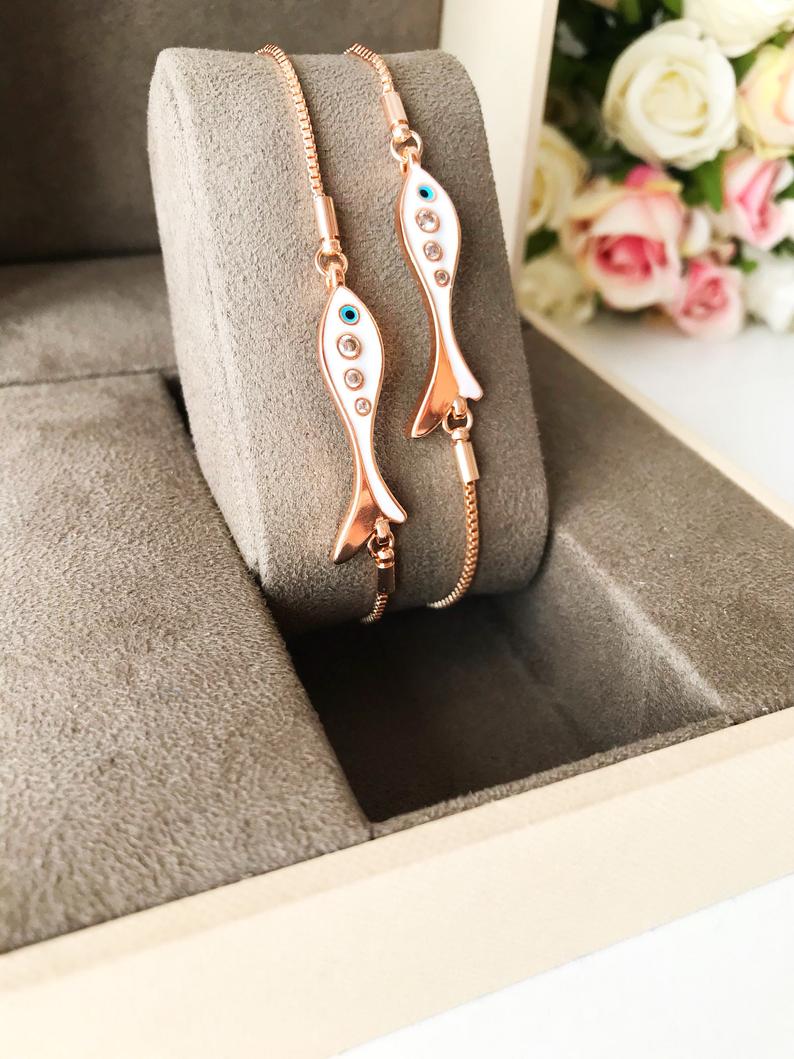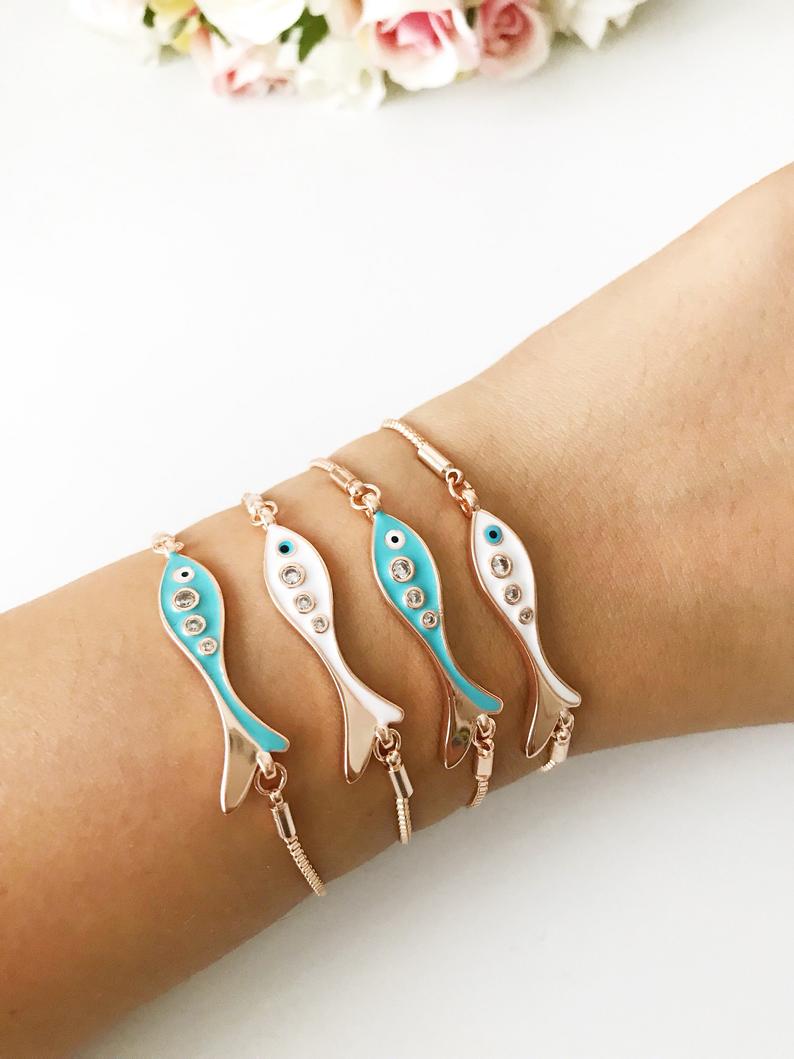 The Fish Evil Eye Bracelet is available in two stunning colors: turquoise and white. The turquoise option adds a vibrant pop of color, while the white variant offers a classic and timeless look. Both colors complement the rose gold beautifully, making it easy to pair with other jewelry or wear alone as a statement piece.