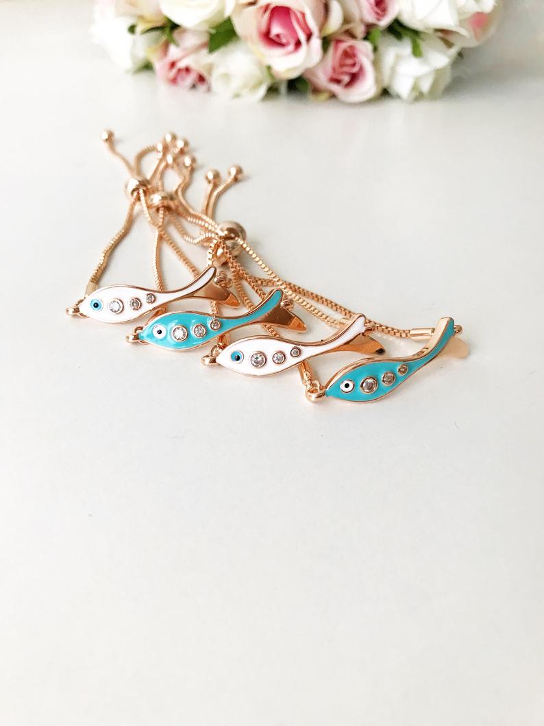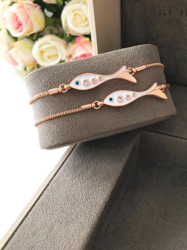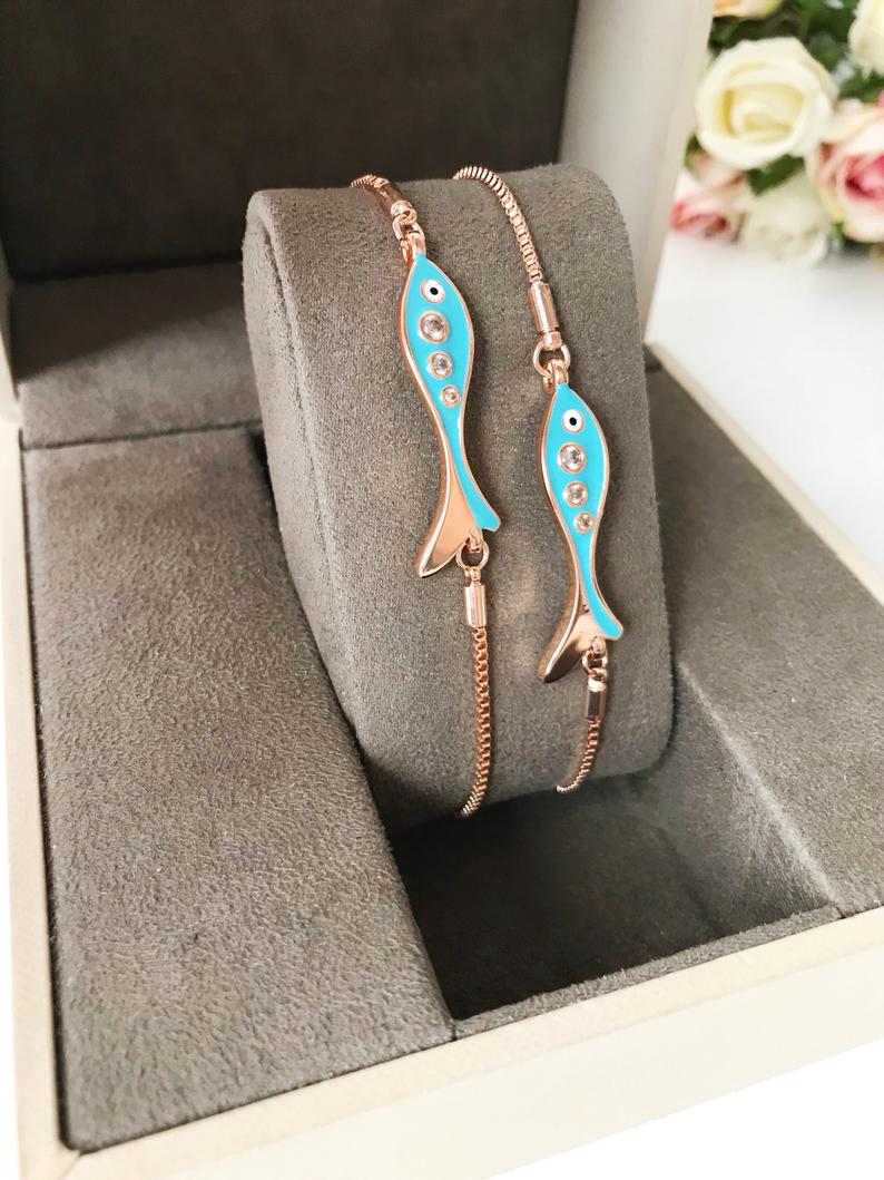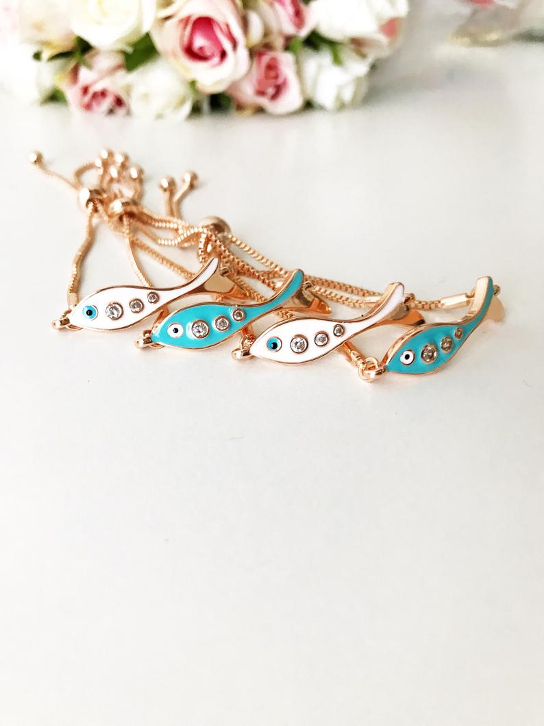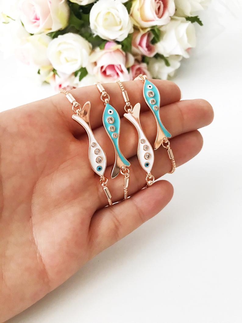The Fish Evil Eye Bracelet is available in two stunning colors: turquoise and white. The turquoise option adds a vibrant pop of color, while the white variant offers a classic and timeless look. Both colors complement the rose gold beautifully, making it easy to pair with other jewelry or wear alone as a statement piece.