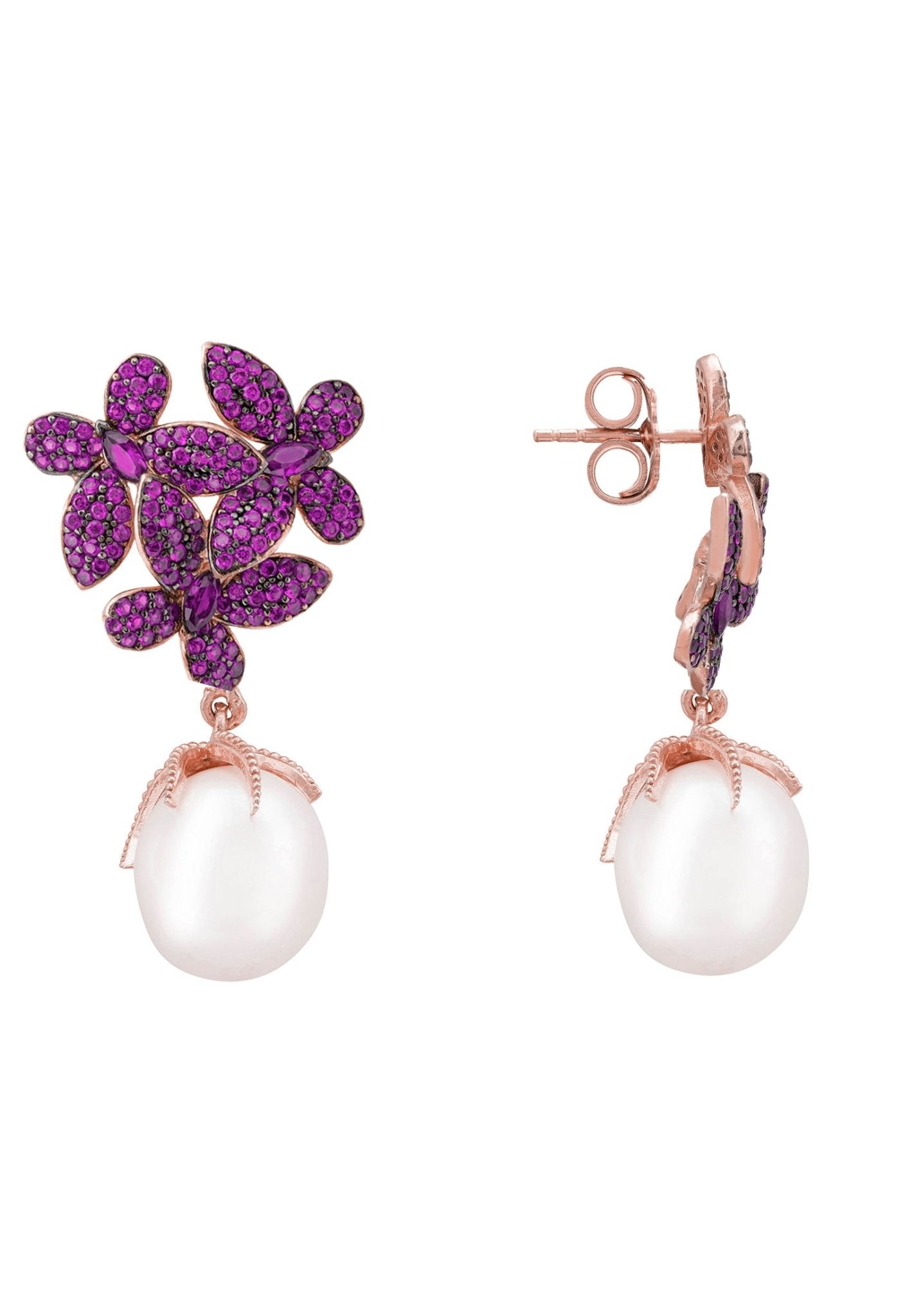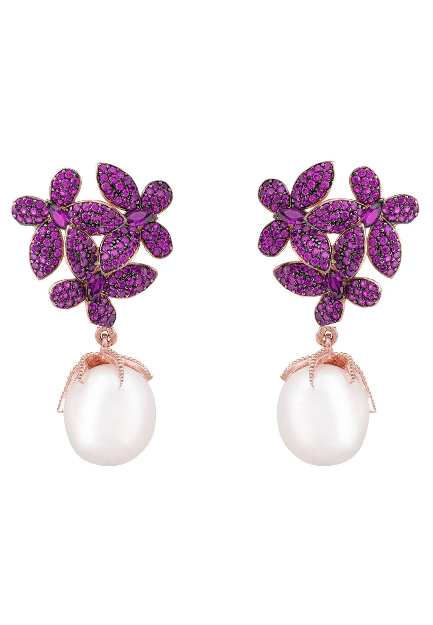 Stunning Flowers Pearl Earrings in Ruby Pink Rosegold featuring baroque pearls and ruby pink cubic zirconia in a floral design.