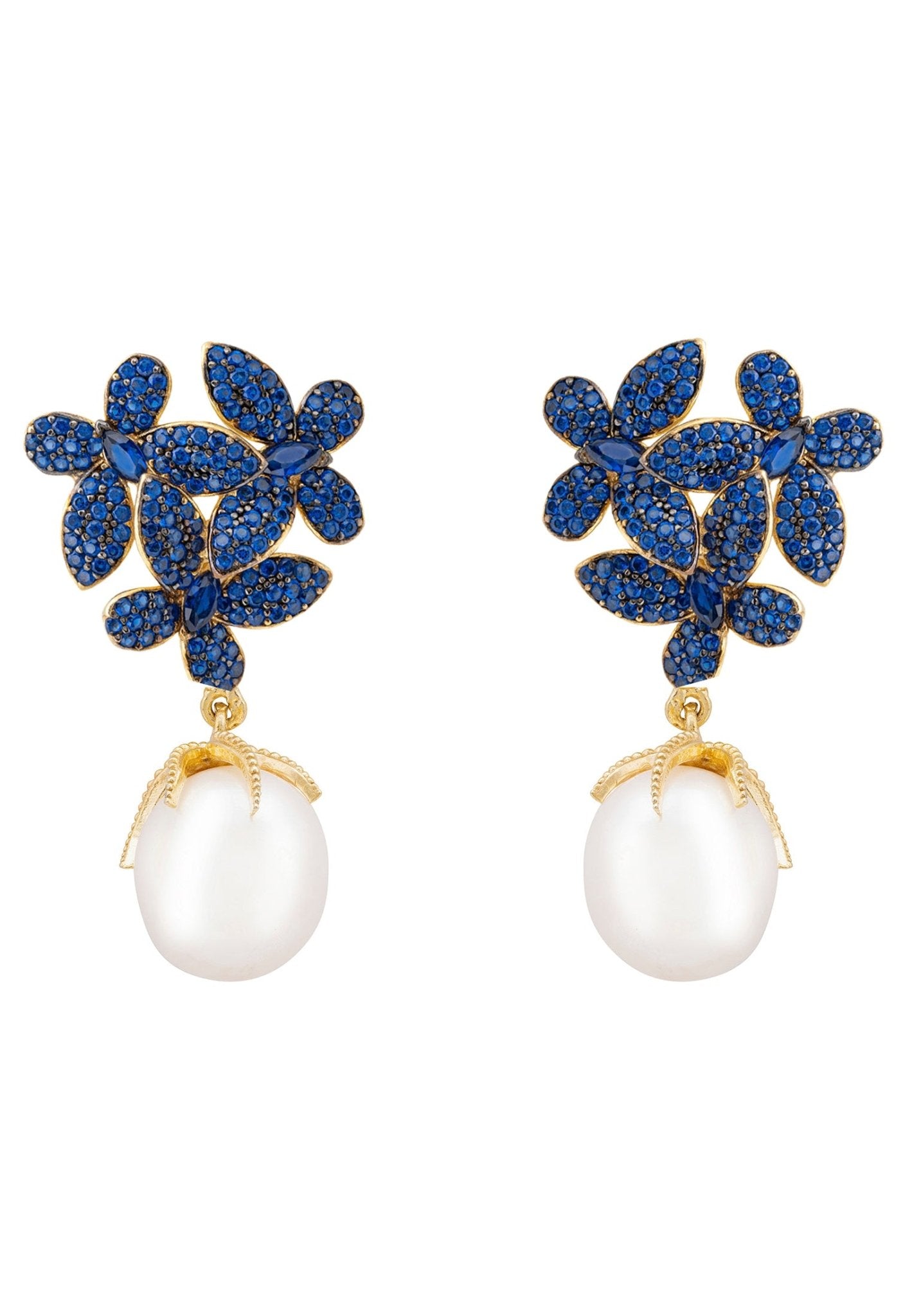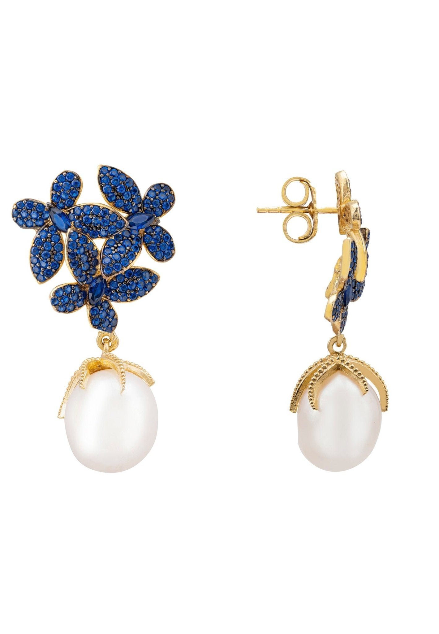 Elegant Flowers Baroque Pearl Earrings in sapphire blue and gold, featuring floral design and cubic zirconia.