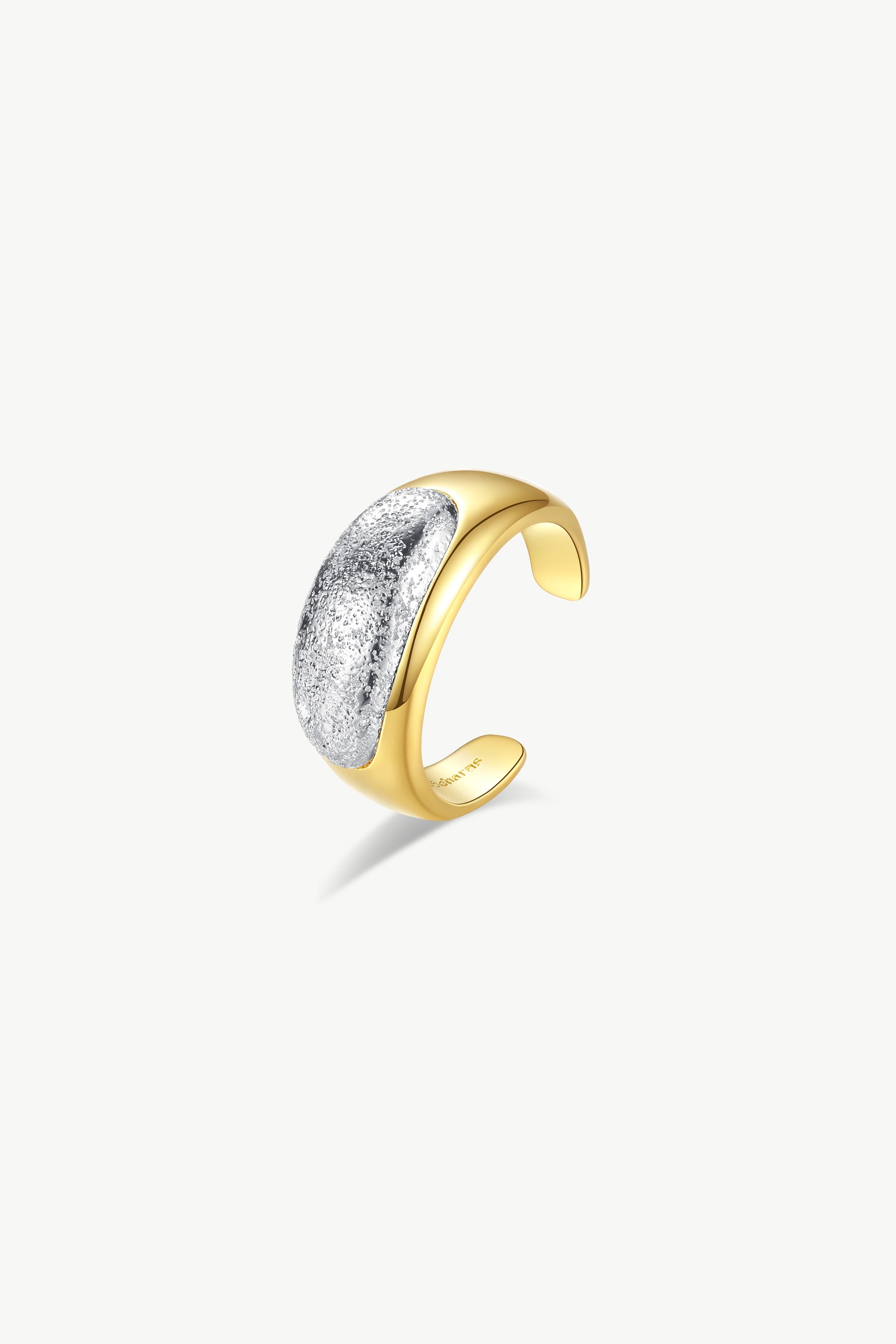 Handmade with precision, this ring showcases a center belt of silver with a frosted finish that contrasts beautifully with the high-polished gold surrounding it. The combination of these two metals creates a striking visual effect that is sure to catch the eye. The minimalist design ensures that the ring can be worn alone or stacked with other rings for a more personalized look.