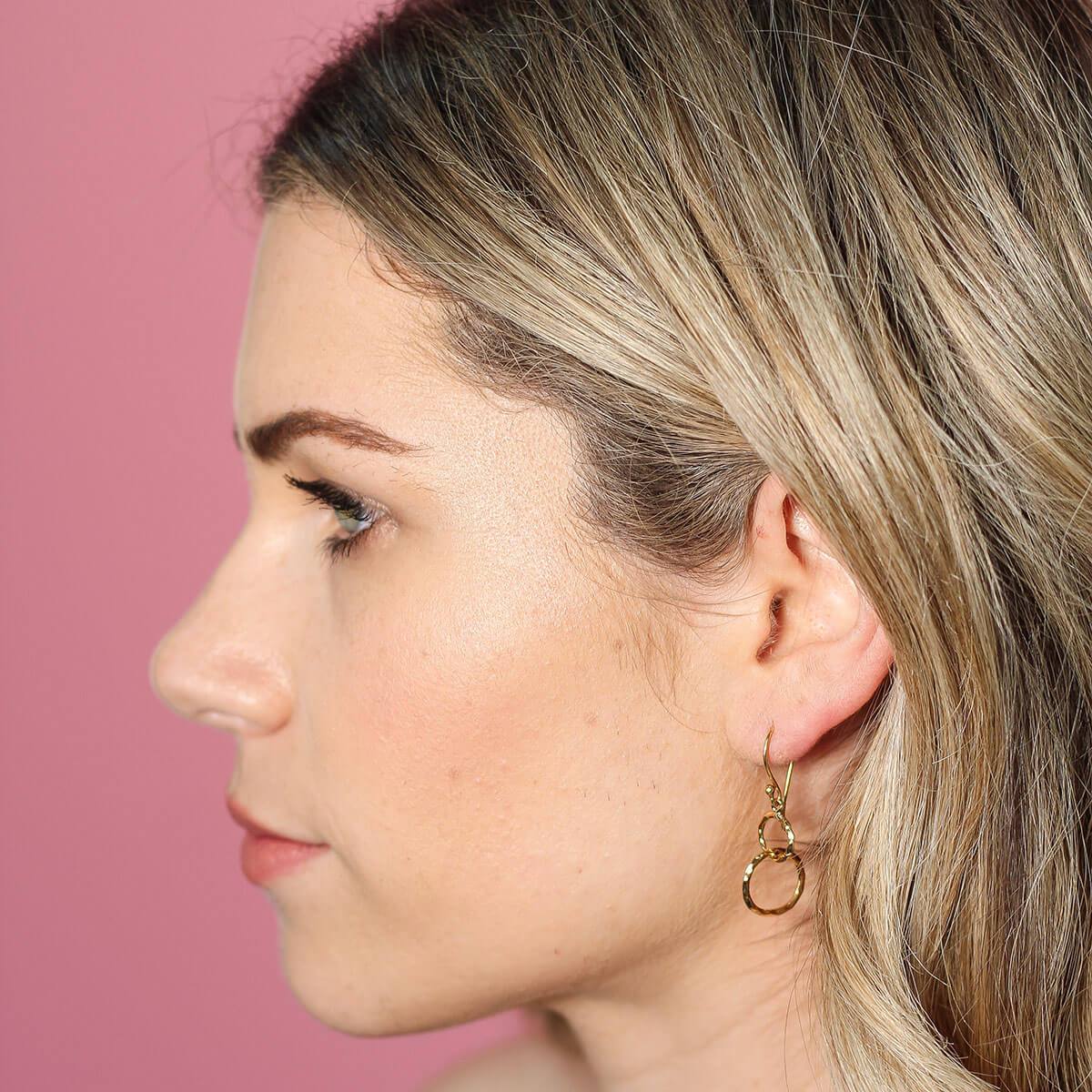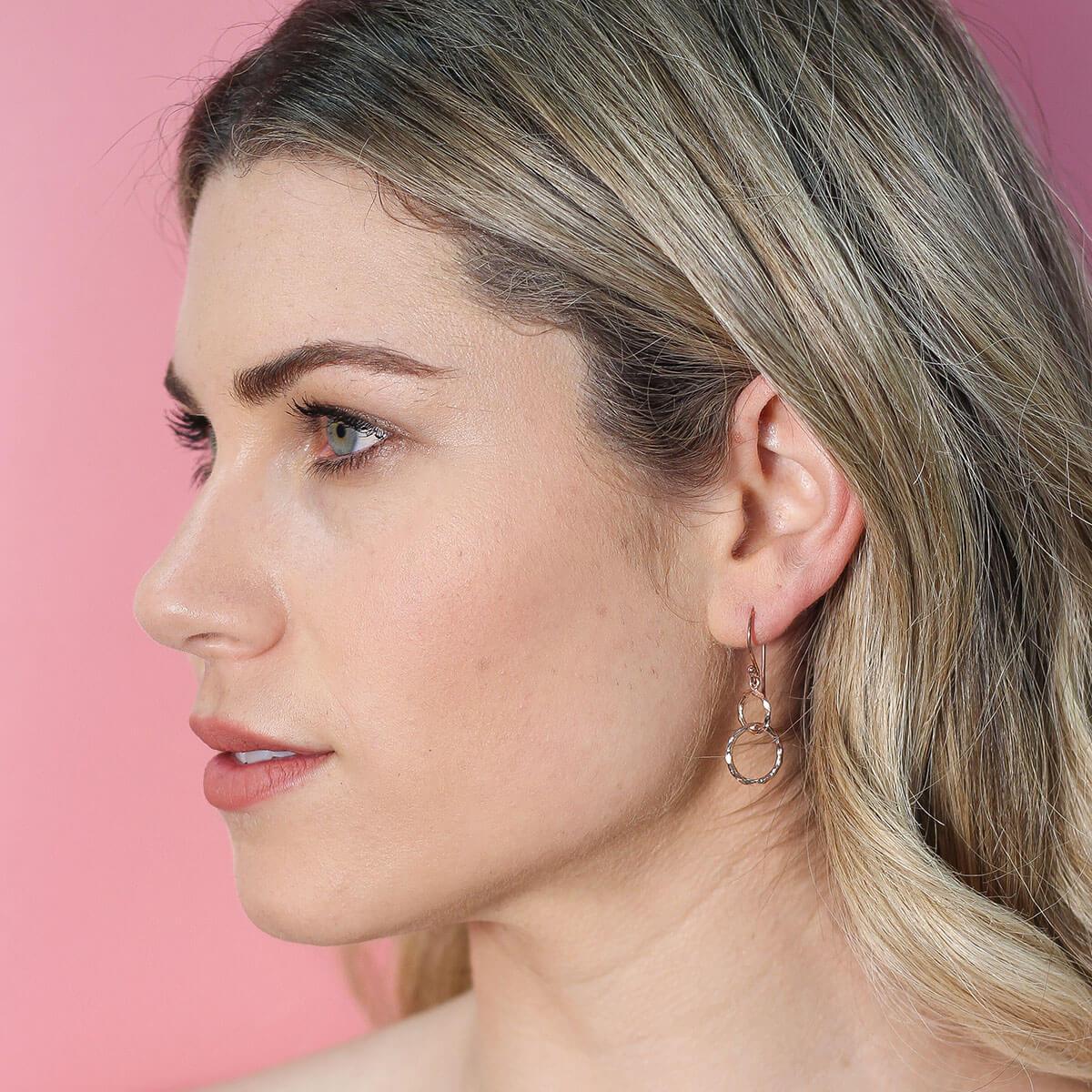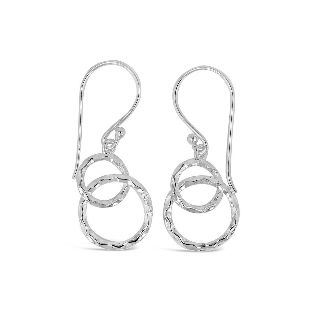 Introducing our exquisite Geometry dangle earrings, a perfect blend of modern design and timeless elegance. These earrings feature two connected circles that are beautifully entwined, showcasing a graduated size that adds a touch of glamour to any outfit. The hammered finish not only enhances the visual appeal but also reflects light in a captivating way, making these earrings a standout accessory for any occasion.