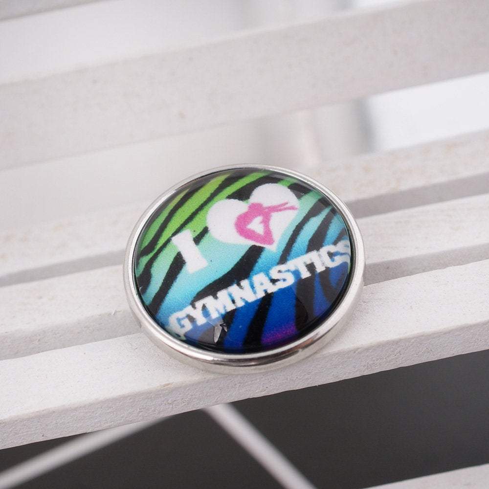 A vibrant 'I Love Gymnastics' glass domed snap, showcasing a colorful design perfect for interchangeable jewelry.