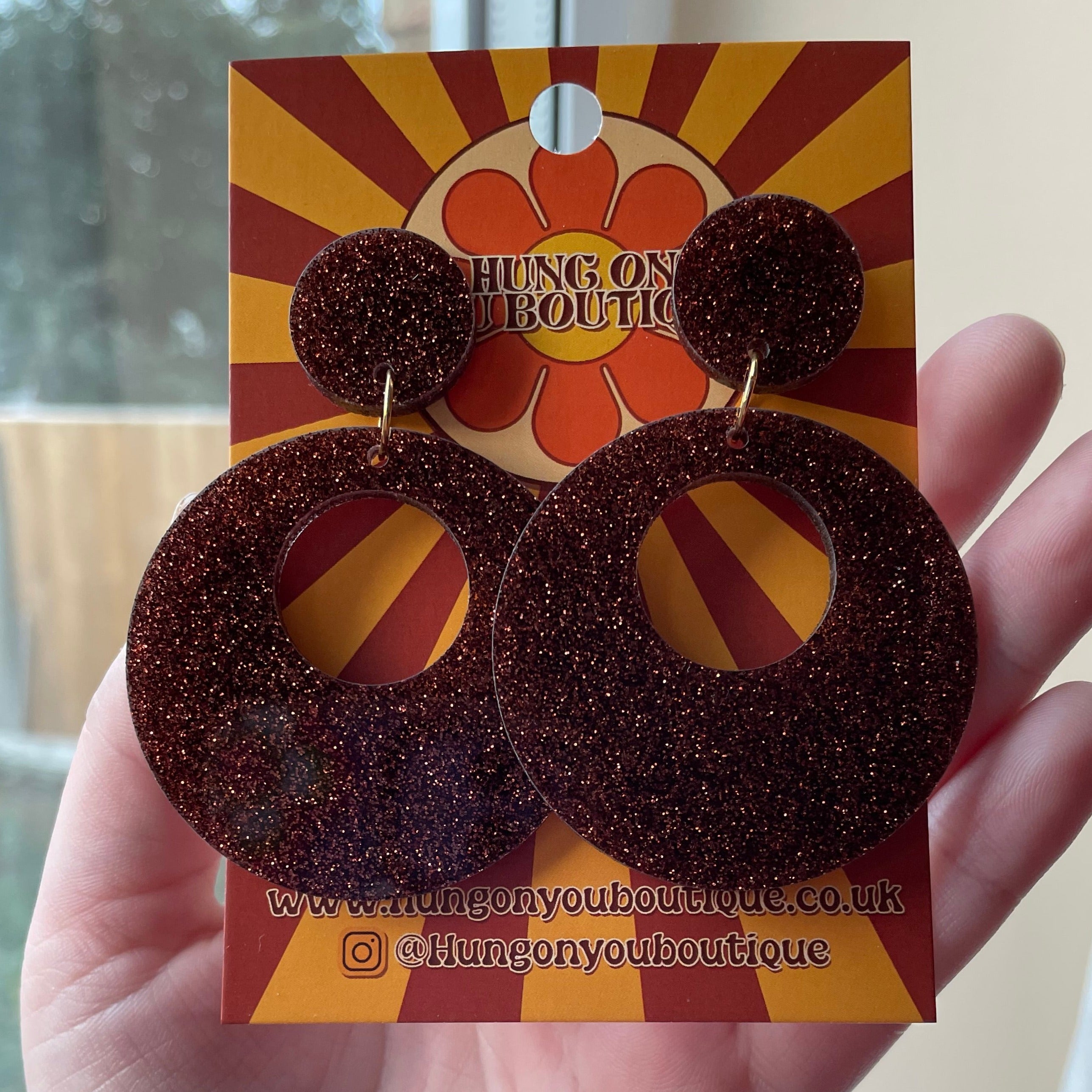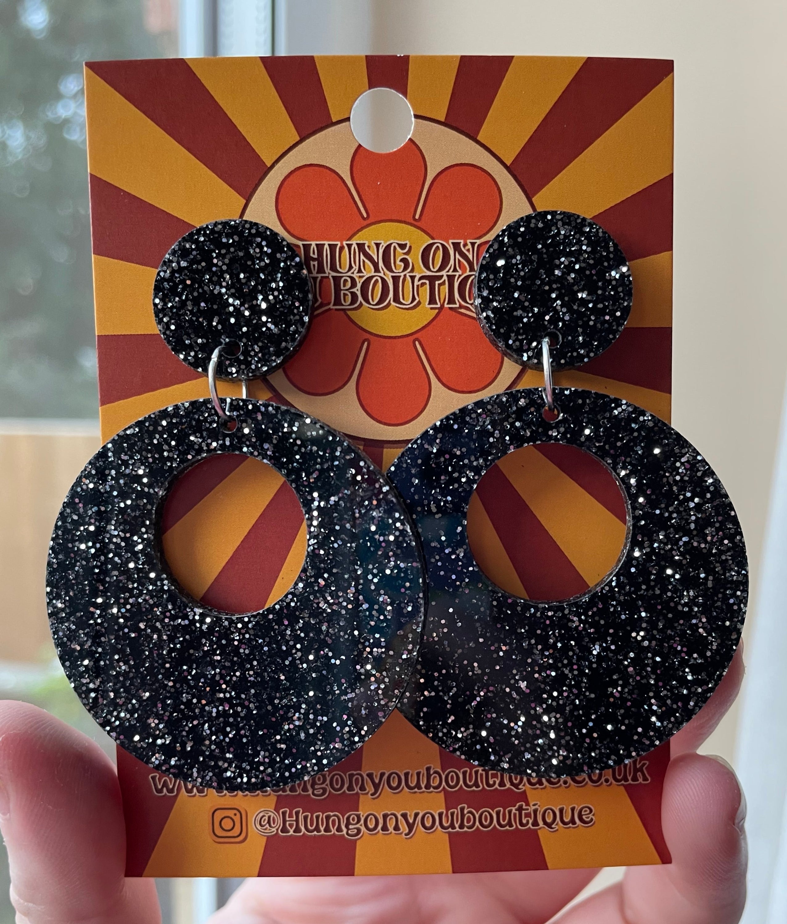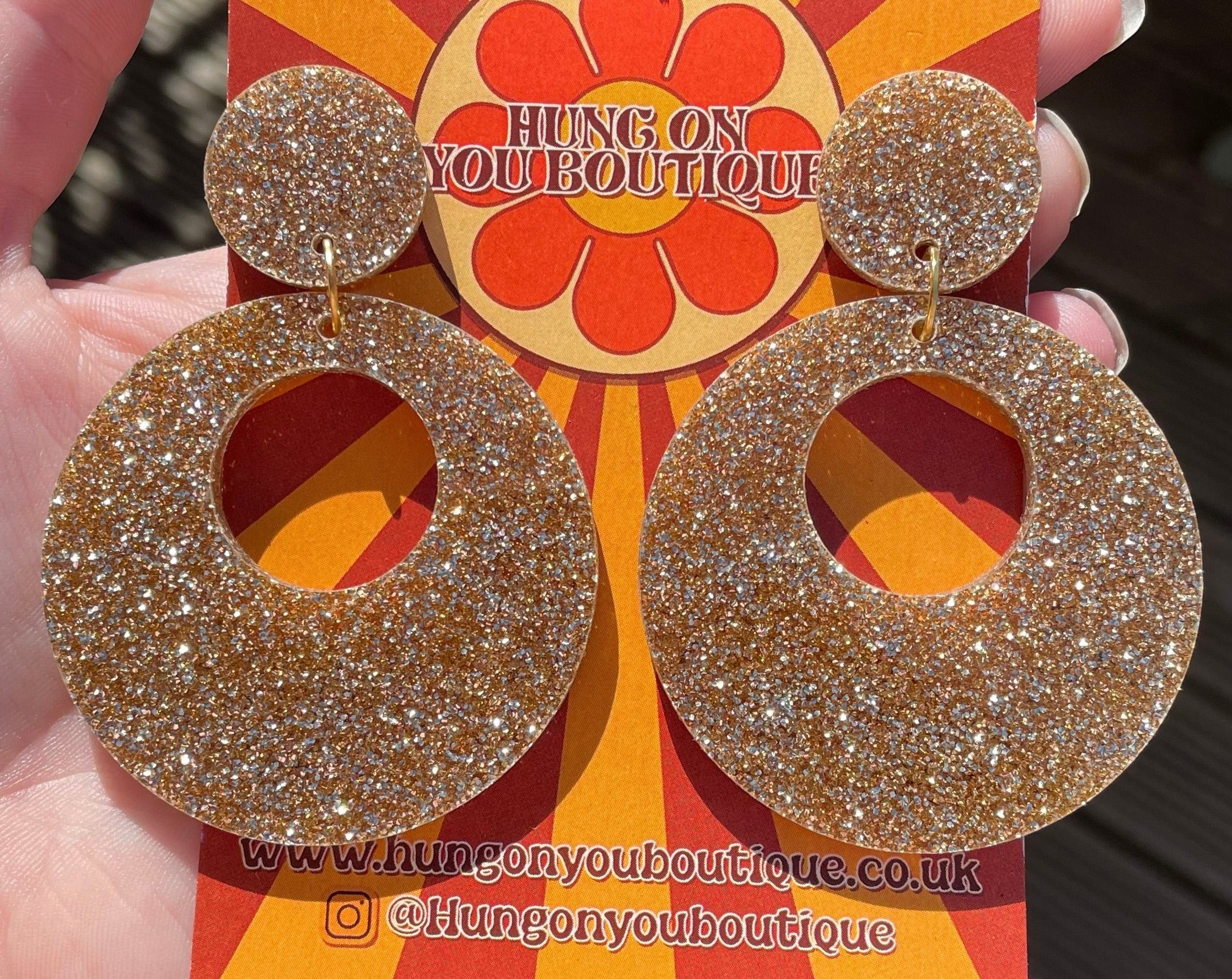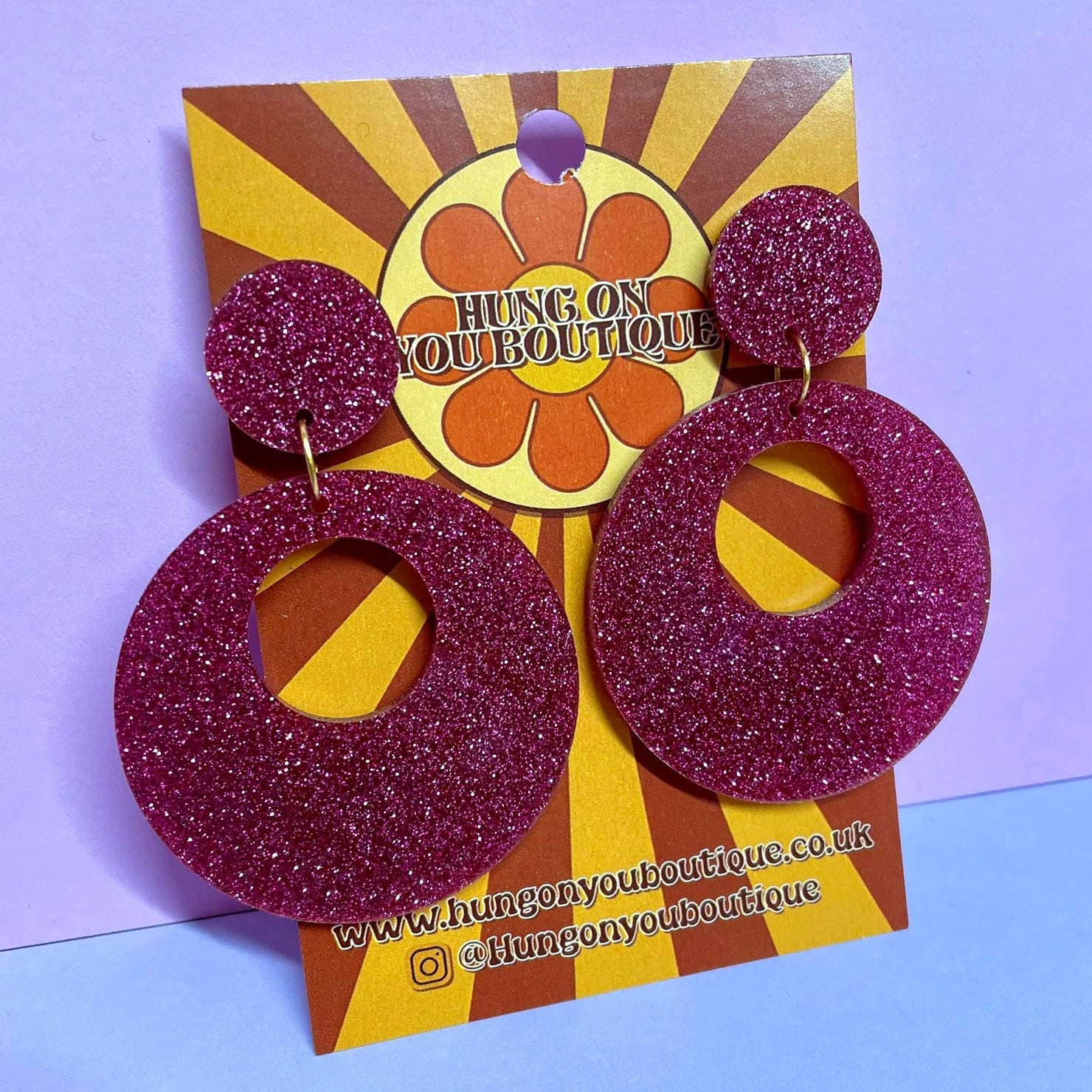 A pair of stylish Glitter Hoop Earrings made from laser-cut acrylic, featuring a shimmering glitter finish, measuring 7cm in height and 5cm in width.