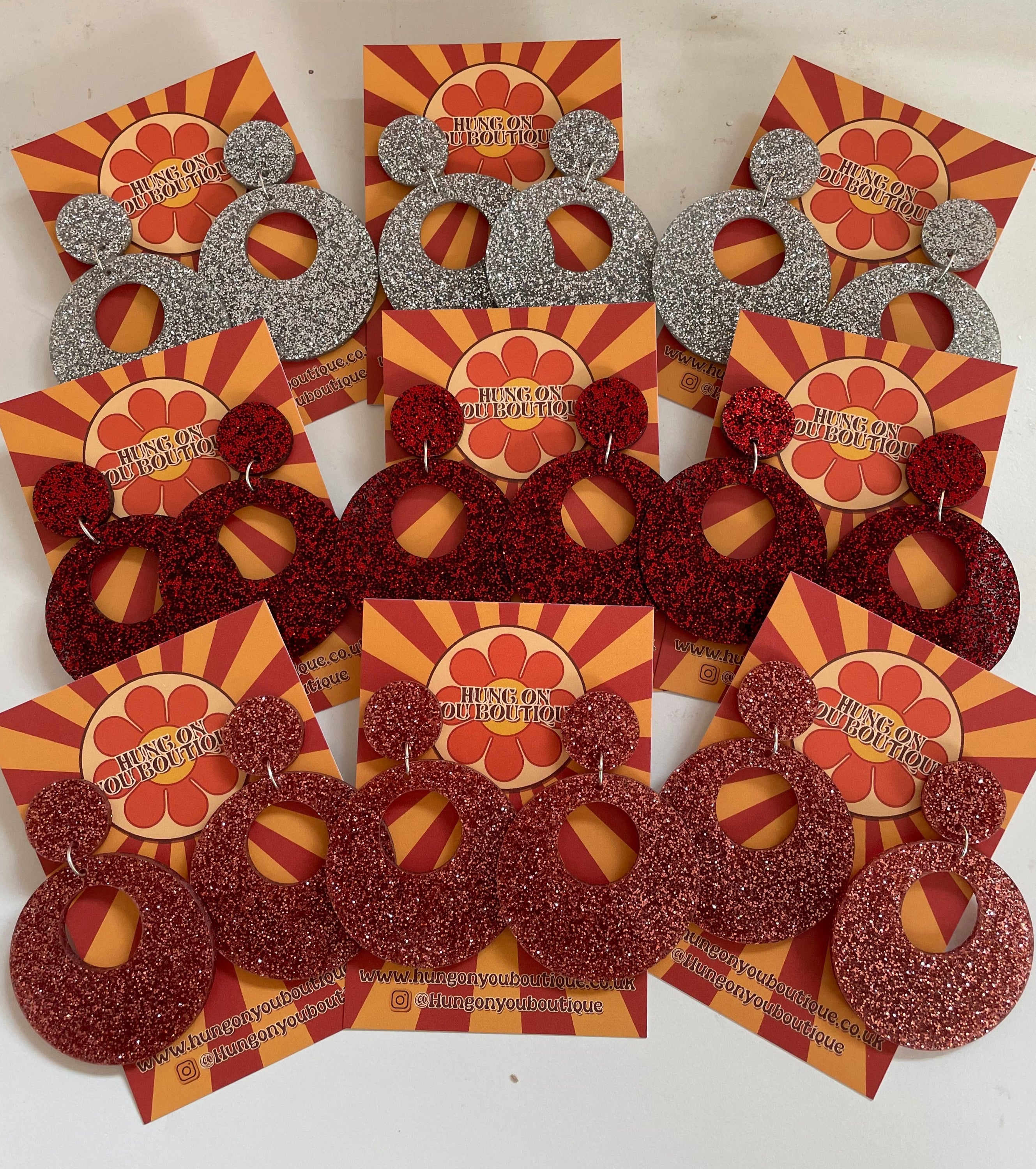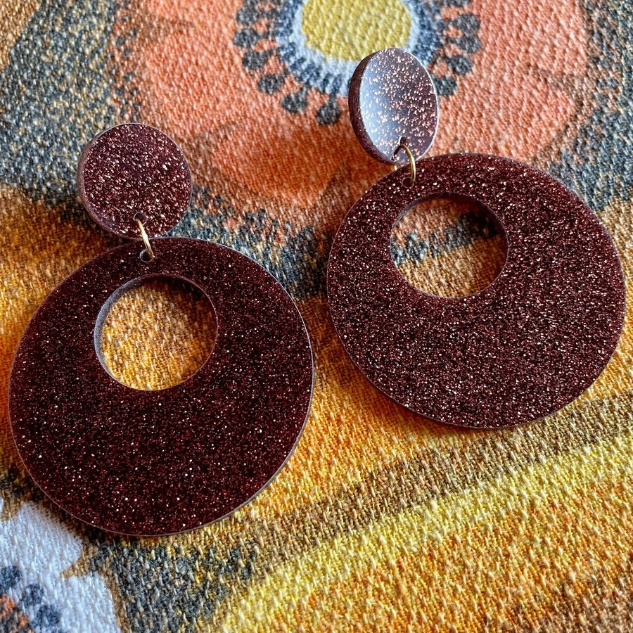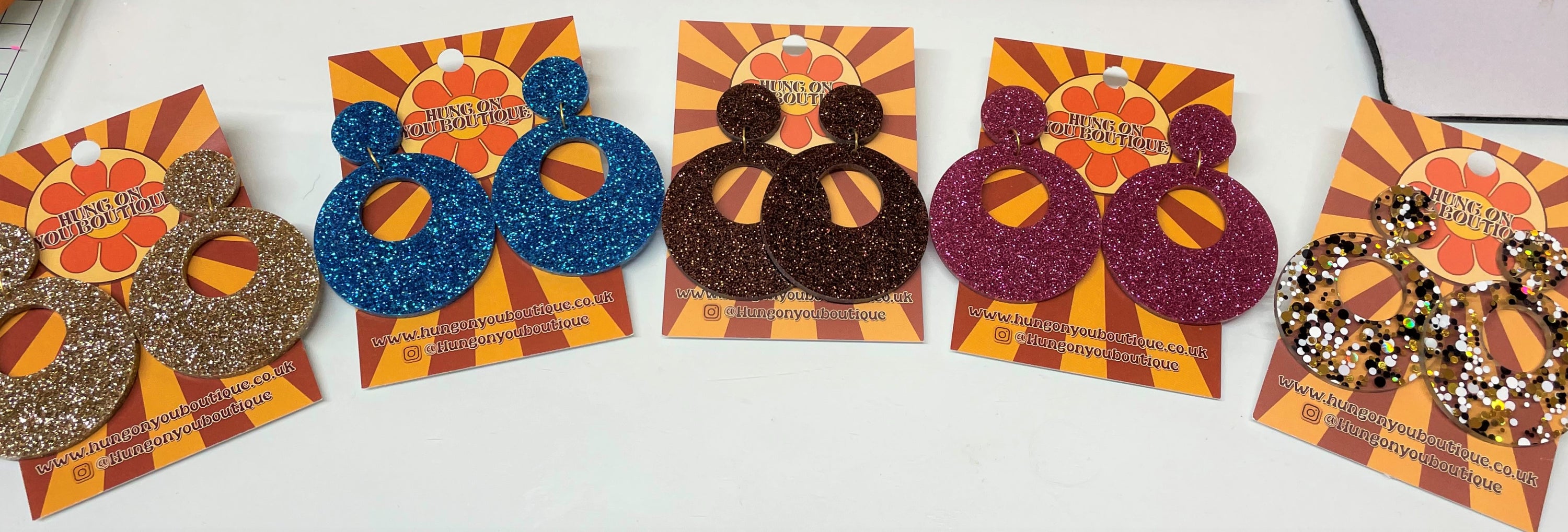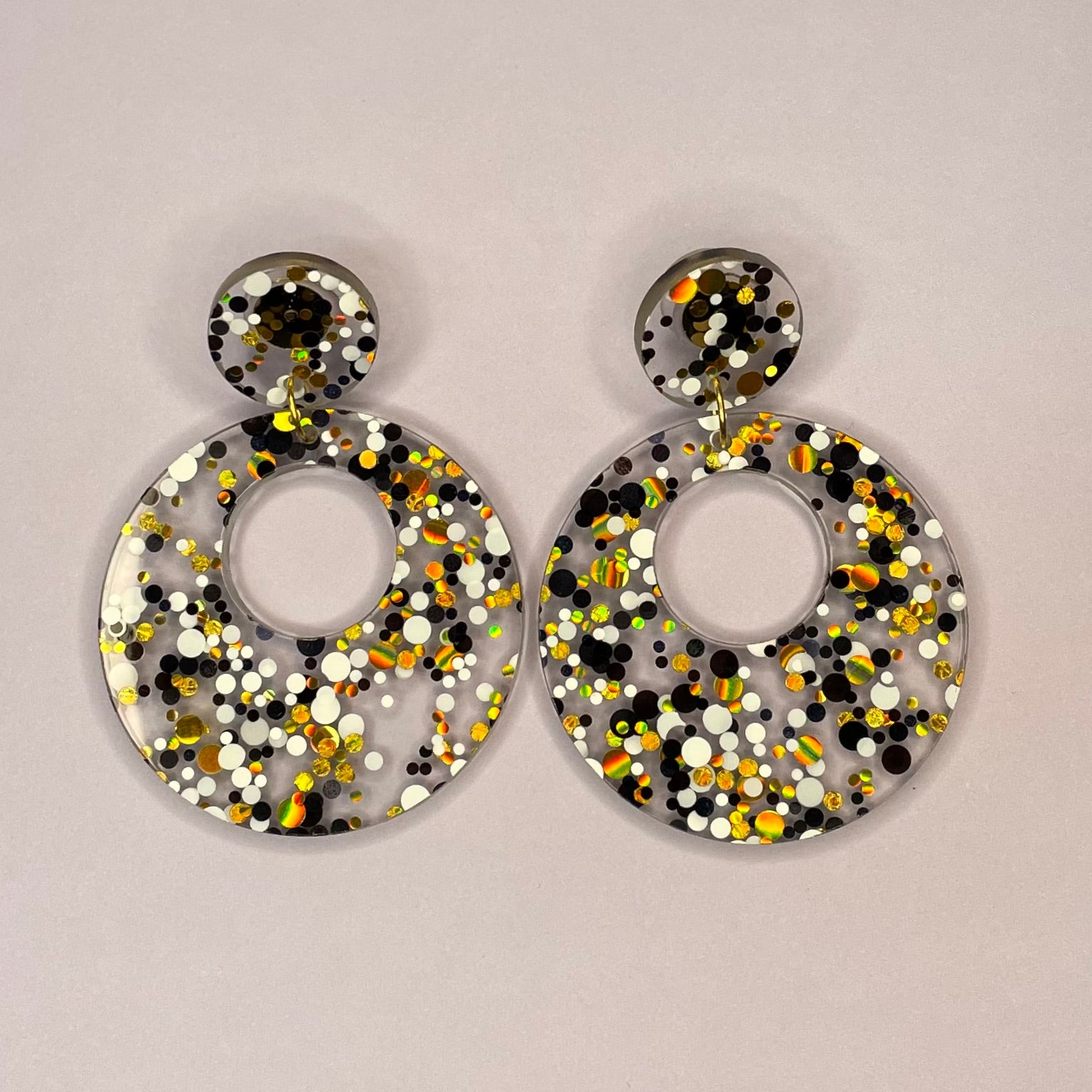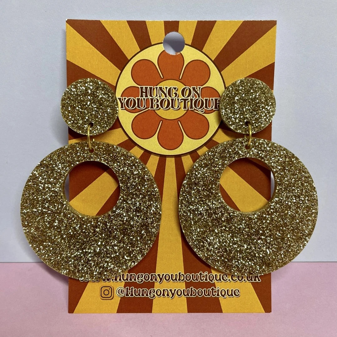 A pair of stylish Glitter Hoop Earrings made from laser-cut acrylic, featuring a shimmering glitter finish, measuring 7cm in height and 5cm in width.