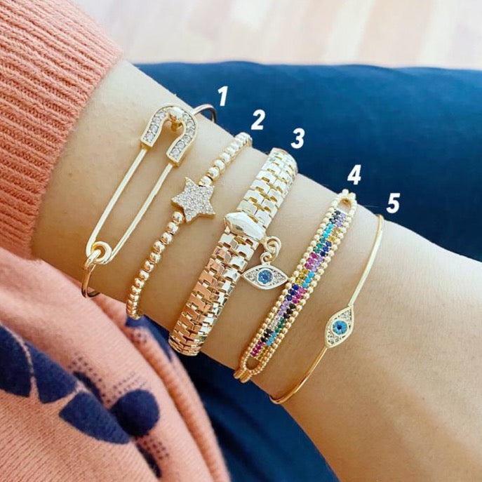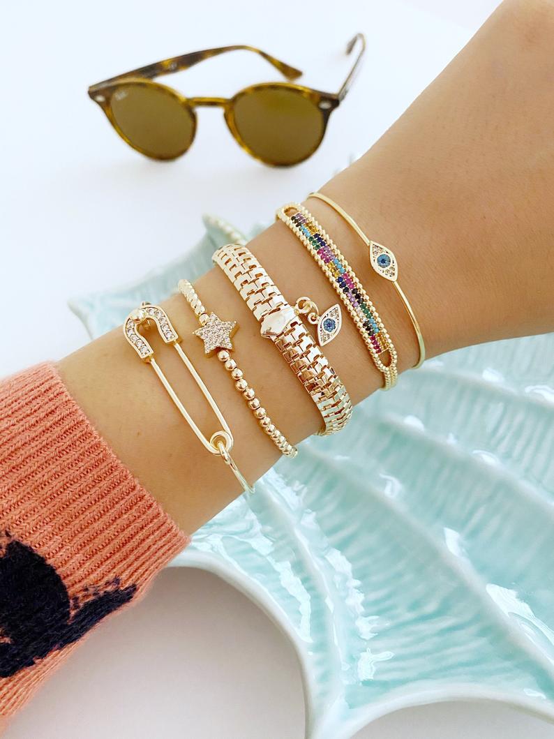 The Gold Evil Eye Bracelet features a chic cuff design that can be worn alone or stacked with other bracelets for a trendy layered look. With five different styles available, you can choose the one that best fits your personal style during checkout. Whether you prefer a minimalist design or something more ornate, there’s a perfect option for everyone.