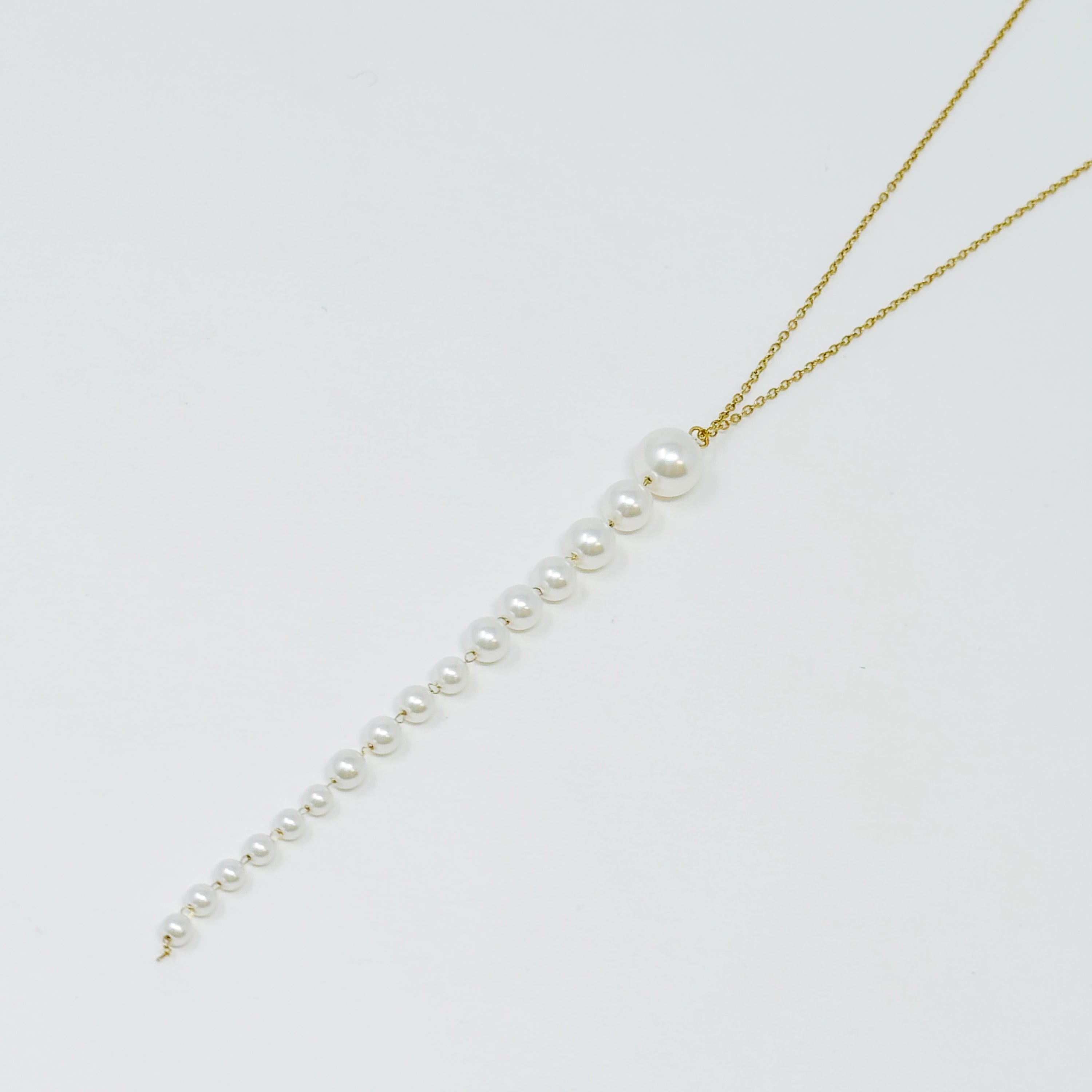 Gradiant Long Pearl Drop Necklace featuring elegant faux pearls and 18k gold plated stainless steel chain.
