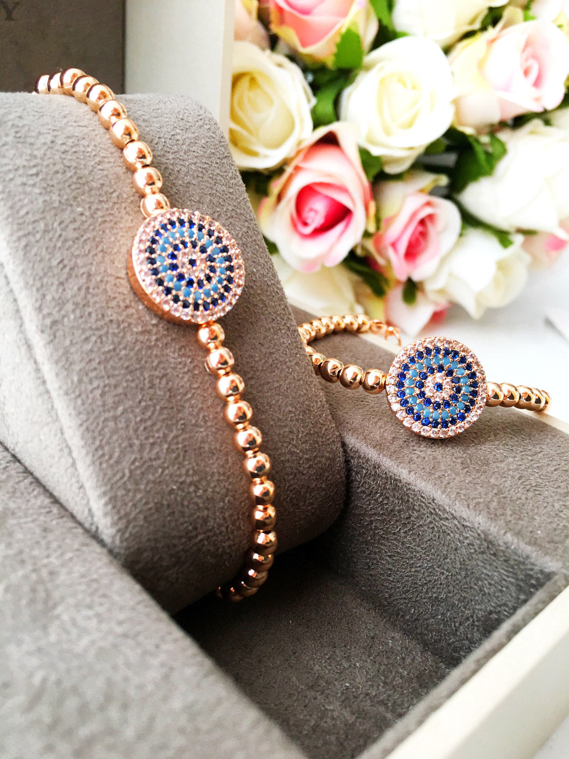 Introducing our exquisite Greek Evil Eye Bracelet, a beautiful piece of jewelry that combines elegance with cultural significance. This bracelet features a stunning design adorned with zircon accents, set in a luxurious rose gold finish. The evil eye symbol is believed to offer protection against negative energies, making this bracelet not only a fashionable accessory but also a meaningful one.