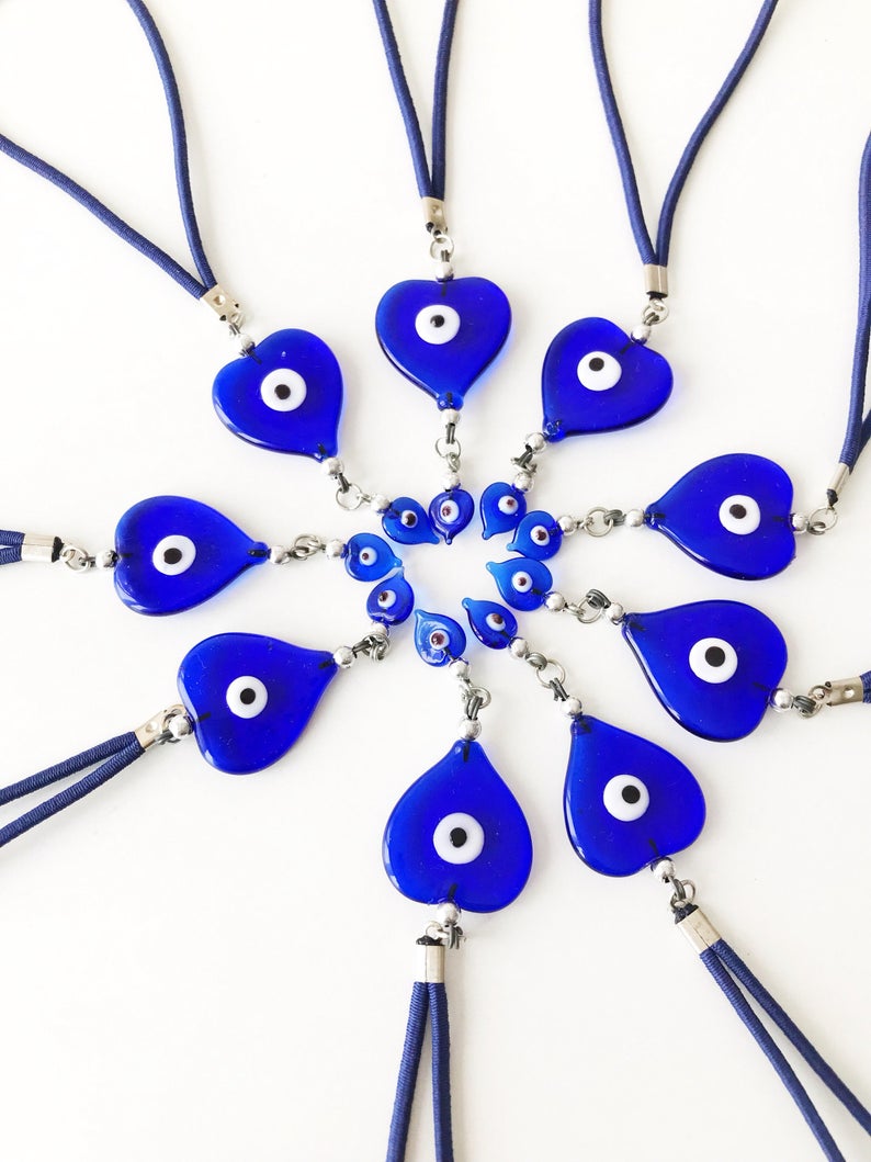 The charm is made from high-quality glass beads, which are known for their durability and vibrant colors. The centerpiece of this charm is a stunning heart-shaped evil eye bead measuring 30mm, surrounded by smaller 10mm evil eye beads. This combination not only adds a touch of elegance but also enhances its protective qualities.