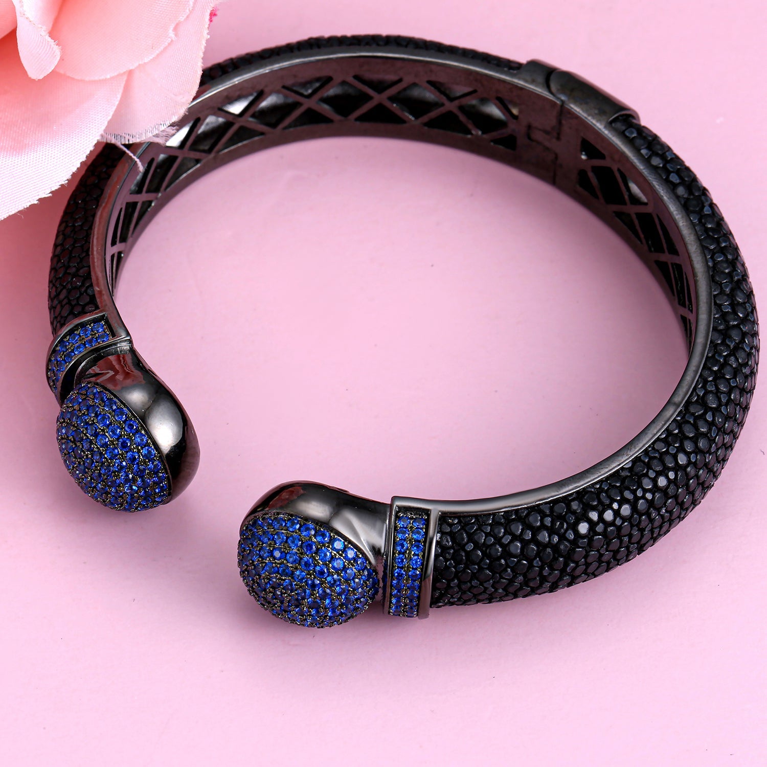 The centerpiece of this bangle is the beautiful Daisy Topaz, known for its vibrant blue hue that captures the essence of elegance. This gemstone is not only visually appealing but also carries a sense of tranquility and calmness, making it a perfect choice for those who appreciate the beauty of nature. The Daisy Topaz is carefully set to ensure it shines brilliantly, adding a touch of glamour to your wrist.