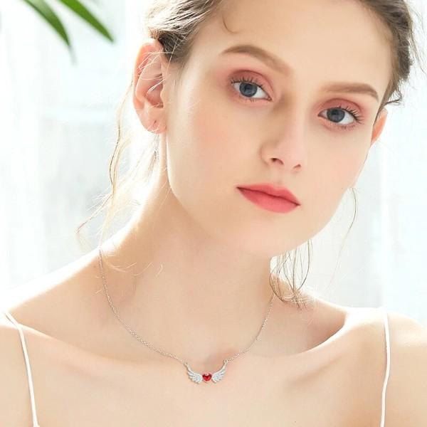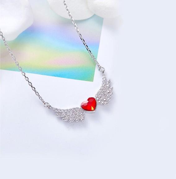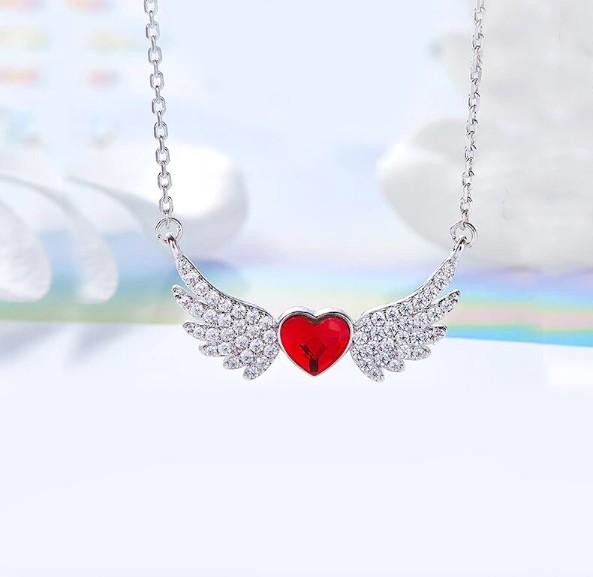 The heart-shaped pendant measures 0.43 by 0.30 inches, making it a delicate yet noticeable accessory. The pendant is adorned with vibrant red Elements stones that add a pop of color and sparkle, making it suitable for both casual and formal occasions. The design of the angel wings adds a unique touch, symbolizing guidance and protection, making this necklace not just a piece of jewelry but a meaningful accessory.