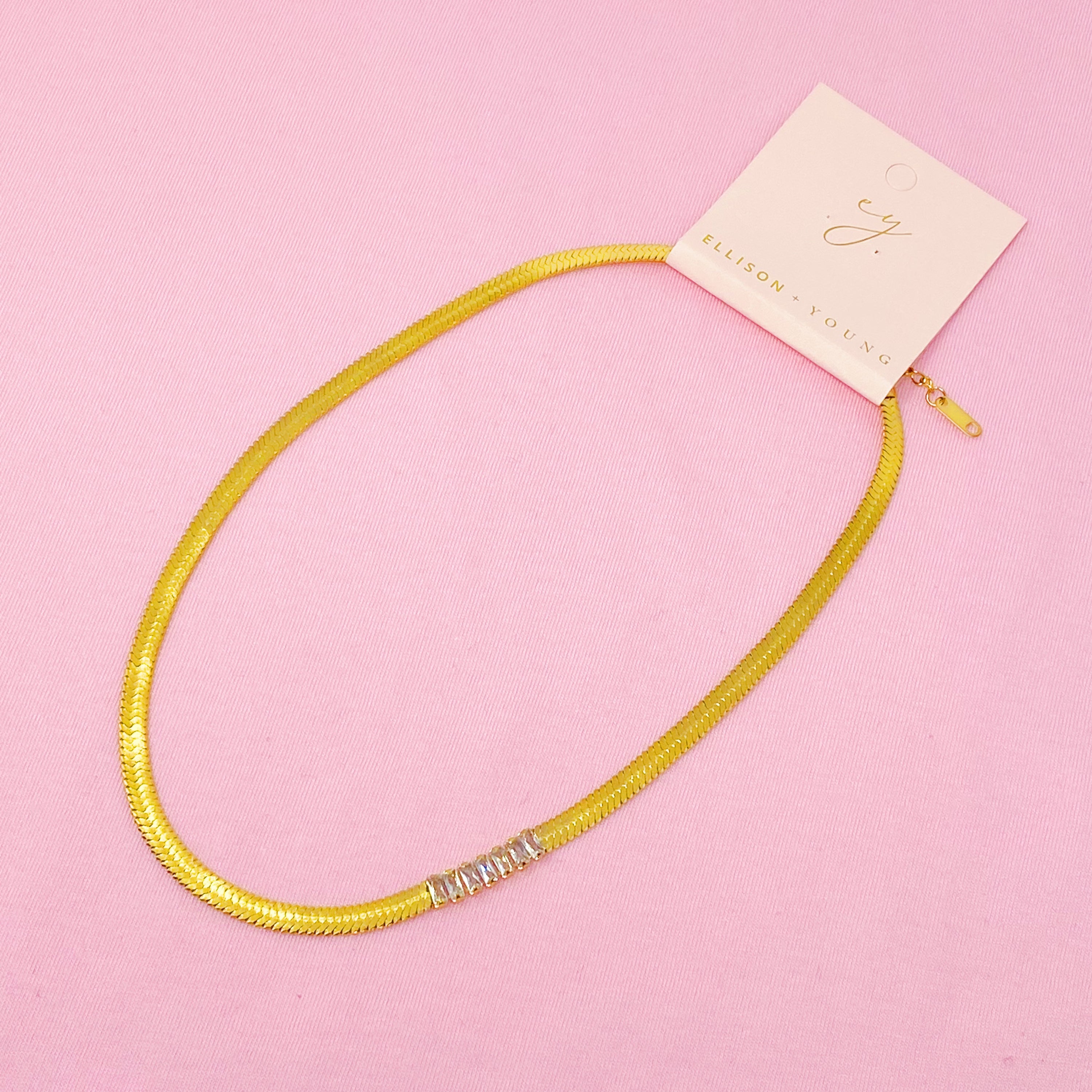 Introducing the exquisite Herringbone Jeweled Necklace, a perfect blend of simplicity and elegance. This stunning piece features a herringbone chain adorned with seven beautiful cubic zirconia jewels, making it an ideal accessory for any occasion. Whether you're dressing up for a special event or adding a touch of glamour to your everyday outfit, this necklace is sure to turn heads.