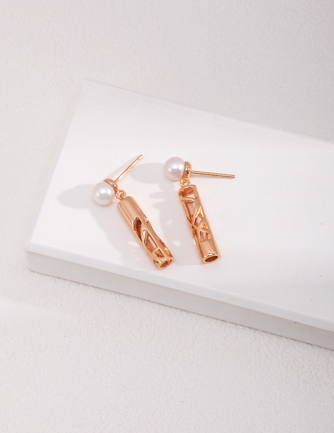 A pair of elegant Hollow Strip Pearl Earrings featuring freshwater pearls and gold vermeil, showcasing their unique design and craftsmanship.
