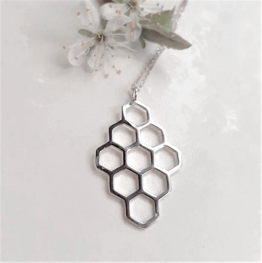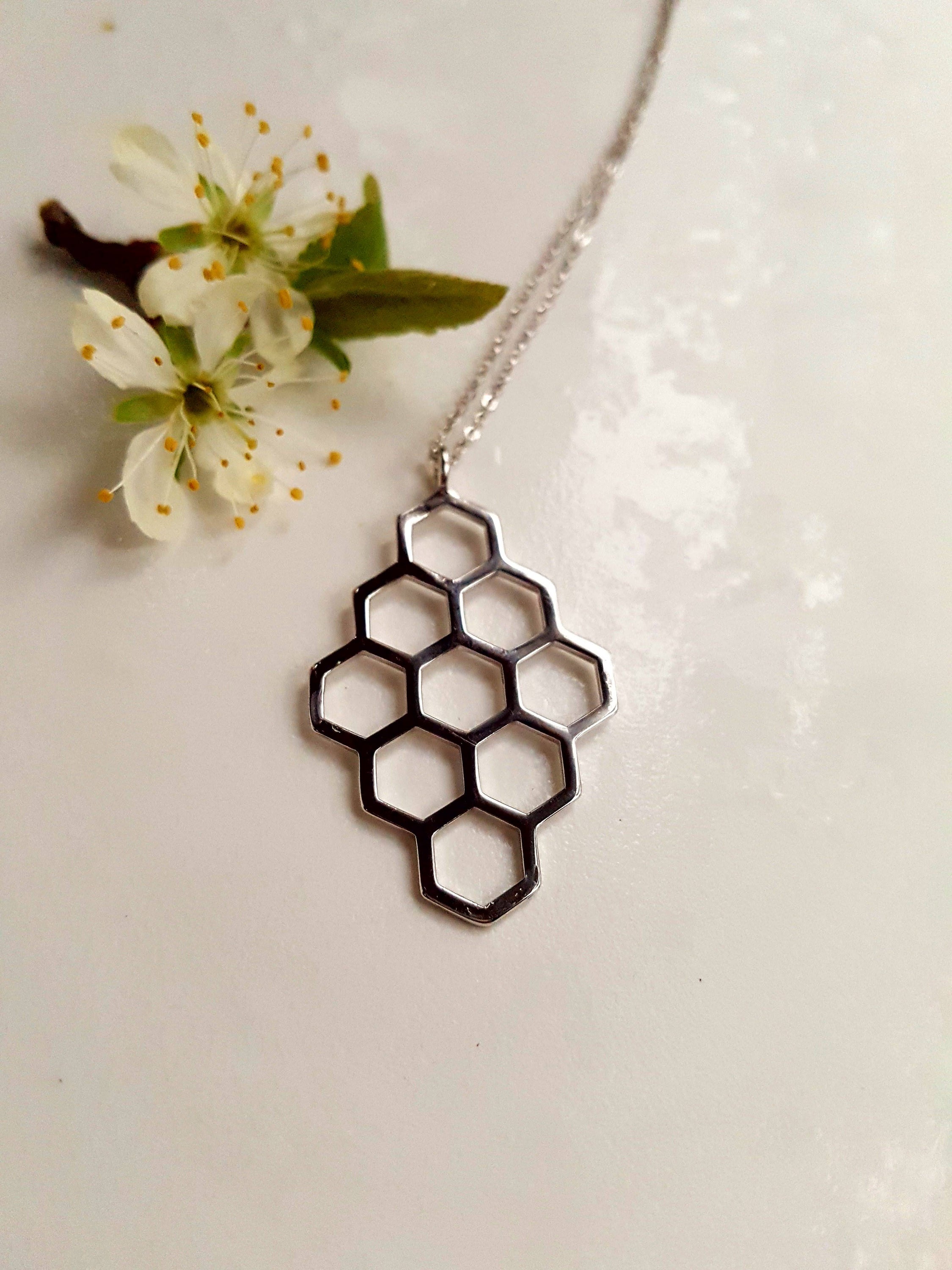 The Honeycomb Pendant Necklace is a beautifully crafted piece of jewelry that captures the essence of nature. Made from high-quality sterling silver, this necklace features a stunning honeycomb pendant that measures 40 mm x 25 mm. The intricate design is not only visually appealing but also symbolizes the beauty of nature, making it a perfect accessory for nature lovers, gardeners, and beekeepers alike.