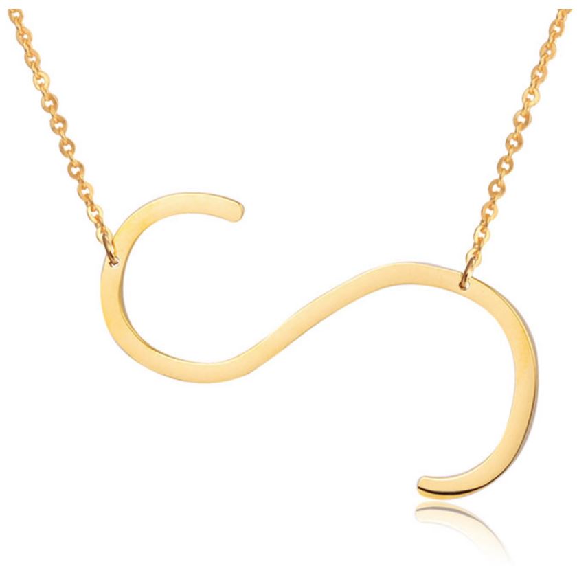 A large initial necklace featuring a polished gold tone finish, showcasing a customizable block letter design.
