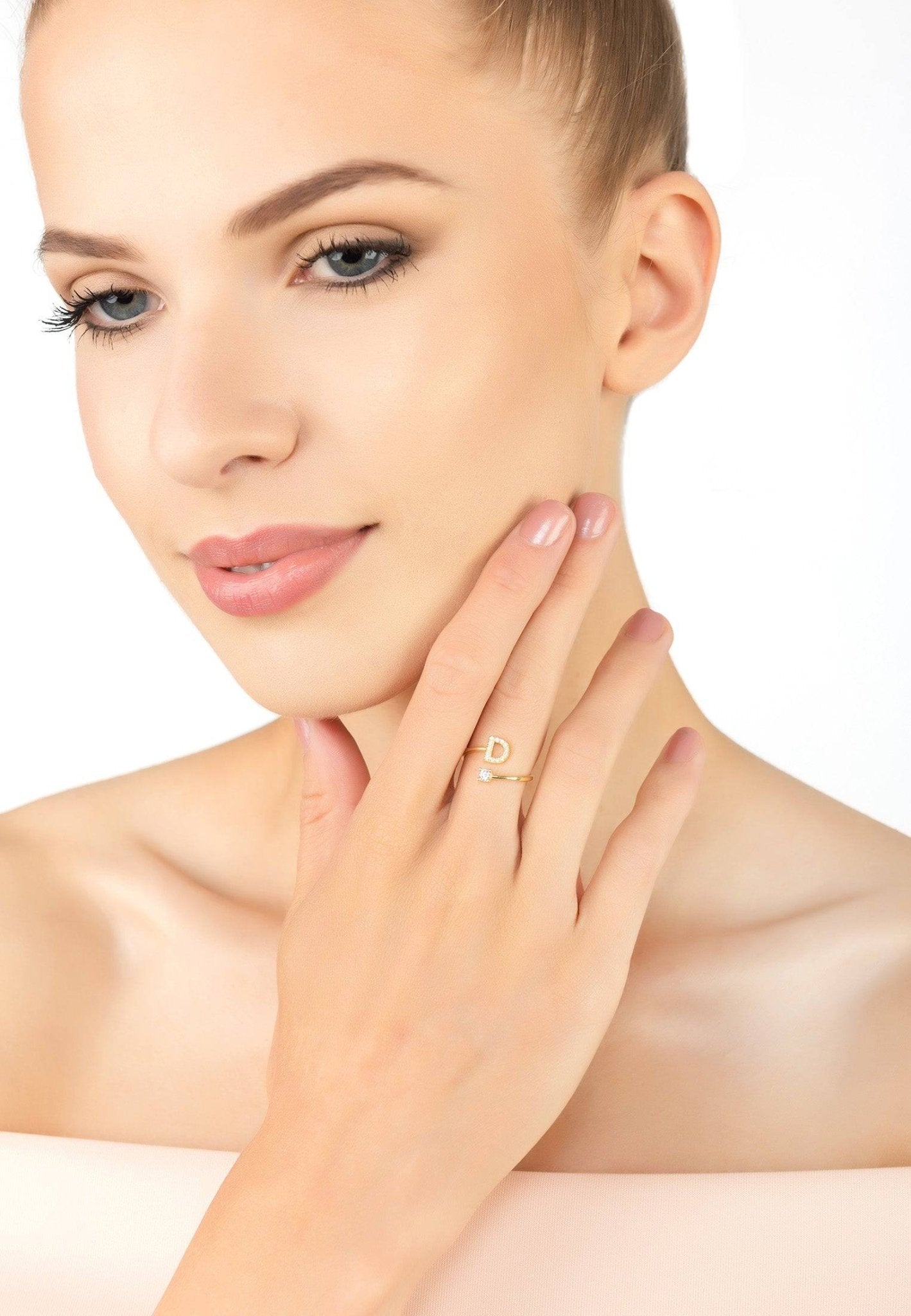 The Initial Ring Gold D is available in one size, which is an average size 6 (M). The open band design allows for slight flexibility, enabling you to gently squeeze or open the band for a better fit. This thoughtful sizing feature ensures that the ring can be comfortably worn by a variety of finger sizes, making it a versatile choice for anyone.