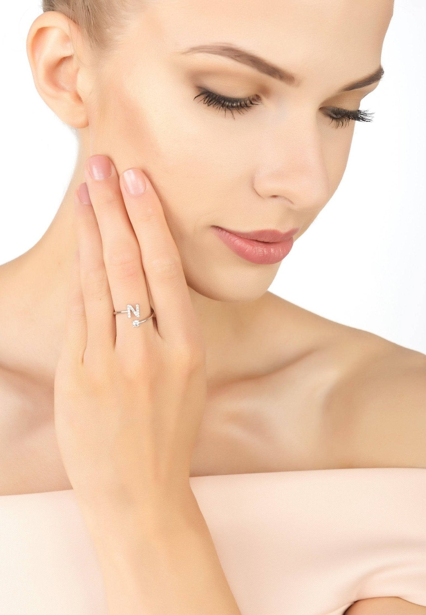 The Initial Ring Silver N features a simple yet striking design. It showcases an open band that allows for slight adjustability in sizing, ensuring a comfortable fit for various finger sizes. The opening is strategically placed on top of your finger, where your zircon adorned monogram sits on one side, complemented by a single larger cubic zirconia on the other side. This thoughtful design not only enhances the ring's aesthetic appeal but also adds a personal touch that makes it truly unique.