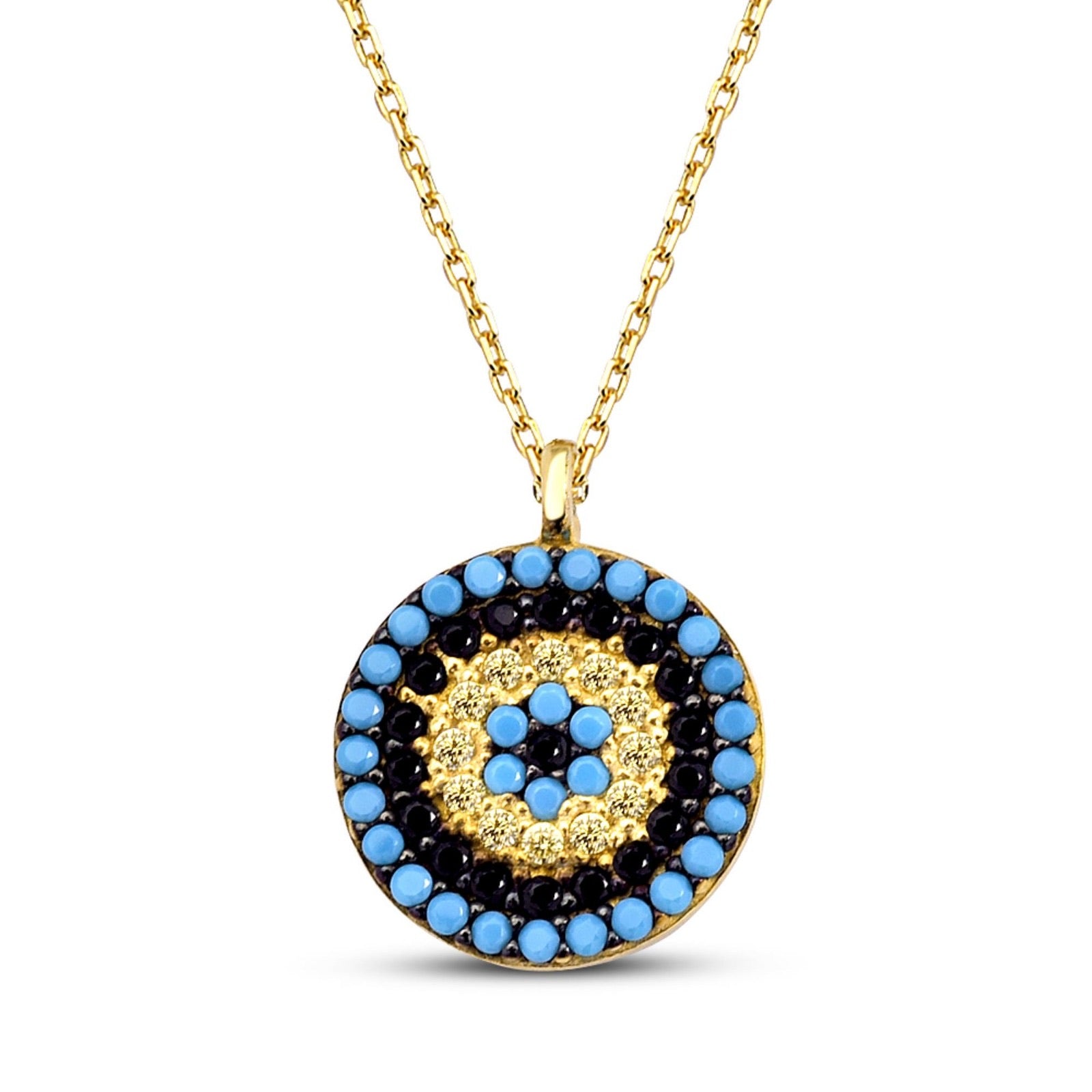 IRENE Necklace featuring a dainty evil eye design with nano turquoise and cubic zirconia on a 925 sterling silver chain with yellow gold plating.