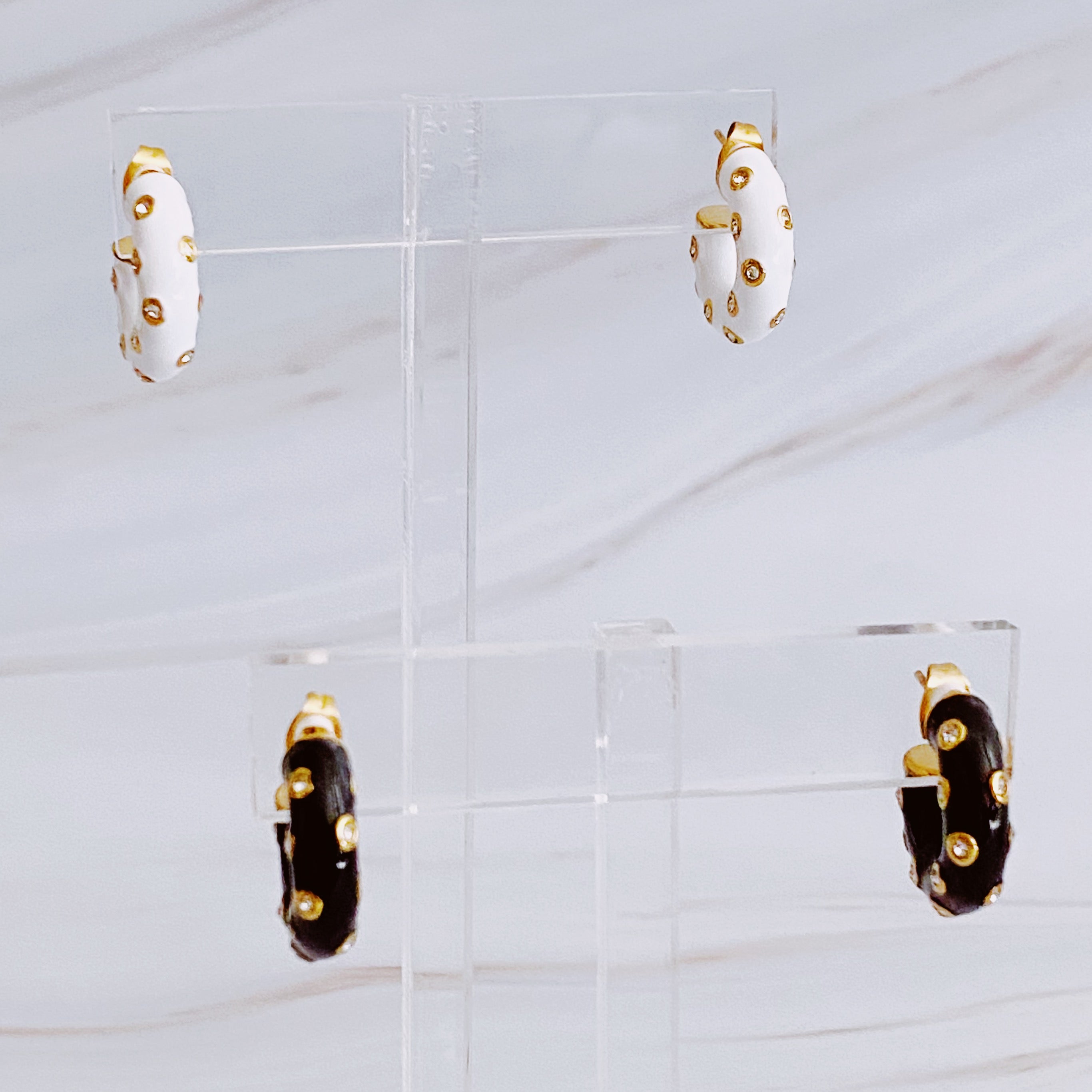 These earrings are made from 18k gold plated stainless steel, ensuring durability and a luxurious finish. The enamel coating adds a vibrant touch, while the sparkling cubic zirconia stones provide a dazzling effect that catches the light beautifully. Each piece is meticulously crafted to ensure that you receive a product that meets the highest standards of quality.