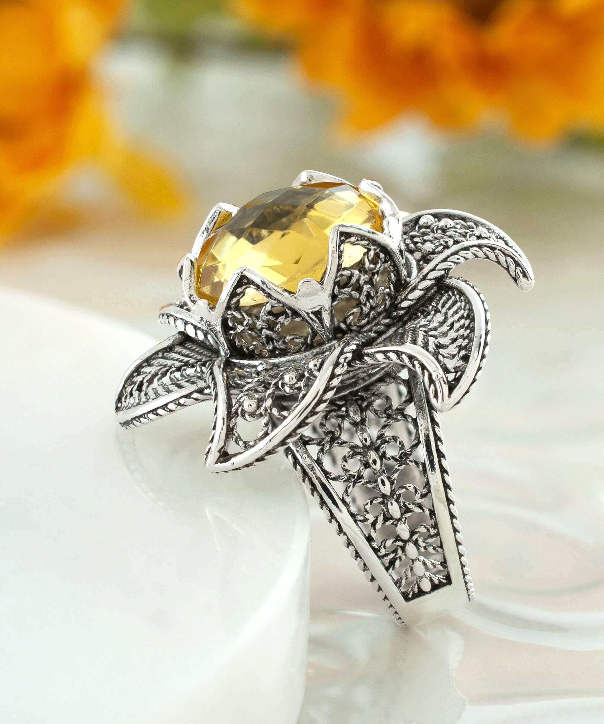 Filigree art is a traditional technique that involves creating intricate designs using delicate metal strands. This art form has its origins in ancient civilizations, including Mesopotamia and Anatolia. The skillful craftsmanship involved in filigree work results in stunning pieces that showcase a blend of historical artistry and modern design. The Lotus Flower Citrine Gemstone Ring is a perfect example of this beautiful art form.