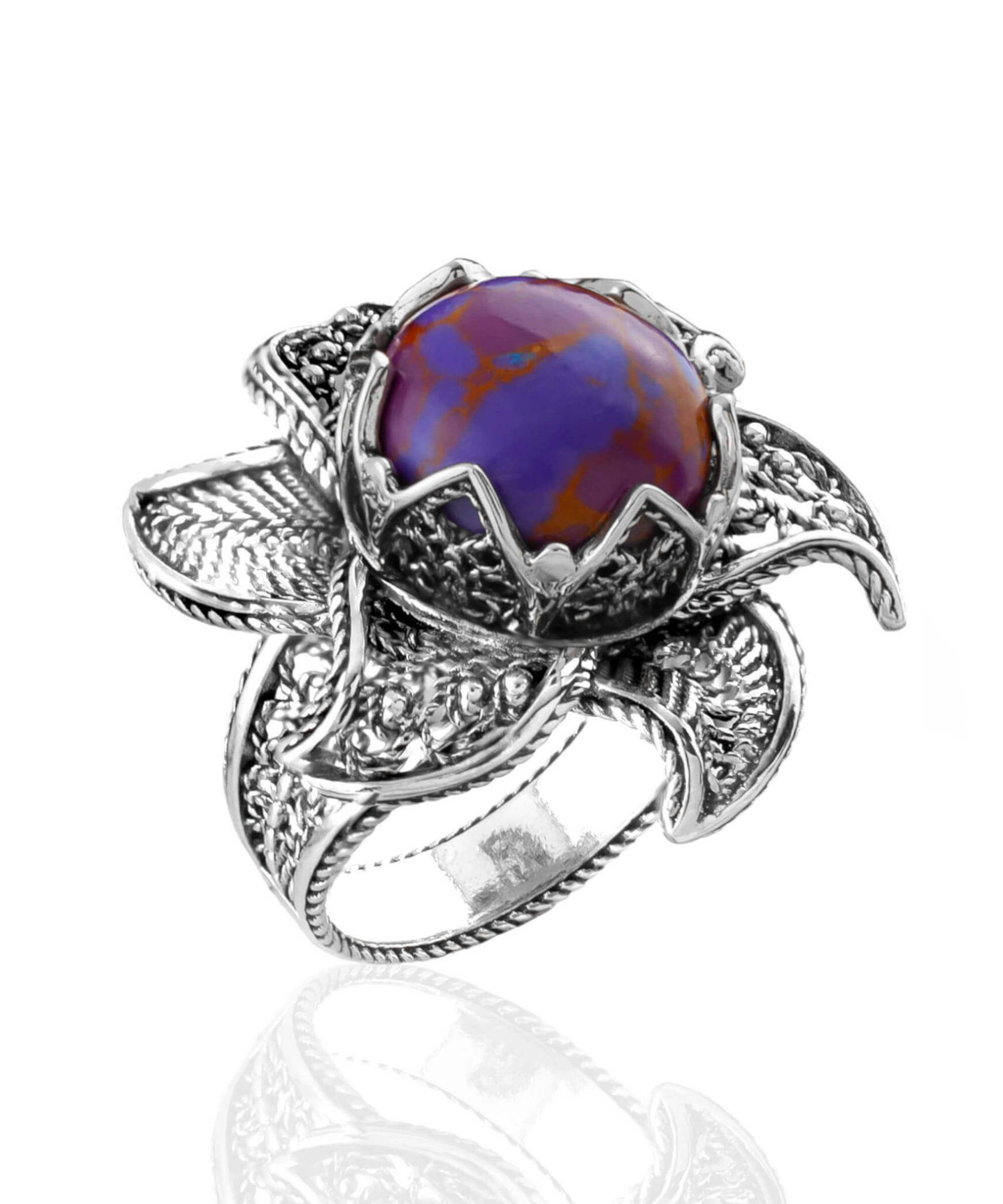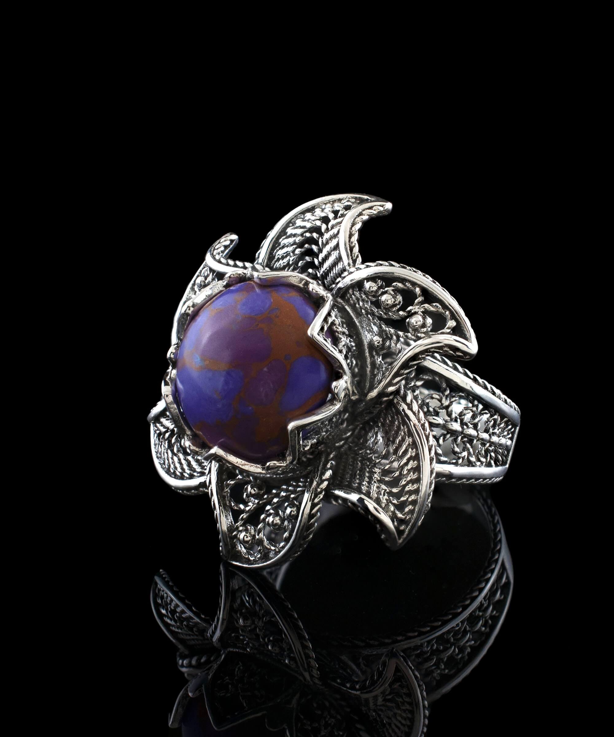 The ring features an intricate filigree art lotus flower design that is both oxidized and highly polished. This combination of finishes adds depth and character to the ring, making it a standout piece in any jewelry collection. The filigree technique, which involves delicate metal strands, has its roots in ancient art forms, providing a rich history and cultural significance to the design. The lotus flower symbolizes purity and beauty, making this ring not only a fashionable choice but also a meaningful one.