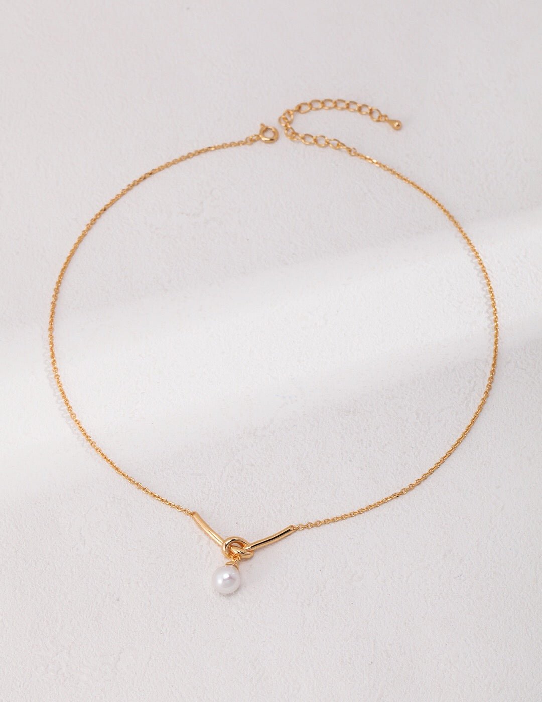 Elegant Love Knot Drop Pearl Necklace featuring natural pearls and gold vermeil, displayed on a soft fabric background.