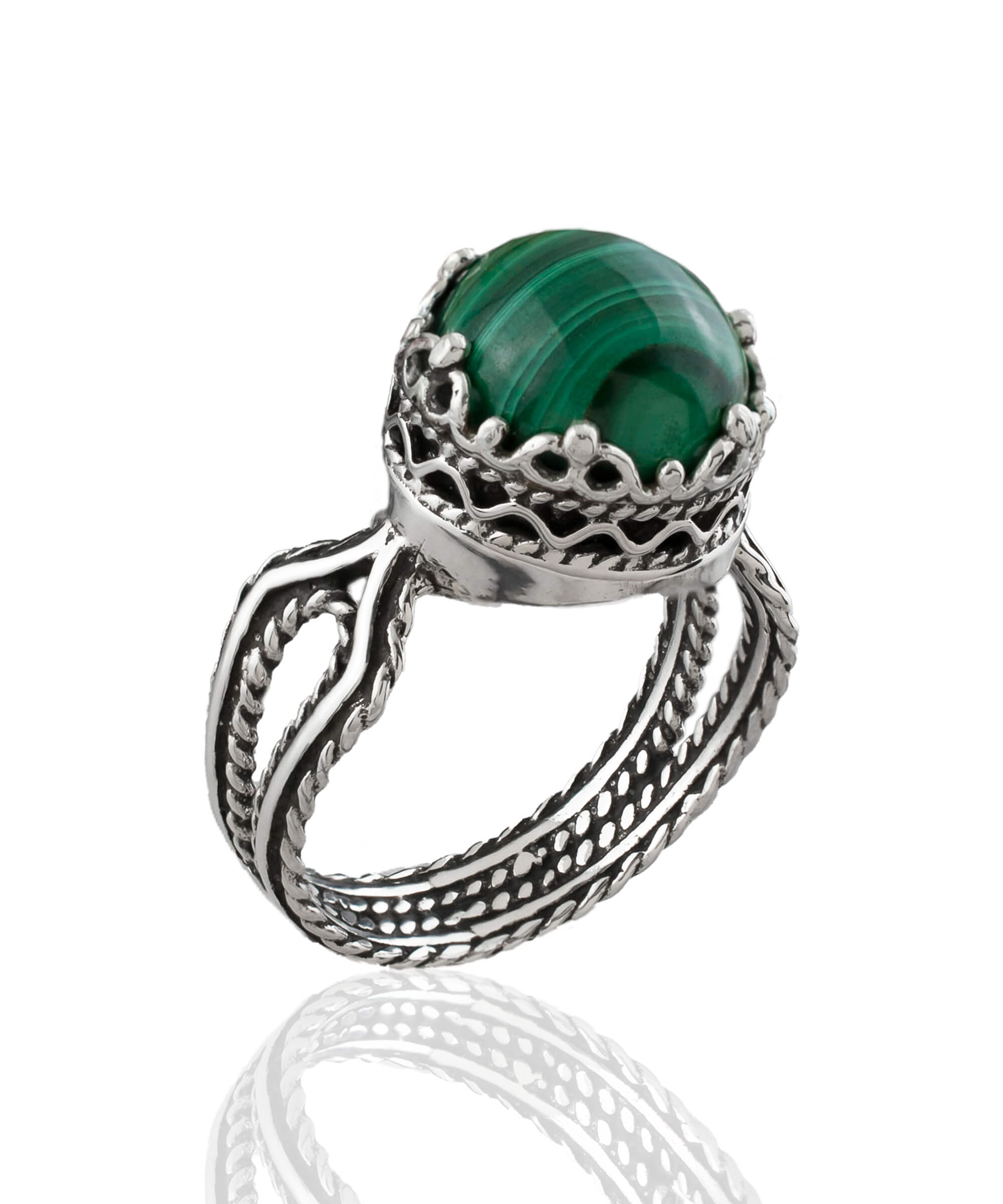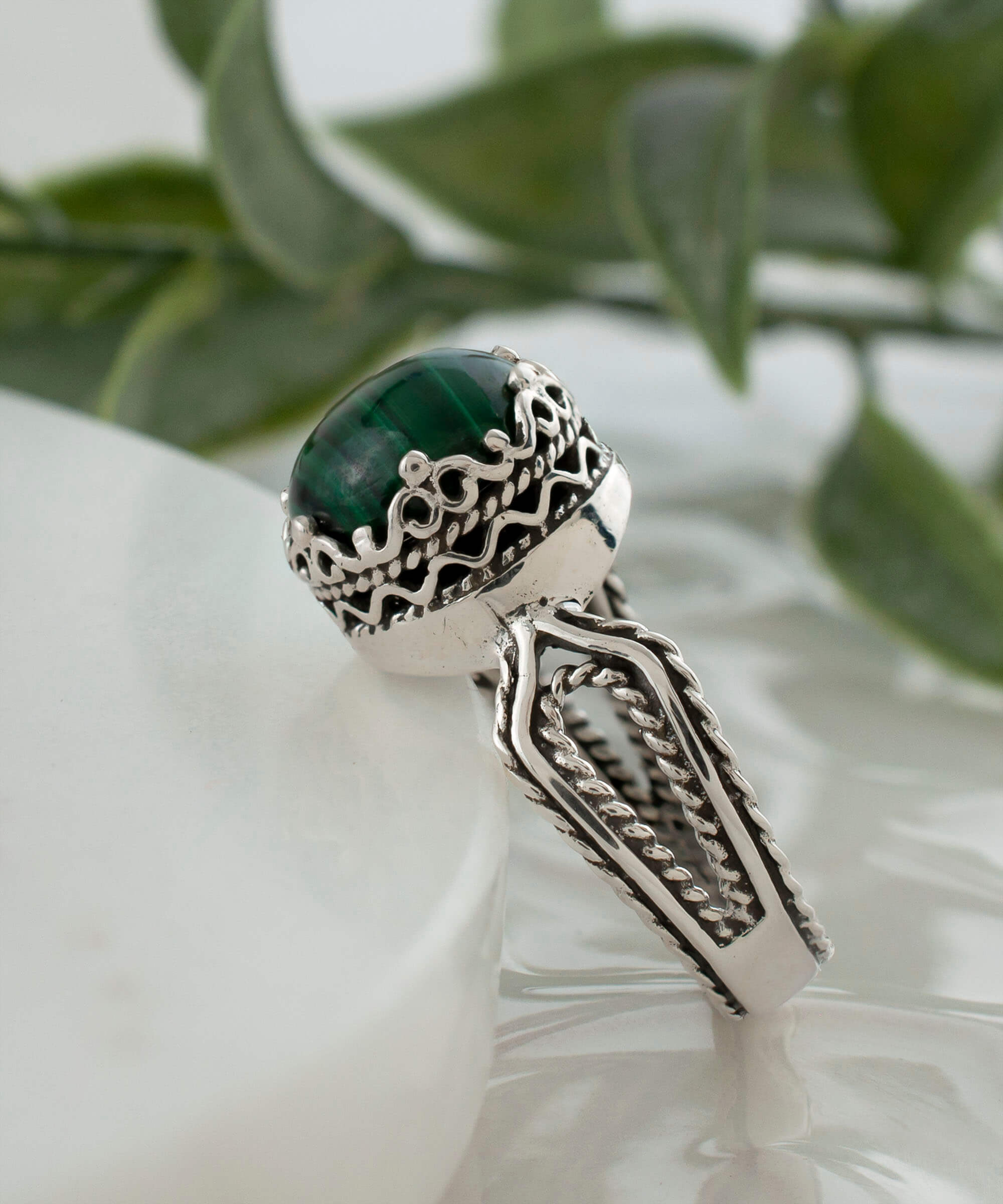 Malachite is a beautiful green stone known for its rich color and unique banding patterns. This gemstone has been cherished for centuries, not only for its aesthetic appeal but also for its believed metaphysical properties. It is said to promote emotional healing and transformation, making it a meaningful choice for jewelry. The cabochon round cut of the malachite gemstone in this ring enhances its natural beauty, allowing the intricate patterns to shine through.