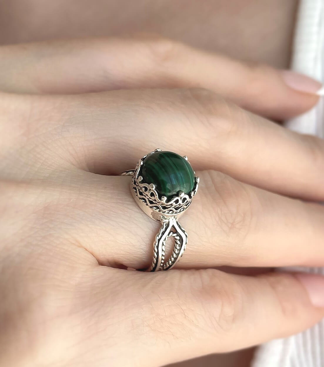In summary, the Malachite Gemstone Filigree Art Women Sterling Silver Cocktail Ring is a stunning piece that combines elegance, artistry, and versatility. With its beautiful malachite gemstone, intricate filigree design, and thoughtful packaging, it makes for a perfect addition to any jewelry collection or a thoughtful gift for a loved one.