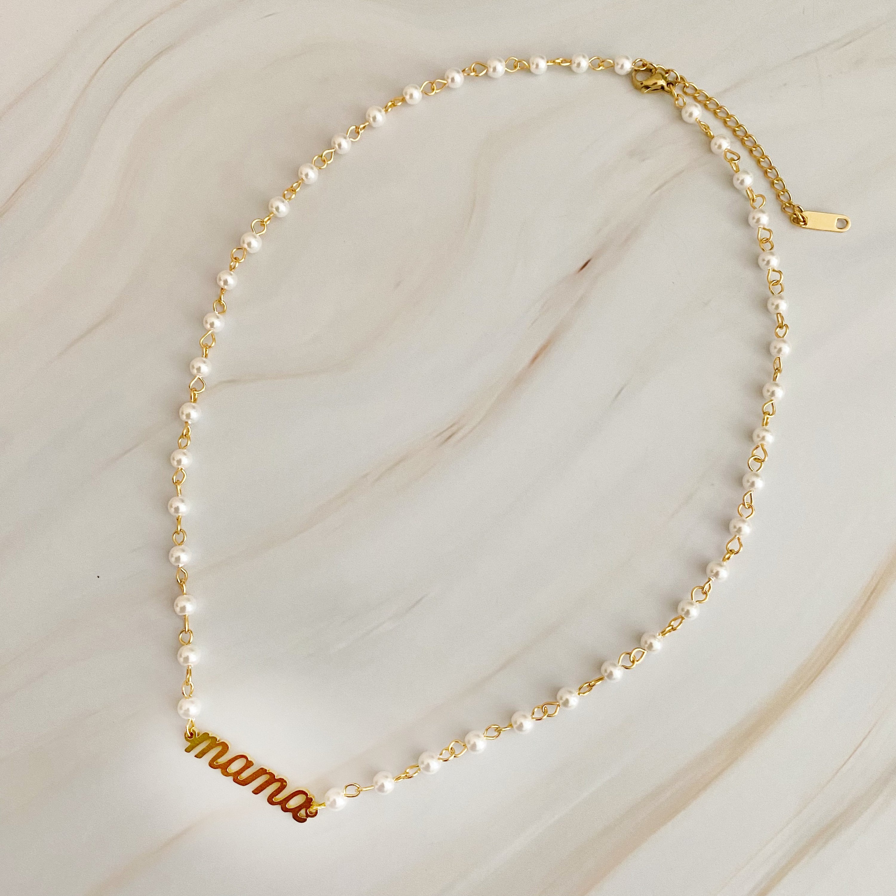 Mama Pearl Chain Necklace featuring a pearl chain and scripted MAMA cutout pendant, elegantly designed for stylish moms.