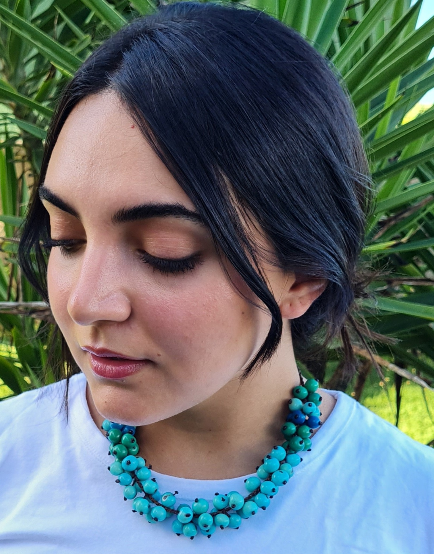 The Maria Acai Crochet Necklace - Blue is a stunning and unique accessory that combines style with sustainability. This necklace is perfect for everyday wear, adding a touch of fun and elegance to any outfit. The chain is intricately crocheted, and the acai seeds are carefully attached in little bunches, resembling the fruit itself. This design not only makes the necklace visually appealing but also highlights the natural beauty of the materials used.