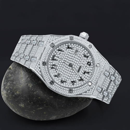 The MAVERICK STEEL WATCH features a fully bling metal design that radiates luxury. The sparkling cubic zirconia stones are meticulously set to enhance the watch's overall aesthetic, making it a perfect gift for loved ones or a treat for yourself. The watch's dial showcases hour markers in Urdu digits, adding a unique cultural touch that sets it apart from other timepieces.