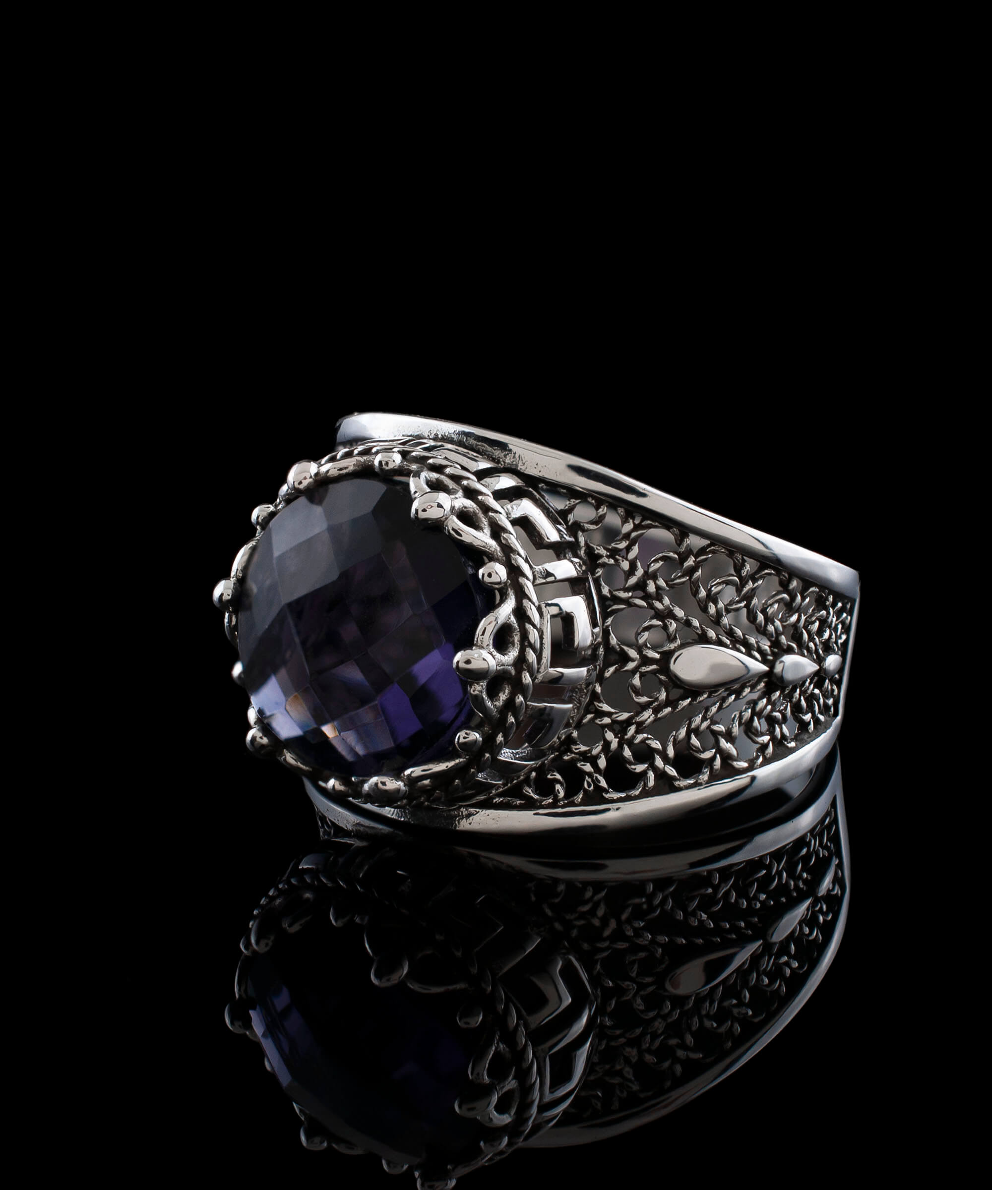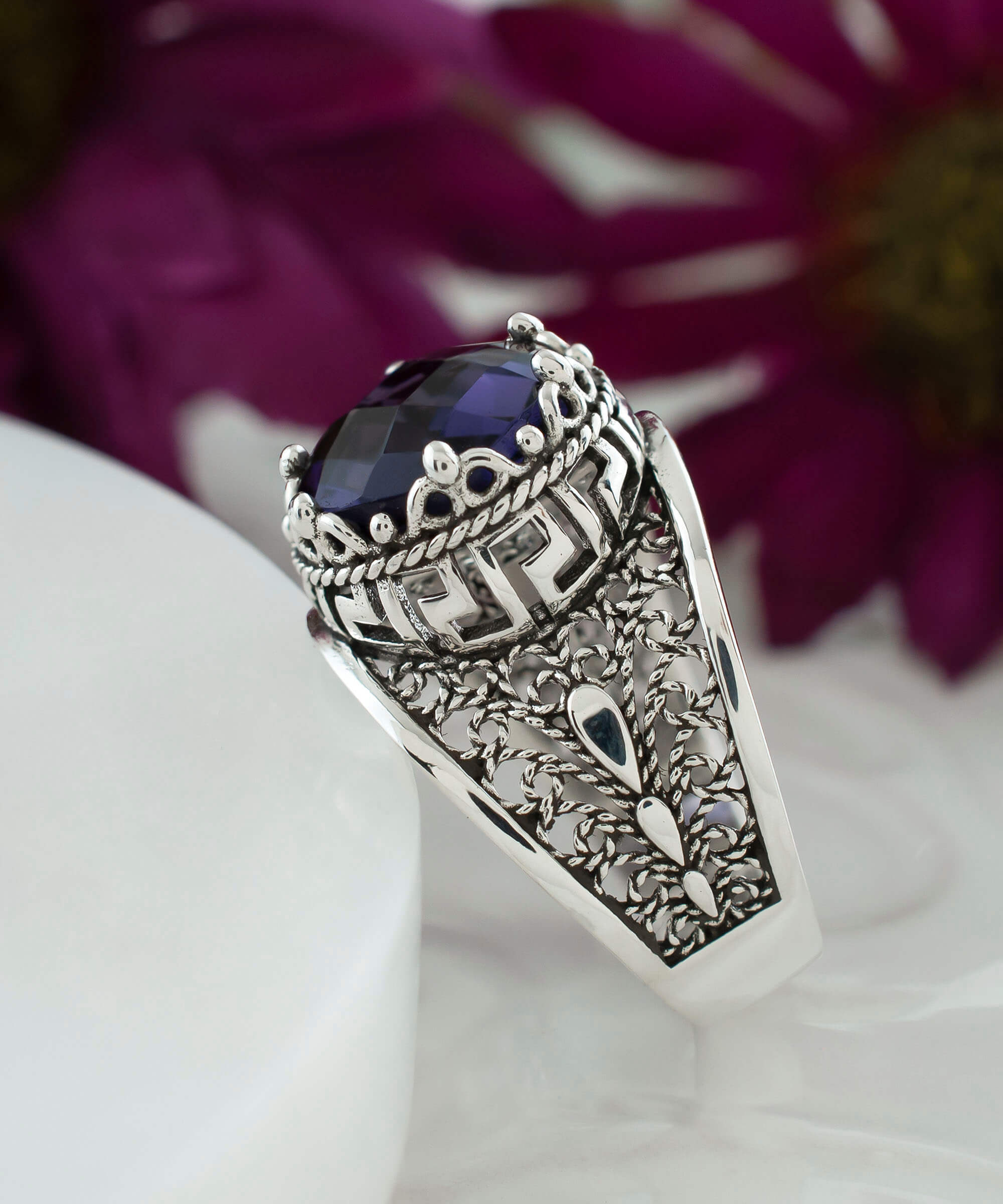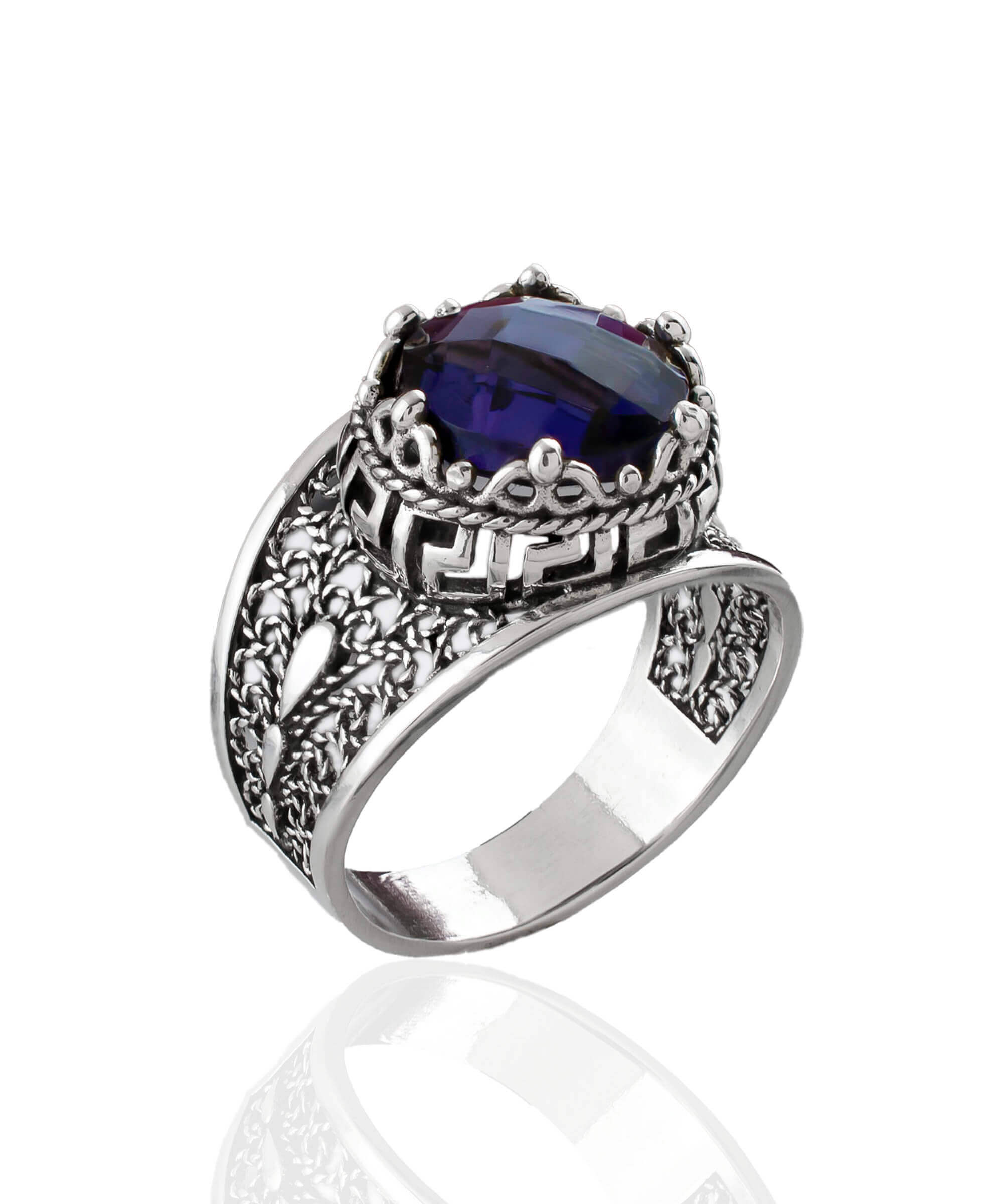 Introducing the exquisite Meander Pattern Filigree Art Amethyst Gemstone Women Silver Cocktail Ring, a stunning piece that combines elegance and artistry. This ring is crafted from high-quality 925 sterling silver, ensuring durability and a luxurious finish. The intricate lace embroidery design features a Greek Key pattern, making it a unique addition to any jewelry collection. The centerpiece of this beautiful ring is a double-sided faceted amethyst gemstone, measuring 10 mm and showcasing a checkerboard round-cut that sparkles brilliantly in the light.