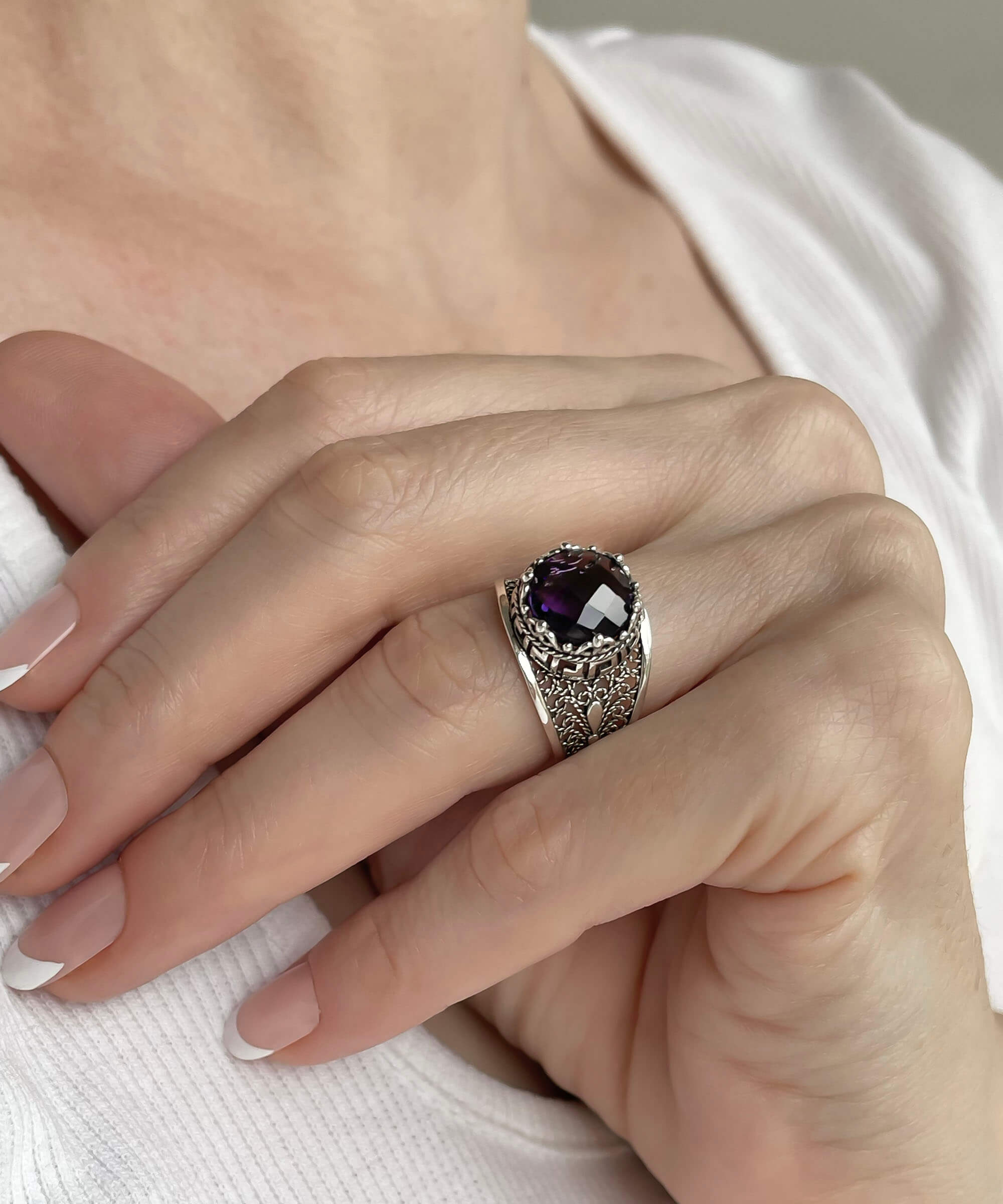 In summary, the Meander Pattern Filigree Art Amethyst Gemstone Women Silver Cocktail Ring is a remarkable piece of jewelry that combines elegance, artistry, and versatility. With its stunning design, genuine amethyst gemstone, and luxurious packaging, it is the perfect gift for yourself or a loved one. Experience the beauty of filigree art and the allure of amethyst with this exquisite cocktail ring.