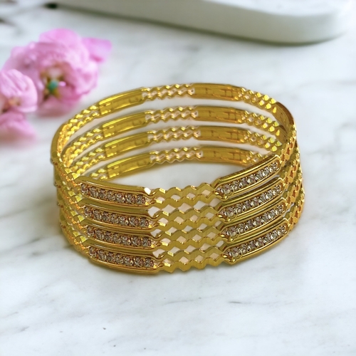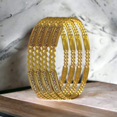 Gold-plated bangles are often adorned with intricate designs, including traditional motifs such as paisleys, flowers, and geometric patterns. They are frequently embellished with gemstones, enamel work, or delicate filigree, making them versatile for both daily wear and special occasions. Their lightweight nature and affordable price make them popular among a broad range of people, from those seeking elegant accessories for everyday wear to those looking to complement their festive attire.