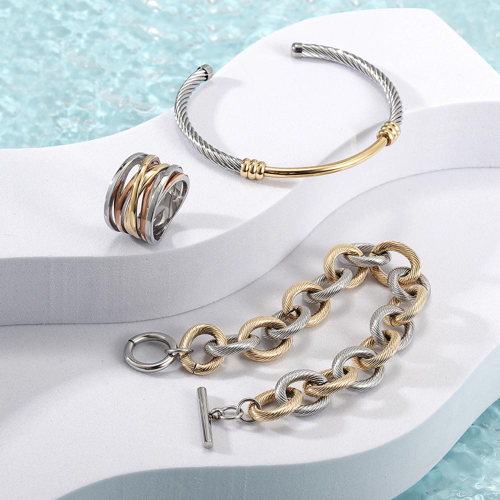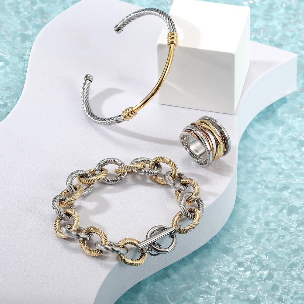 Multi-Color Cable Set featuring a chic bangle, bracelet, and ring in a two-tone cable design, elegantly displayed in a gift box.